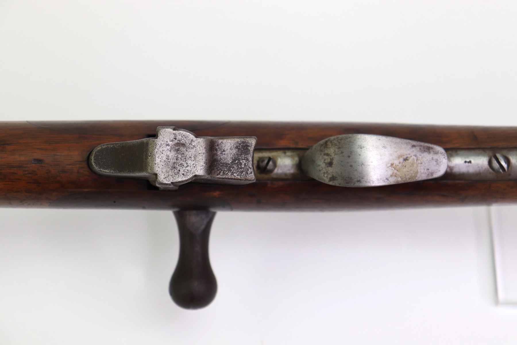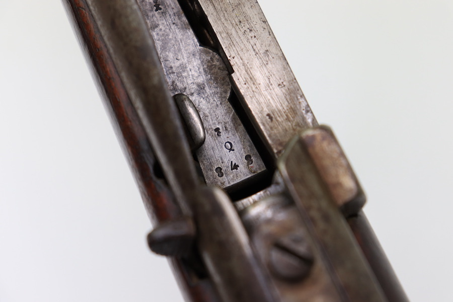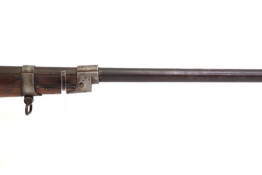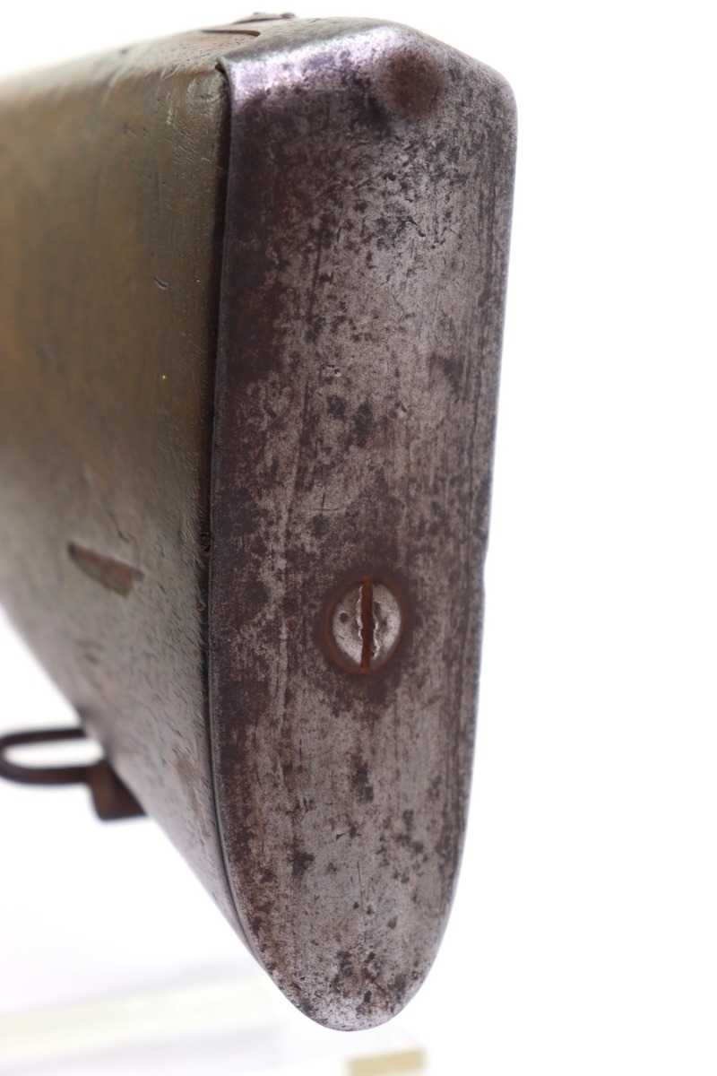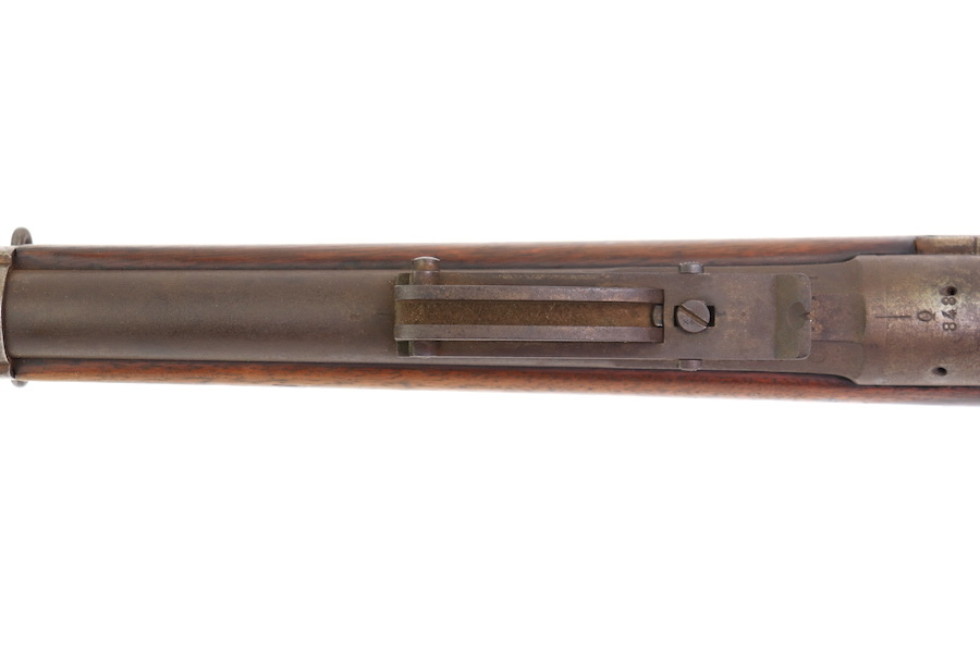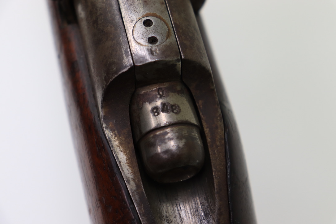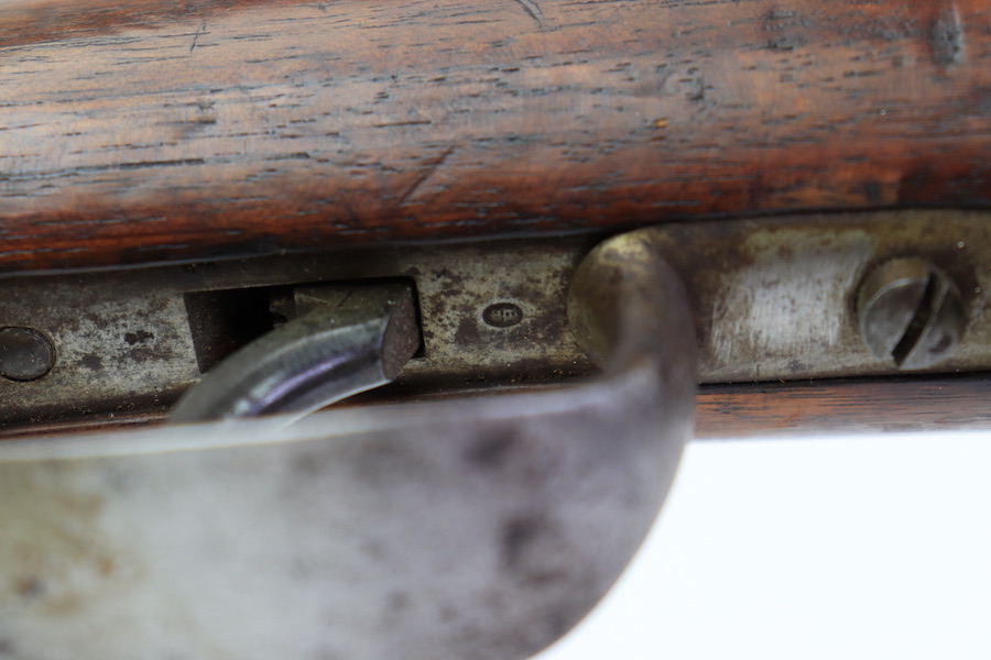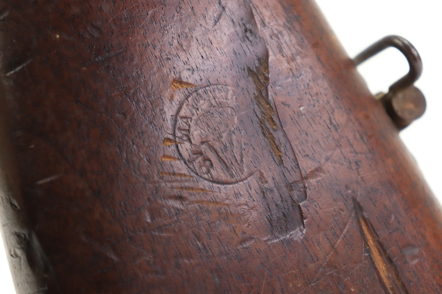 8/24/23 – This is an original Dutch Beaumont rifle Model 1871/88. A heavy patina is present down the length of the barrel, as well as most of the action and magazine. There’s no rust or pitting despite this patina, with the exception of the front sight blade. The bore rates 7.5/10 with strong rifling considering age; however, the bore does suffer from pitting, likely due to corrosive ammo. All moving parts function as they should, and there is a magazine disconnect on the left side of the gun. Two things to note: there is a screw missing from the outermost barrel band, and two good size gouges are on the right side of the stock near the butt plate. The gun is all matching, including the bolt, barrel, and magazine follower.