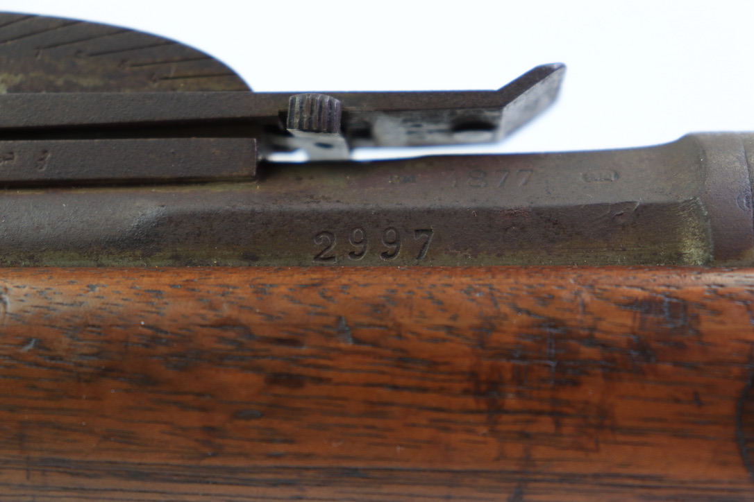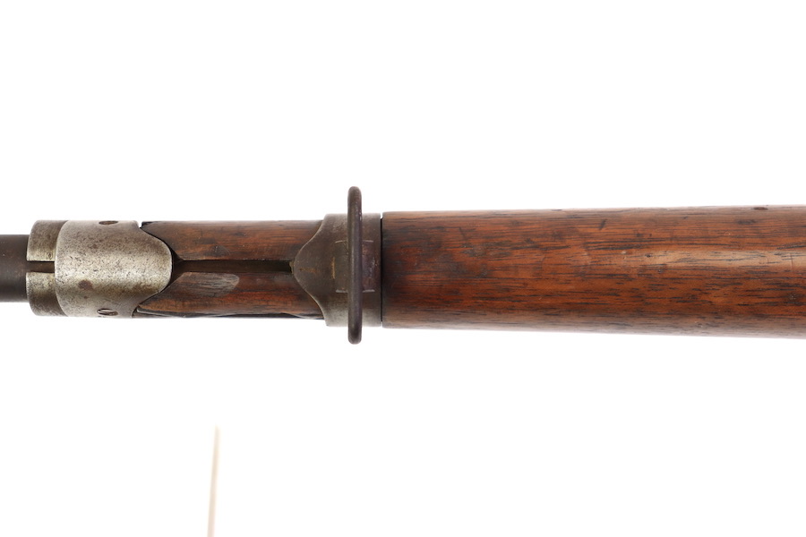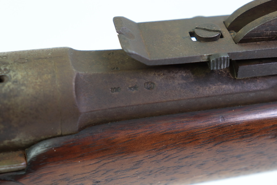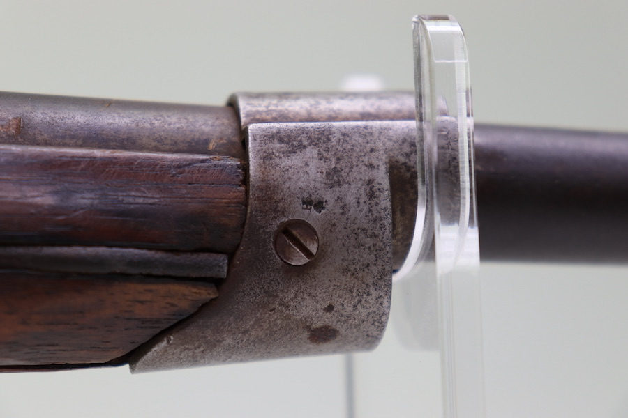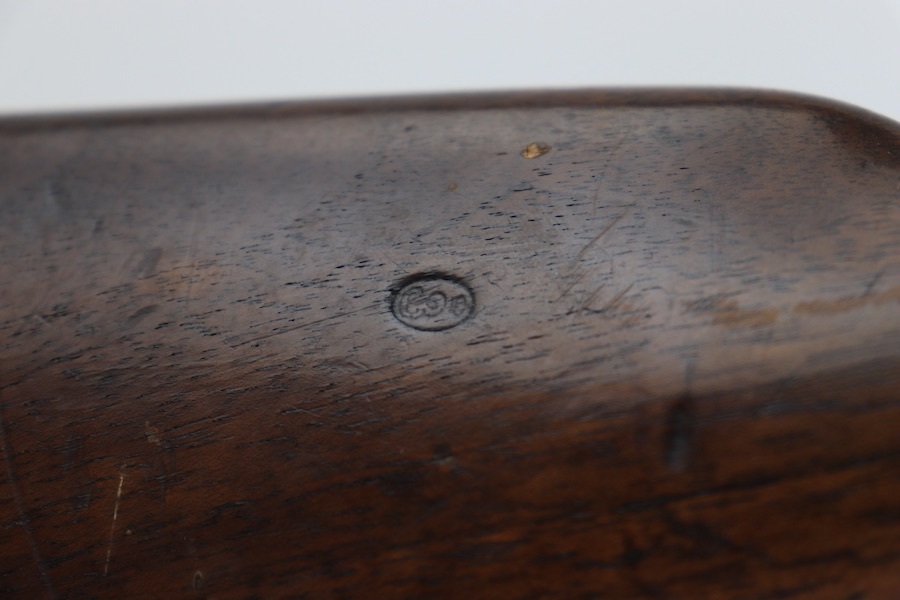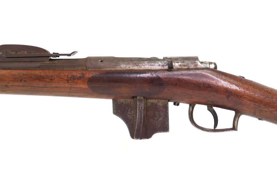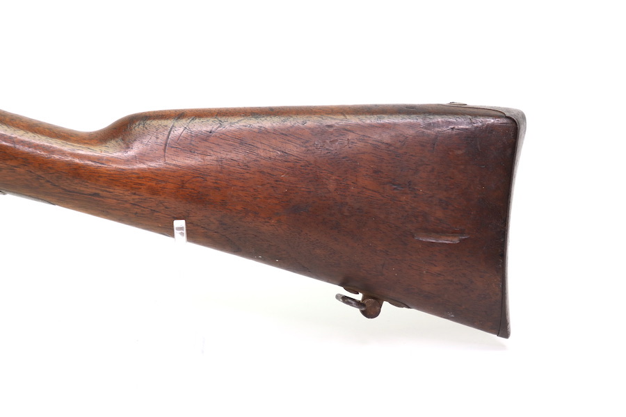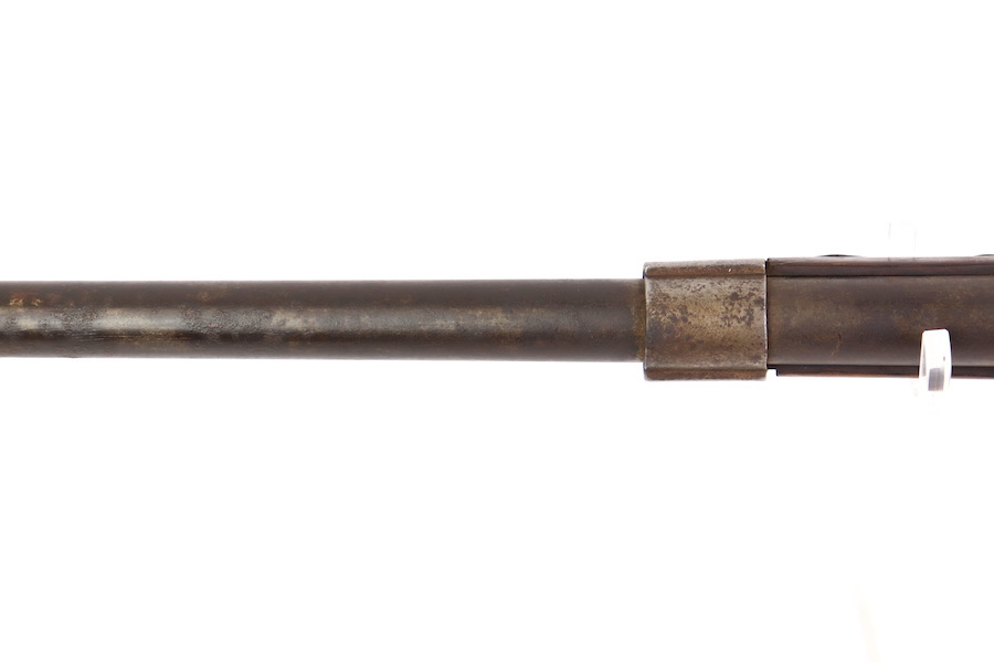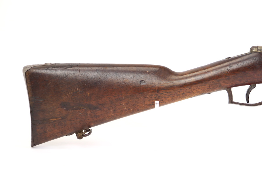 8/24/23 – This is an original Dutch Beaumont rifle Model 1871/88. A heavy patina is present down the length of the barrel, as well as most of the action and magazine. There’s no rust or pitting despite this patina, with the exception of the front sight blade. The bore rates 7.5/10 with strong rifling considering age; however, the bore does suffer from pitting, likely due to corrosive ammo. All moving parts function as they should, and there is a magazine disconnect on the left side of the gun. Two things to note: there is a screw missing from the outermost barrel band, and two good size gouges are on the right side of the stock near the butt plate. The gun is all matching, including the bolt, barrel, and magazine follower.