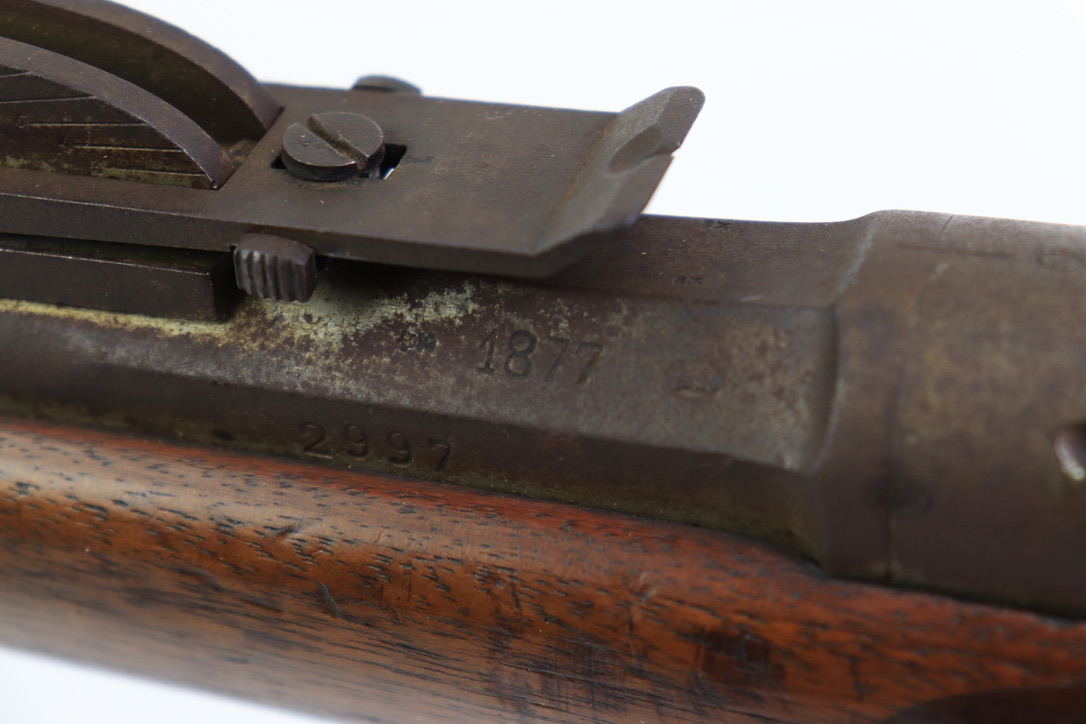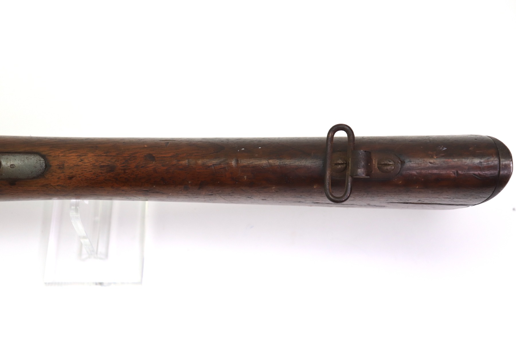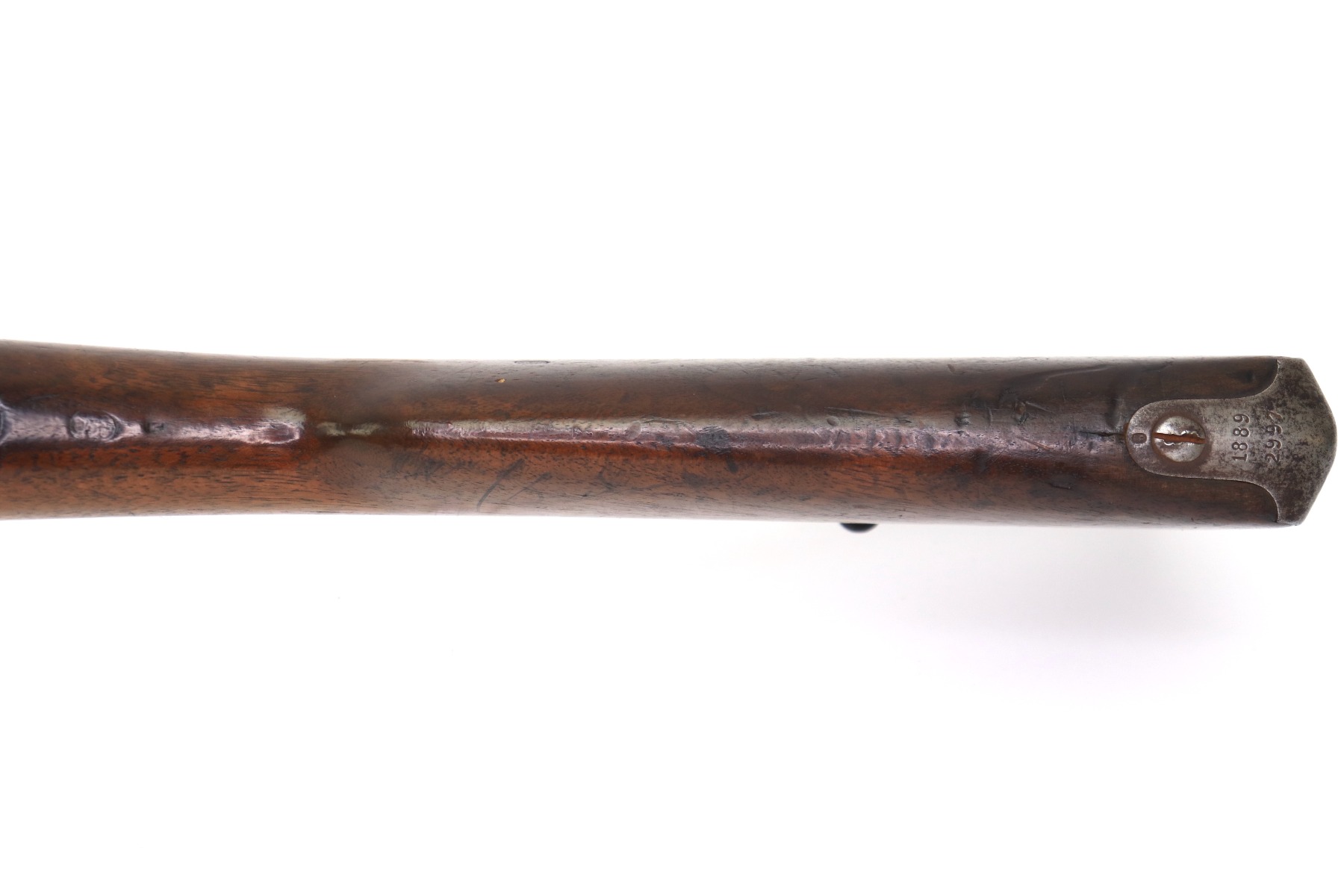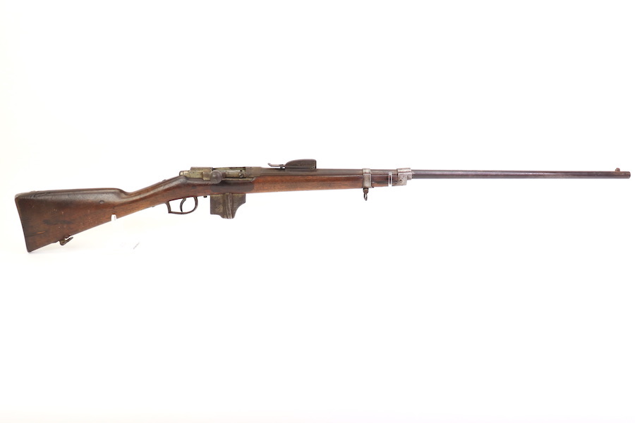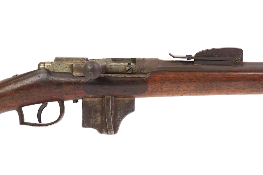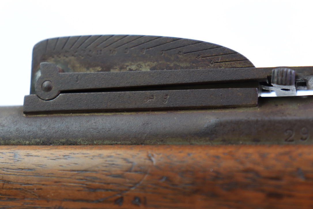 8/24/23 – This is an original Dutch Beaumont rifle Model 1871/88. A heavy patina is present down the length of the barrel, as well as most of the action and magazine. There’s no rust or pitting despite this patina, with the exception of the front sight blade. The bore rates 7.5/10 with strong rifling considering age; however, the bore does suffer from pitting, likely due to corrosive ammo. All moving parts function as they should, and there is a magazine disconnect on the left side of the gun. Two things to note: there is a screw missing from the outermost barrel band, and two good size gouges are on the right side of the stock near the butt plate. The gun is all matching, including the bolt, barrel, and magazine follower.