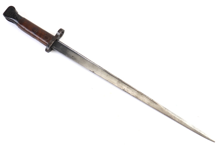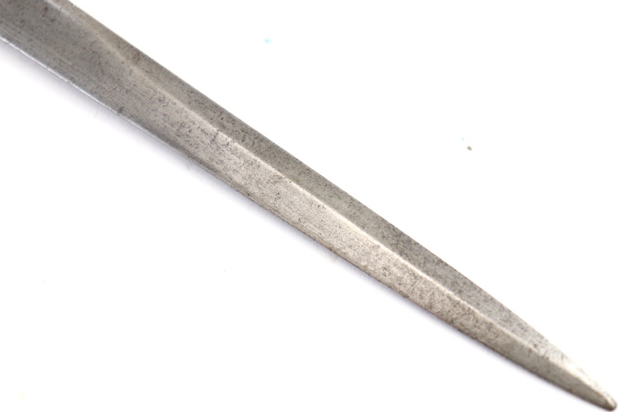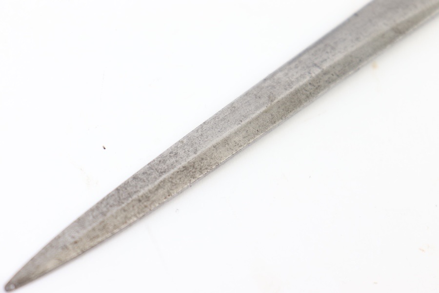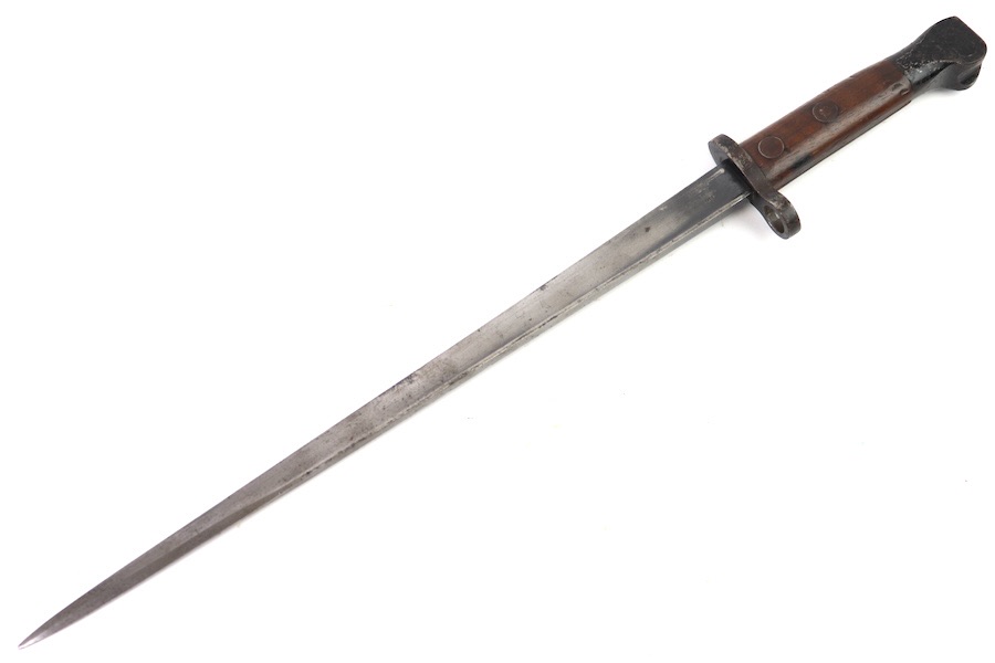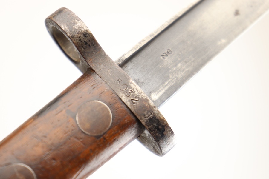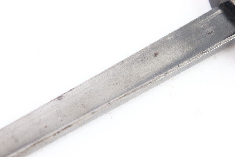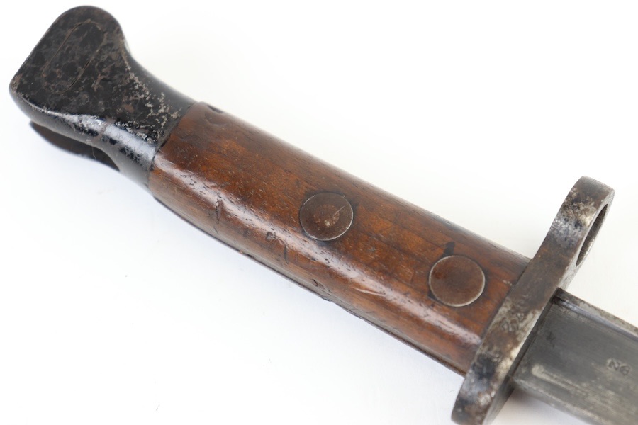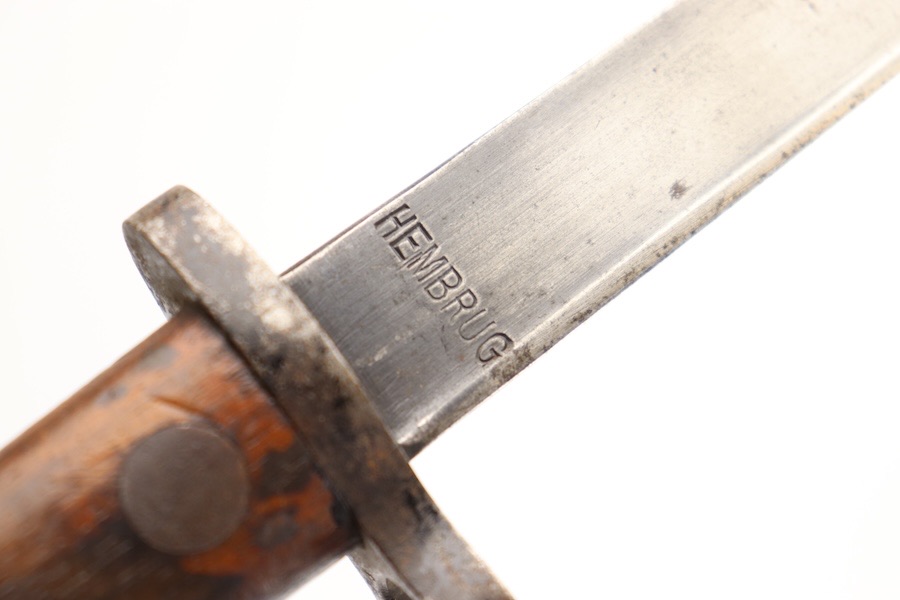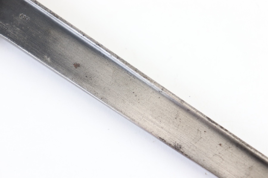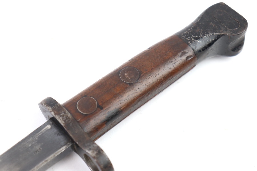 10/3/23 – This is a Great condition Dutch m1895 Mannlicher Bayonet. The blade on both sides has patches of honest wear and natural patina with no rust or pitting. Ricasso has Hembrug stamped on one side, and the other is Crown Z inspector proof. Cross guard and pommel have blotches of black paint, but otherwise no issues. Wood grips have circles stamped into the left side grip with minor chips and some stains from the black paint. No scabbard included.