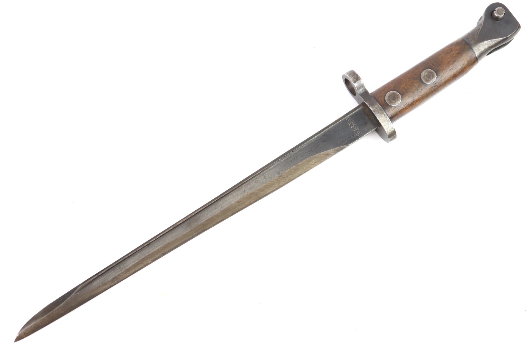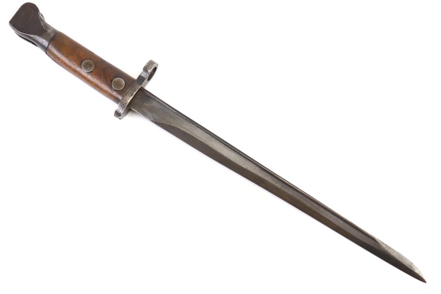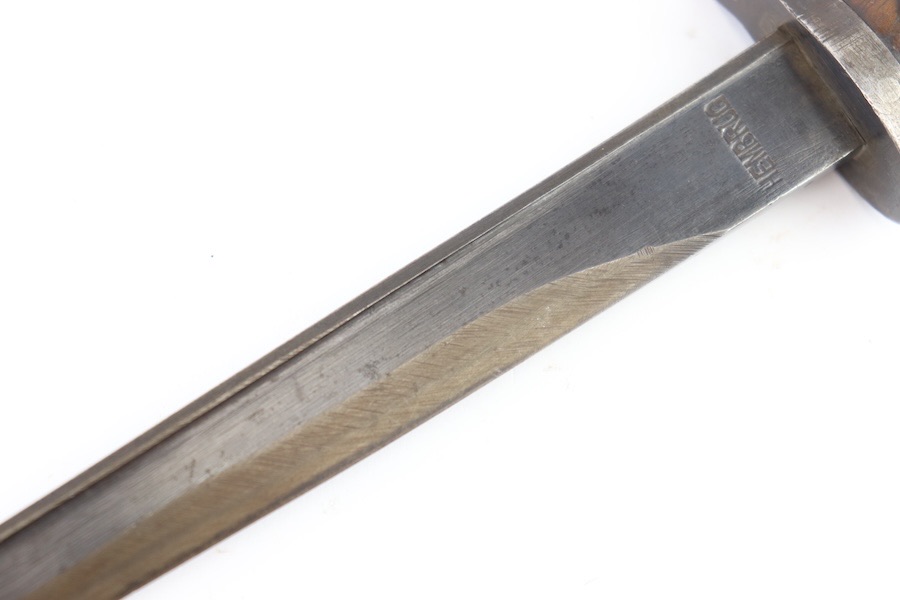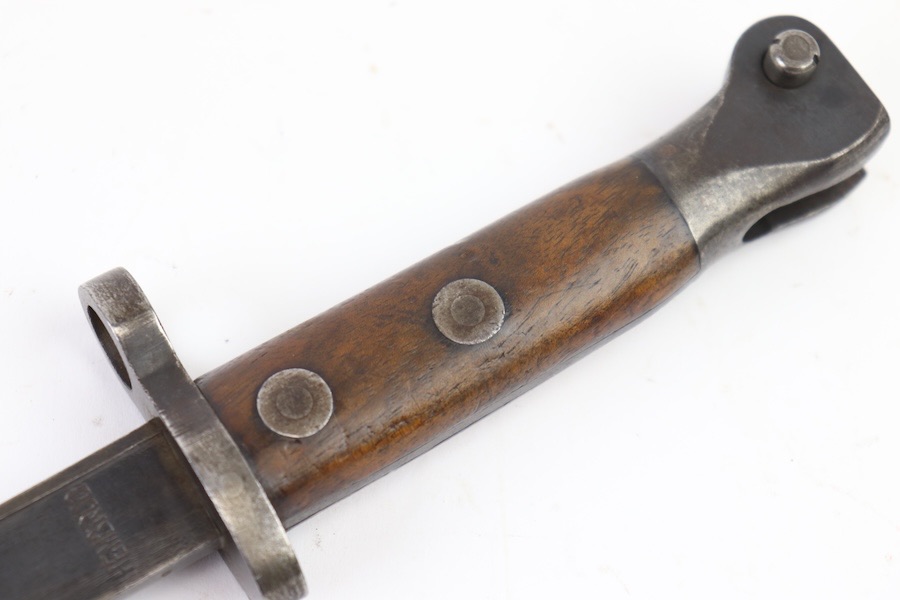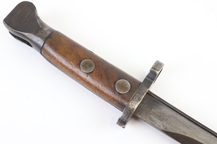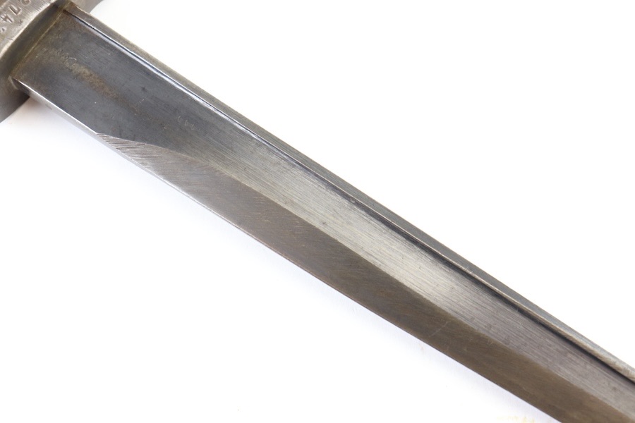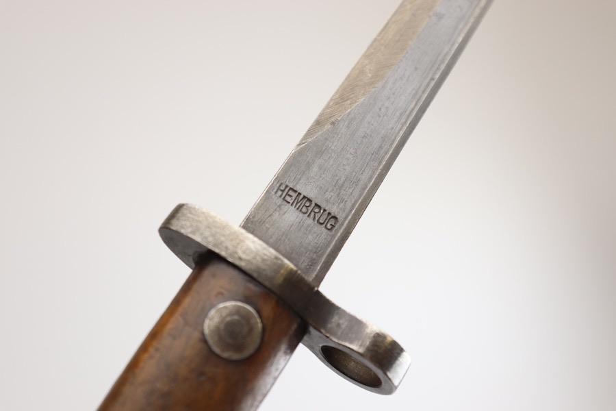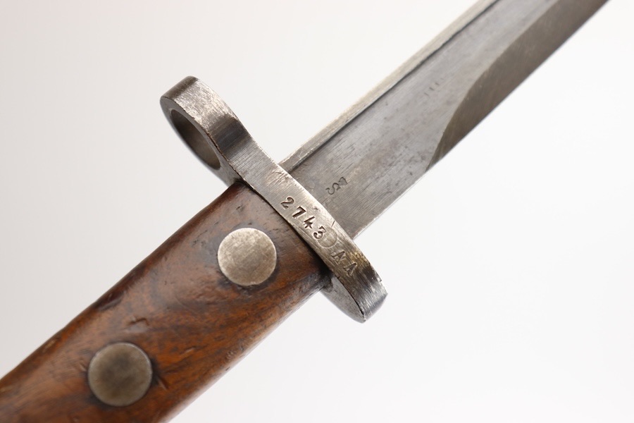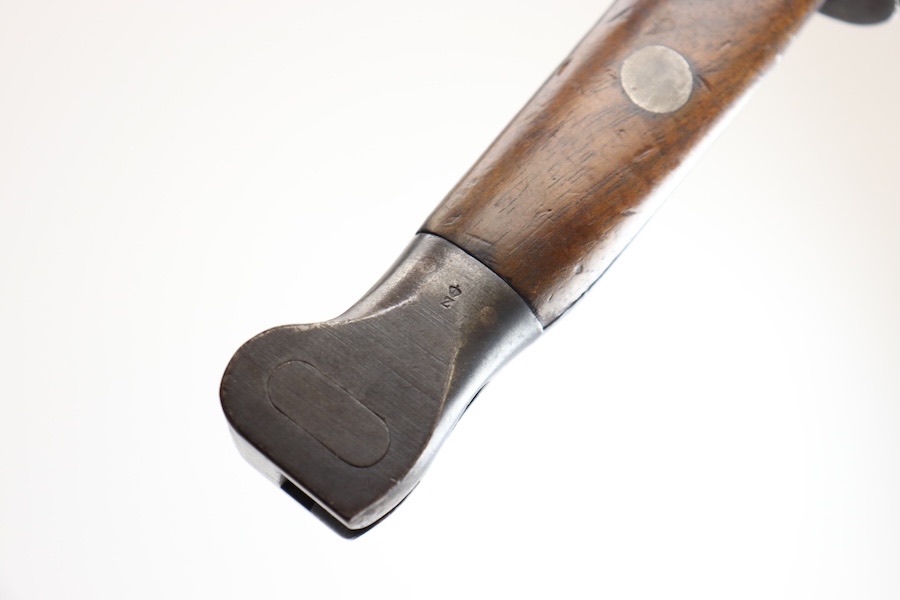 10/13/23 – This is an Original Dutch M1895 infantry bayonet. The blade retains about 70% of its original bluing finish. The edge has not been sharpened. Ricasso has Hembrug stamped with a crown S on the opposite side. The crossguard and pommel have minor finish loss but no major issues. Serial number reads 2743 AA. Wood grips show age with no issues.