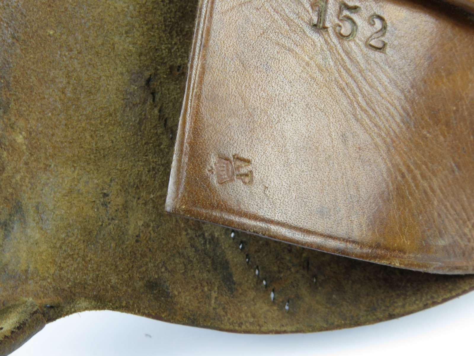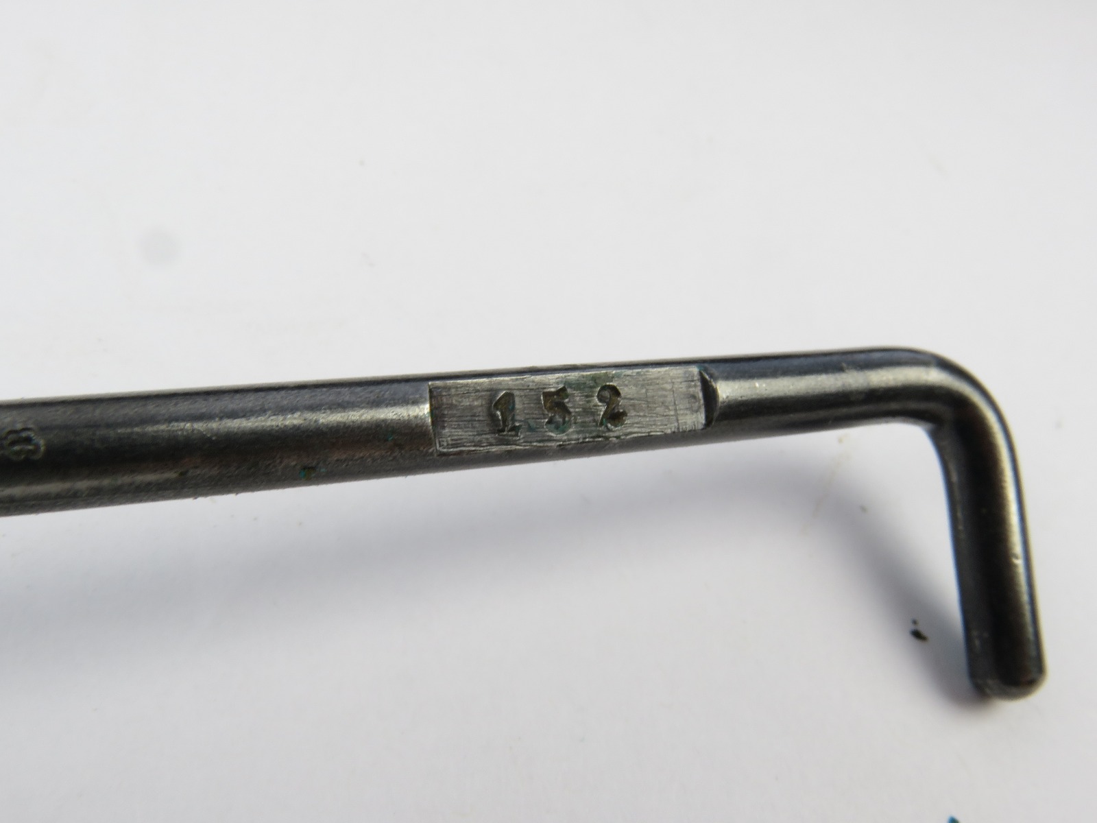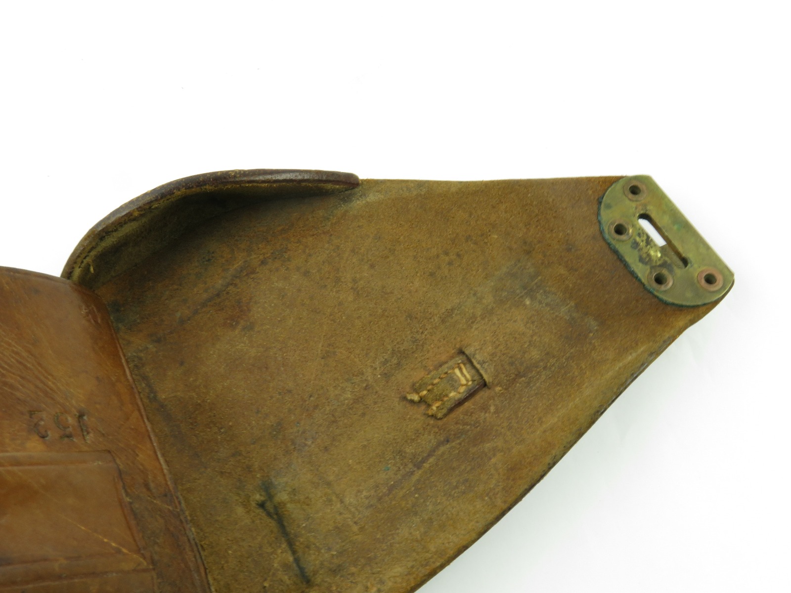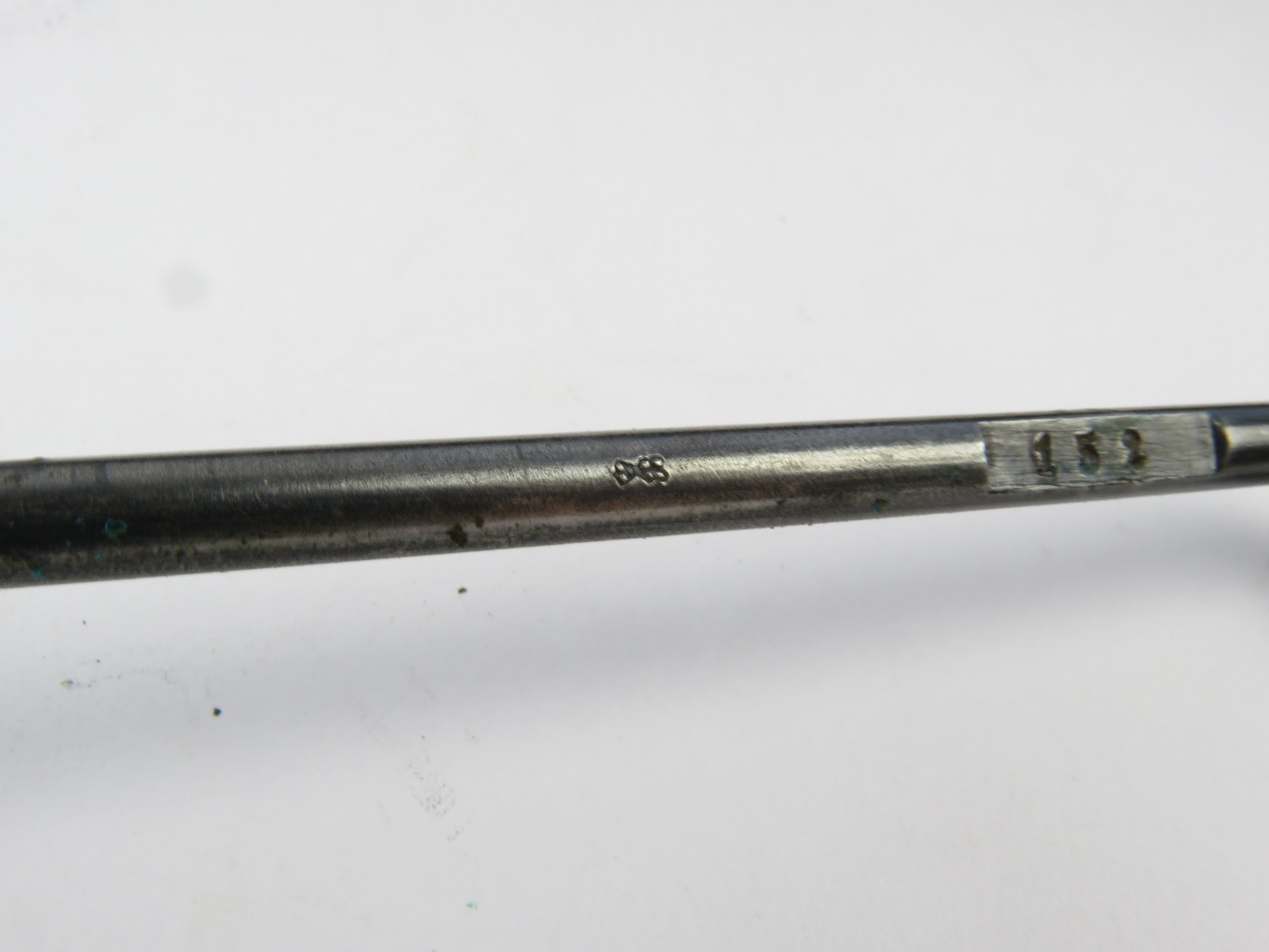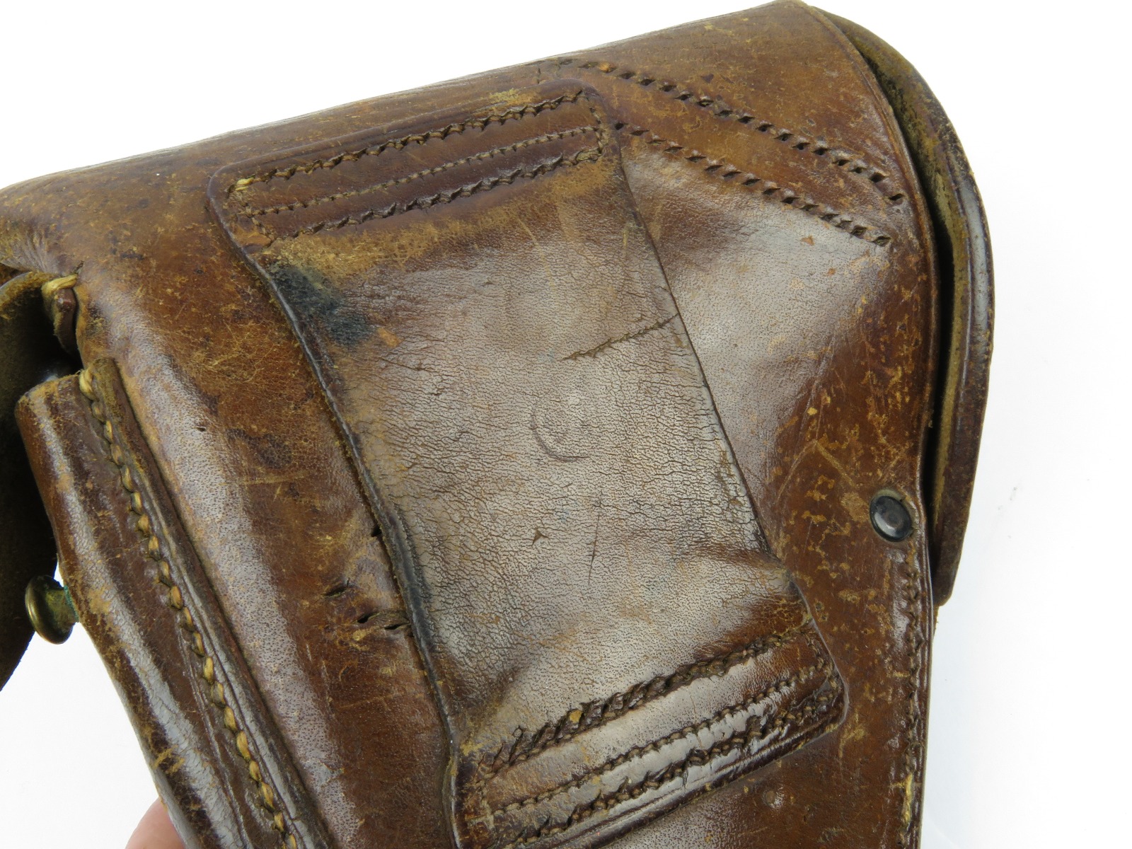 7/17/17 – This is an original WW2 era Dutch made 1922 holster, complete with a matching numbered cleaning rod. The holster is speculated to be used by the Nazi SS, as told on page 193 of Whittington’s book. The holster has also been seen to hold Walther PPKs, but this is definitely made for a 1922. The holster has a few markings on the front leather and interior body of leather. These markings are small Dutch proof stamps, and an interior number stamp. The number stamp on the holster matches the number on the cleaning rod. The cleaning rod is also proof stamped and in great shape. The holster has some stitching holes from a previous modification, but otherwise the holster is excellent. Guaranteed all original and authentic.