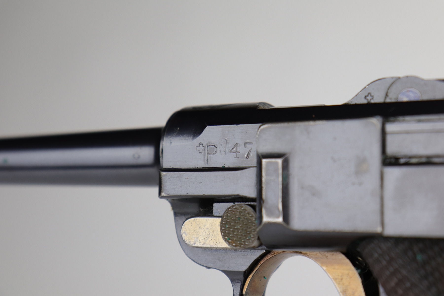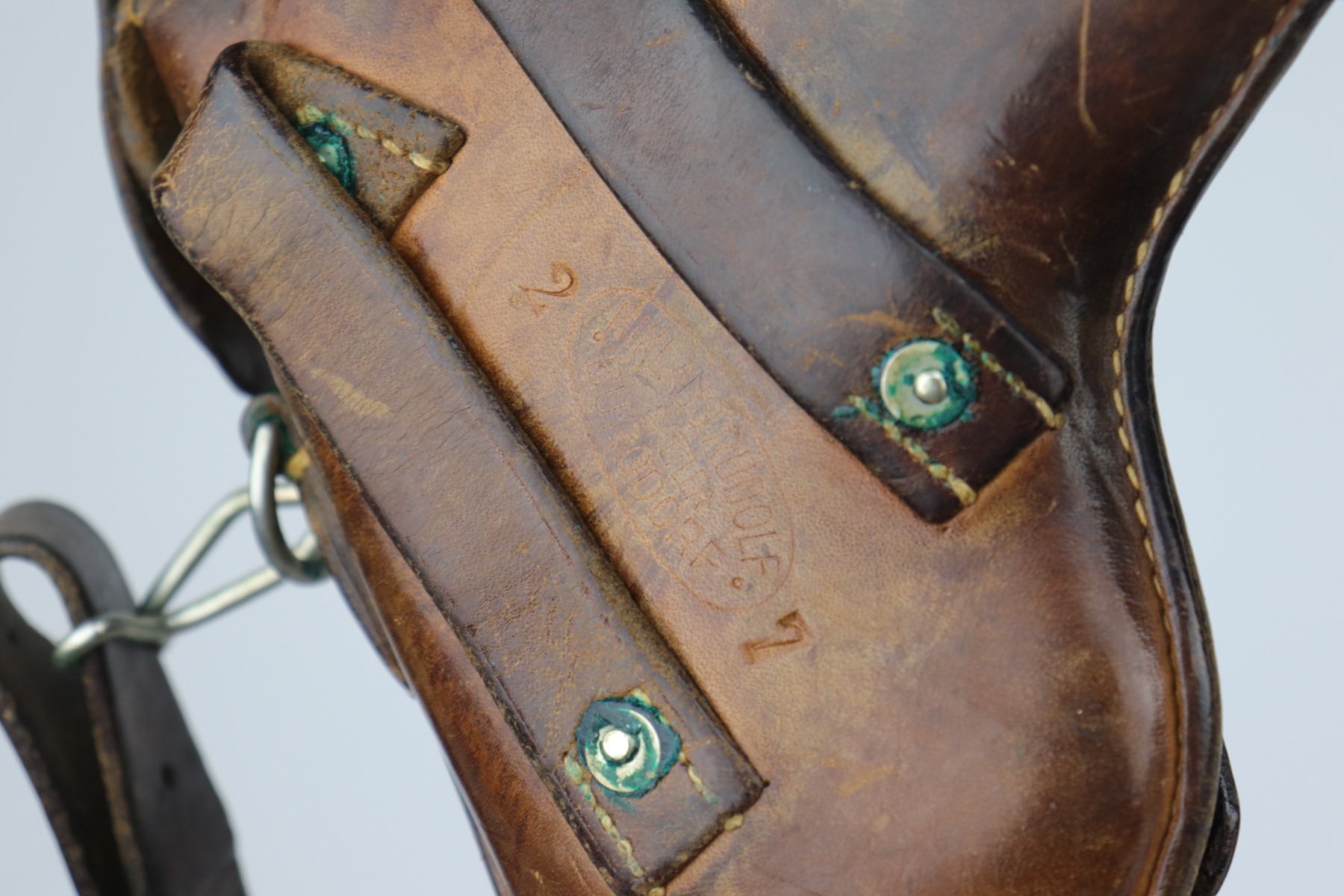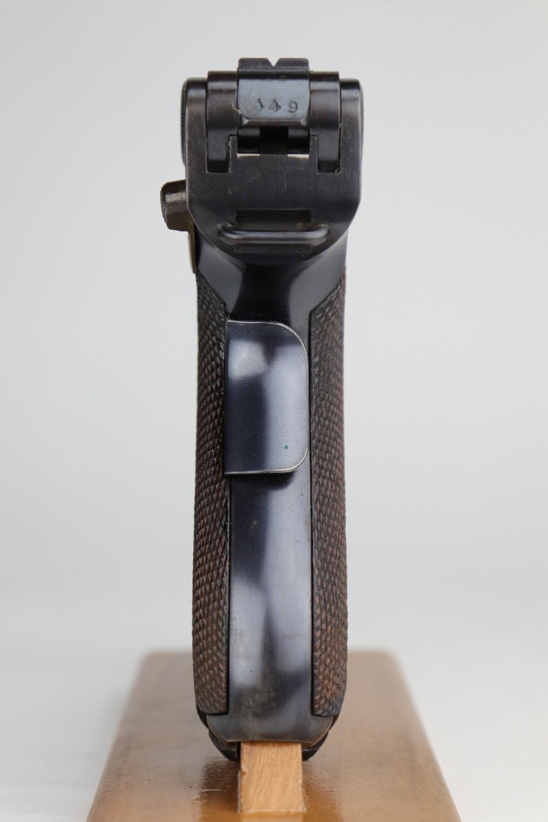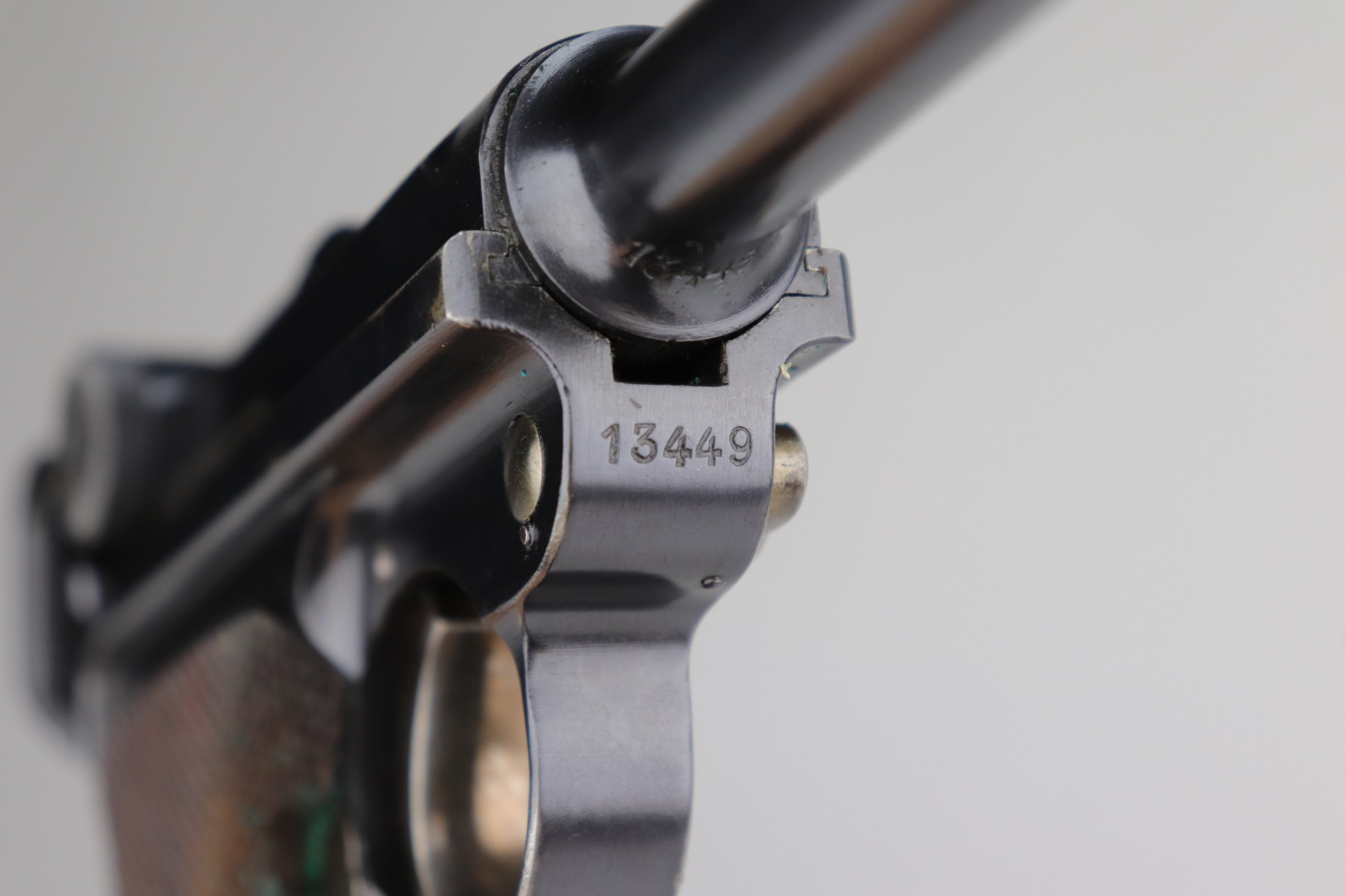 10/6/20 – This is an excellent example of a DWM 1906 Swiss Luger rig. The rig comes with a period-correct, un-numbered Swiss magazine and a rarely-seen leather shoulder holster with the original strap. The gun is all matching, has Swiss cross markings throughout, has a “Cross over V” marking on the left side of the slide, a has a “P” marking in the same area. This marking indicates that it was released from Swiss military service to be sold in the commercial market. This gun has retained about 96% of its bluing. There are a few areas of wear on the front strap, wear and a small ding on the side plate, and minor wear on the front edges of the frame. The grips are excellent. The bore is mint.
