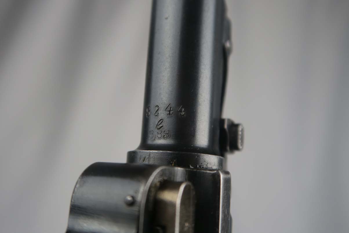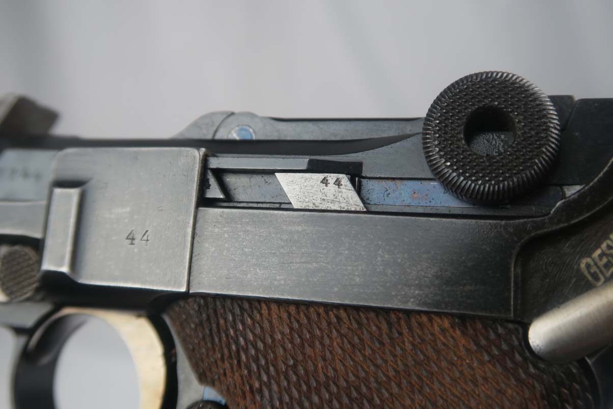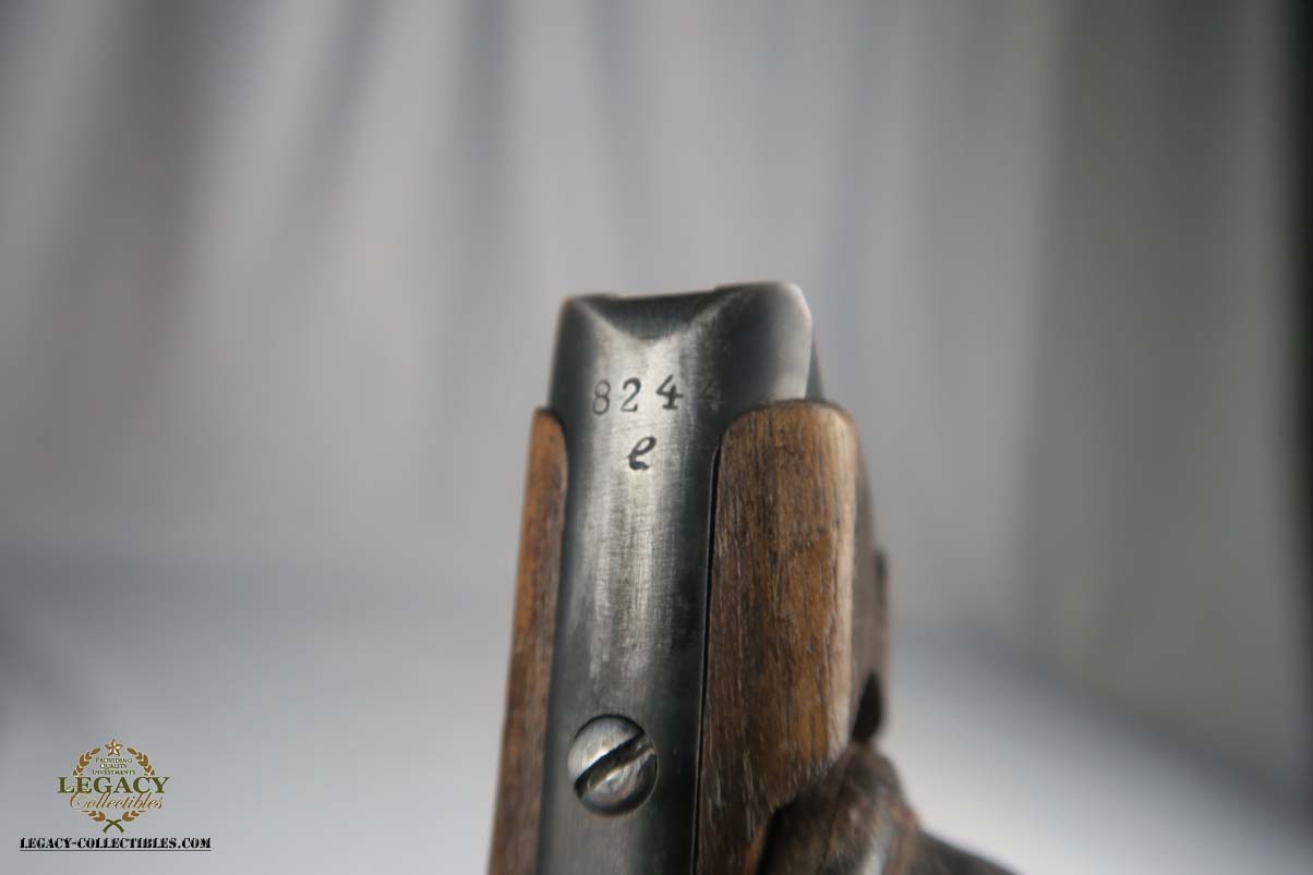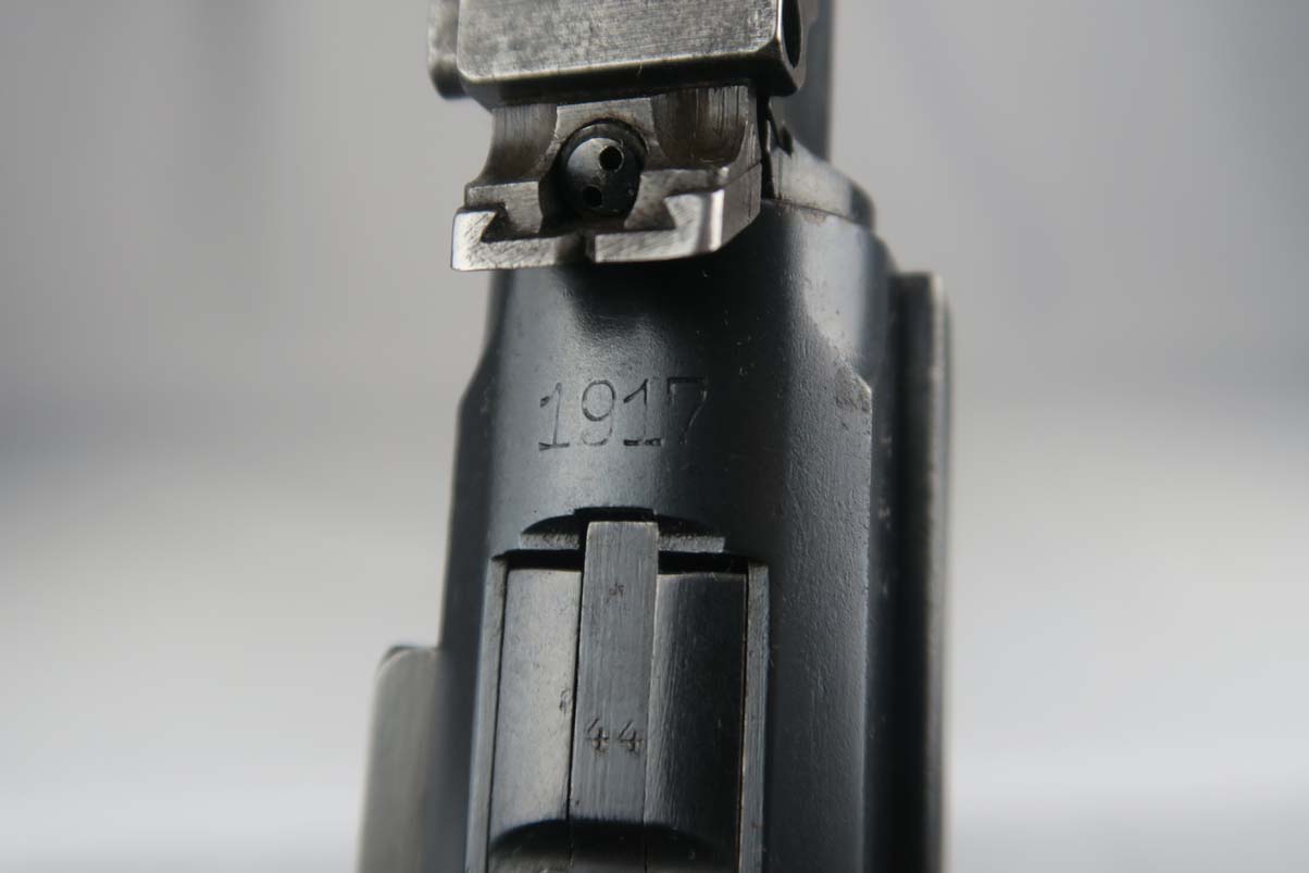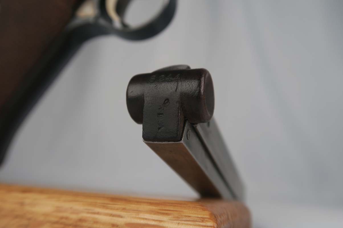 6/12/17 – This is an all original and all matching 1917 Artillery Rig.    The luger has original finish that I would rate in the 95-96% range.   The grips straps are particularly nice as is the strawed color small parts.    The serial under the barrel shows the appropriate “halo” effect.   All parts match all the way down to the hold open and firing pin.  The grips and magazine match as well, however the 44 on the grips are extremely faint, and on the left side might just be my imagination.  But they do fit perfectly.  The gore is shiny and strong.  I would rate it a 7 out of 10.  To top it off, the luger comes with a worn but original holster.  I do not see a maker on date on the holster.   The original straps are included although there is re-stitching on the closure strap to repair a break.   The cup is pink inside as it should be.    The shoulder board is Imperial proofed and MATCHES the gun.    Comes with an original cleaning rod.  There was no tool included.