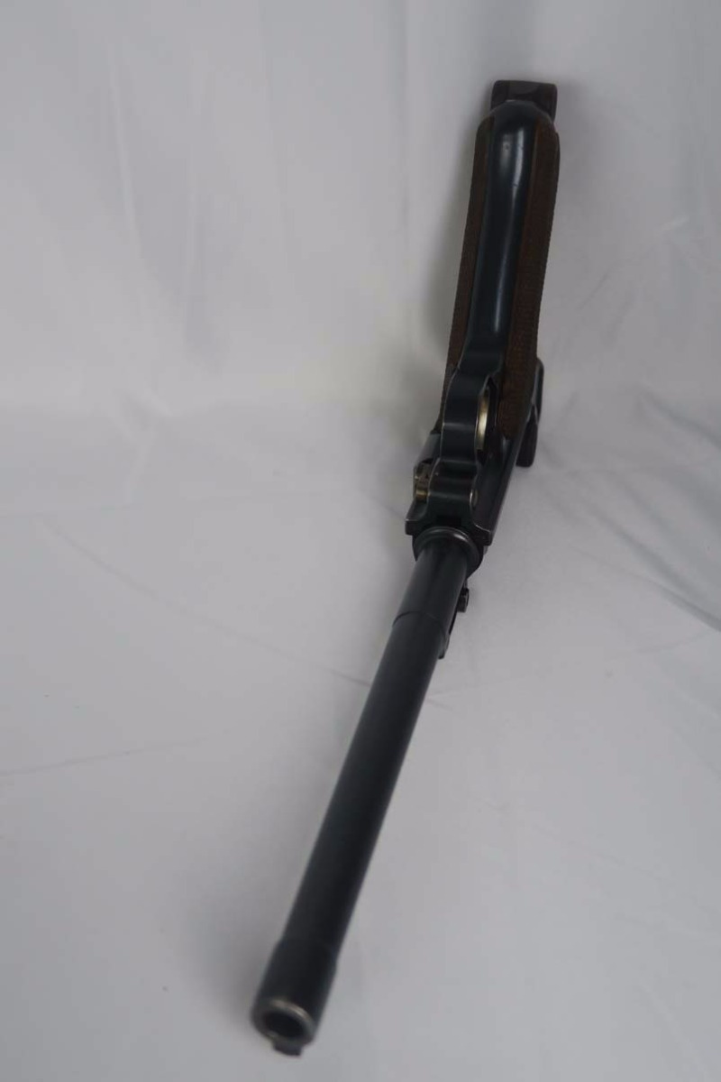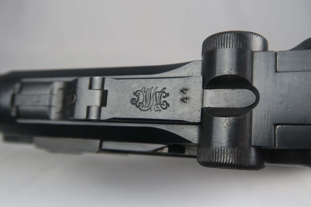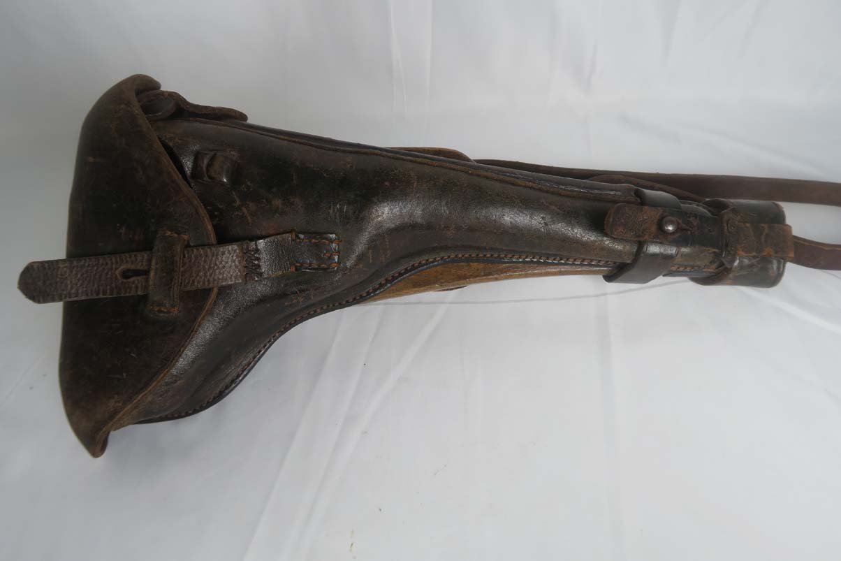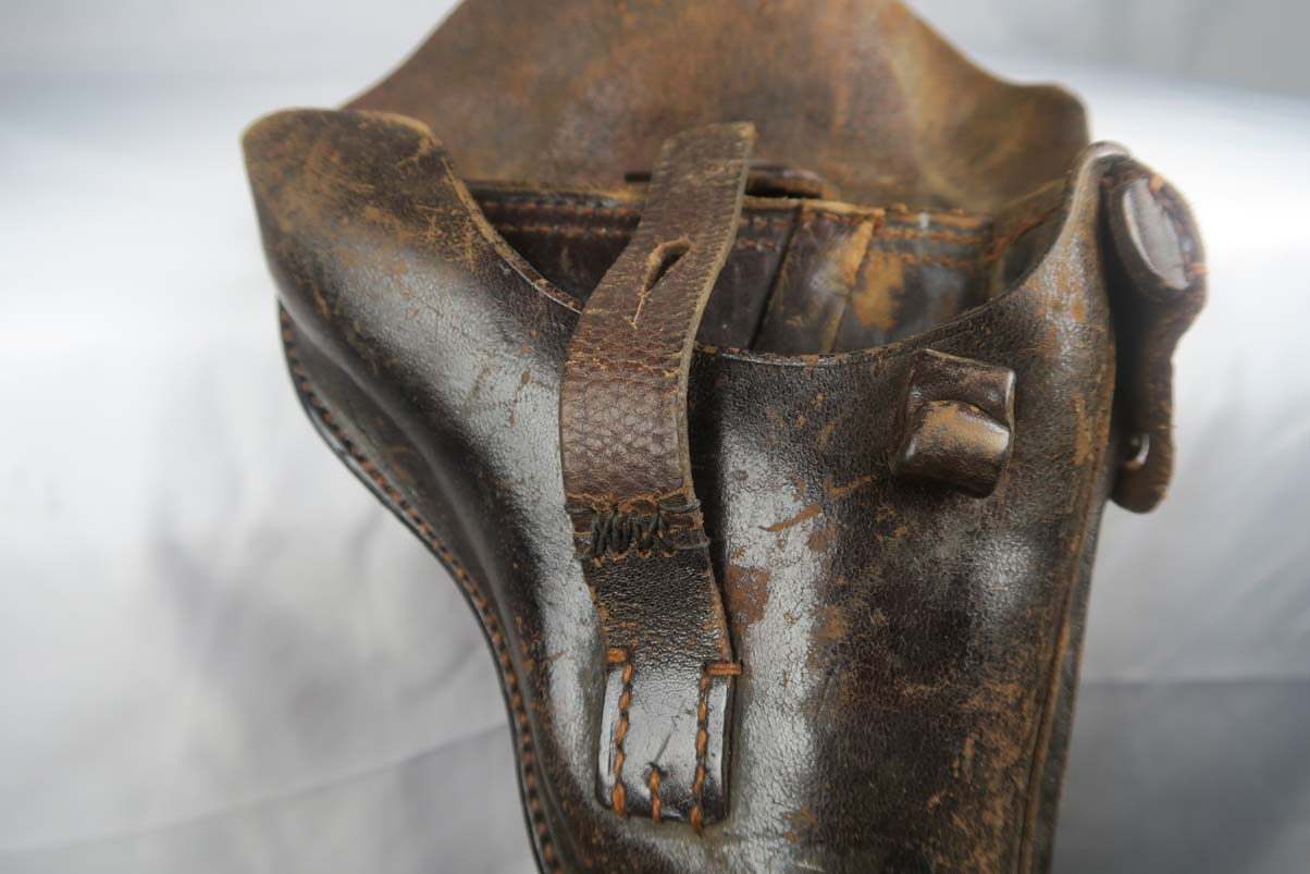 6/12/17 – This is an all original and all matching 1917 Artillery Rig.    The luger has original finish that I would rate in the 95-96% range.   The grips straps are particularly nice as is the strawed color small parts.    The serial under the barrel shows the appropriate “halo” effect.   All parts match all the way down to the hold open and firing pin.  The grips and magazine match as well, however the 44 on the grips are extremely faint, and on the left side might just be my imagination.  But they do fit perfectly.  The gore is shiny and strong.  I would rate it a 7 out of 10.  To top it off, the luger comes with a worn but original holster.  I do not see a maker on date on the holster.   The original straps are included although there is re-stitching on the closure strap to repair a break.   The cup is pink inside as it should be.    The shoulder board is Imperial proofed and MATCHES the gun.    Comes with an original cleaning rod.  There was no tool included.