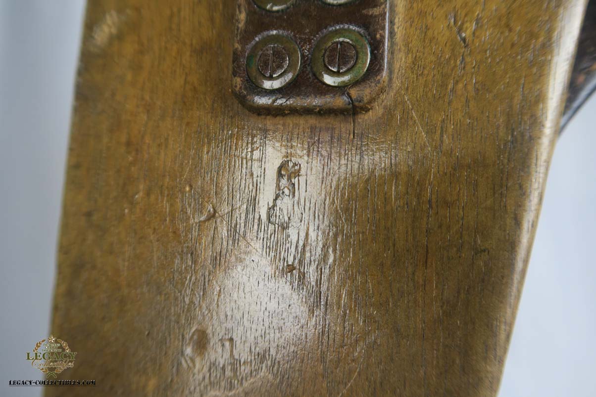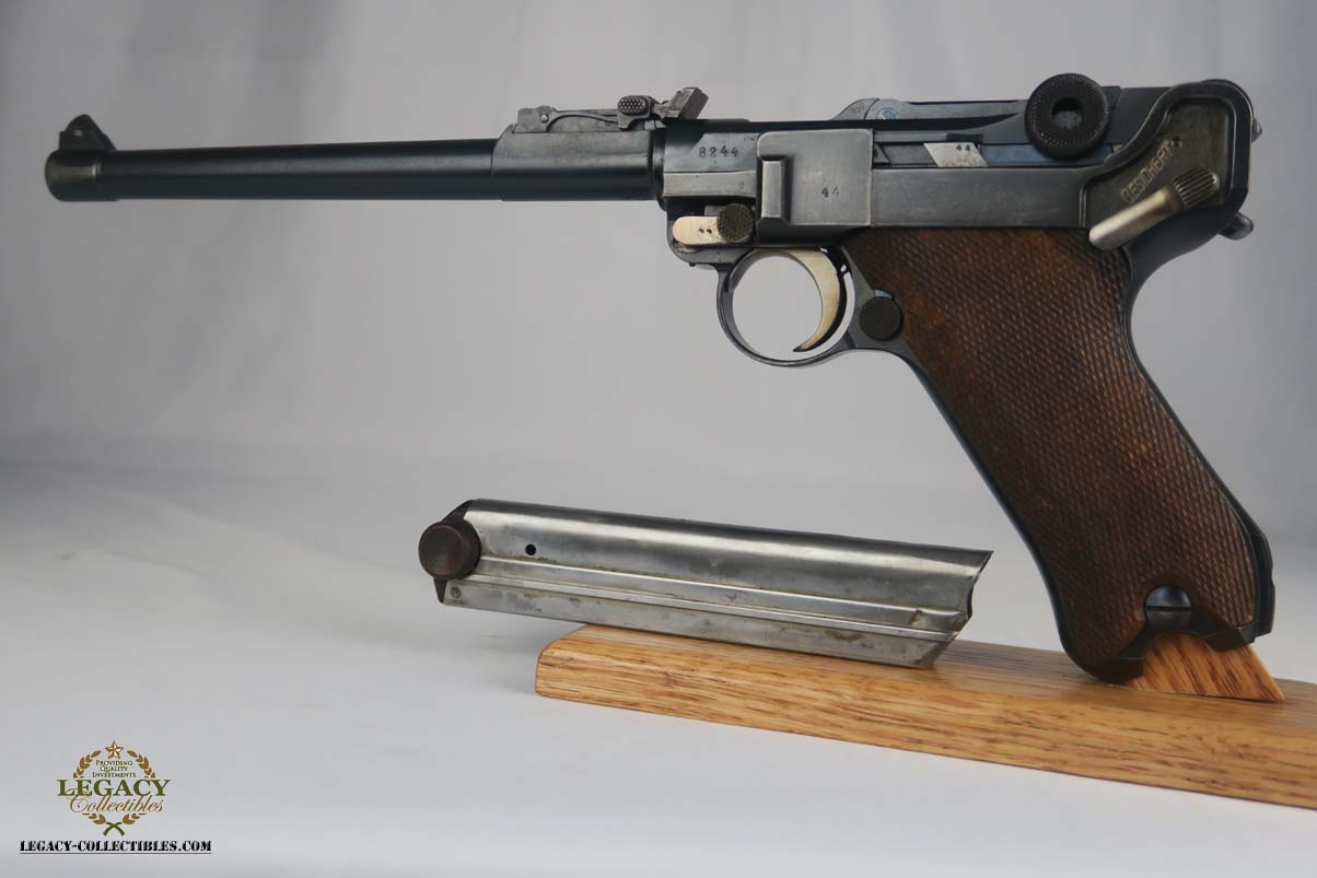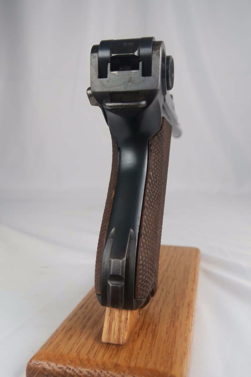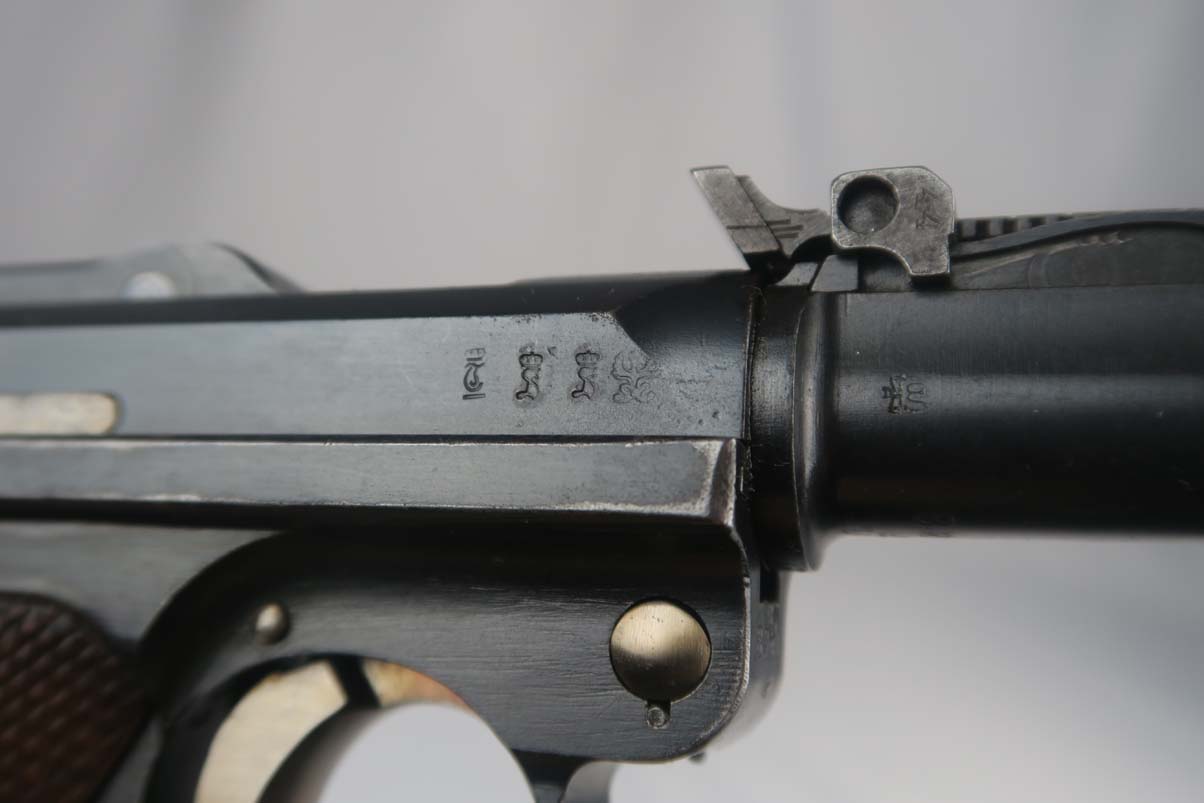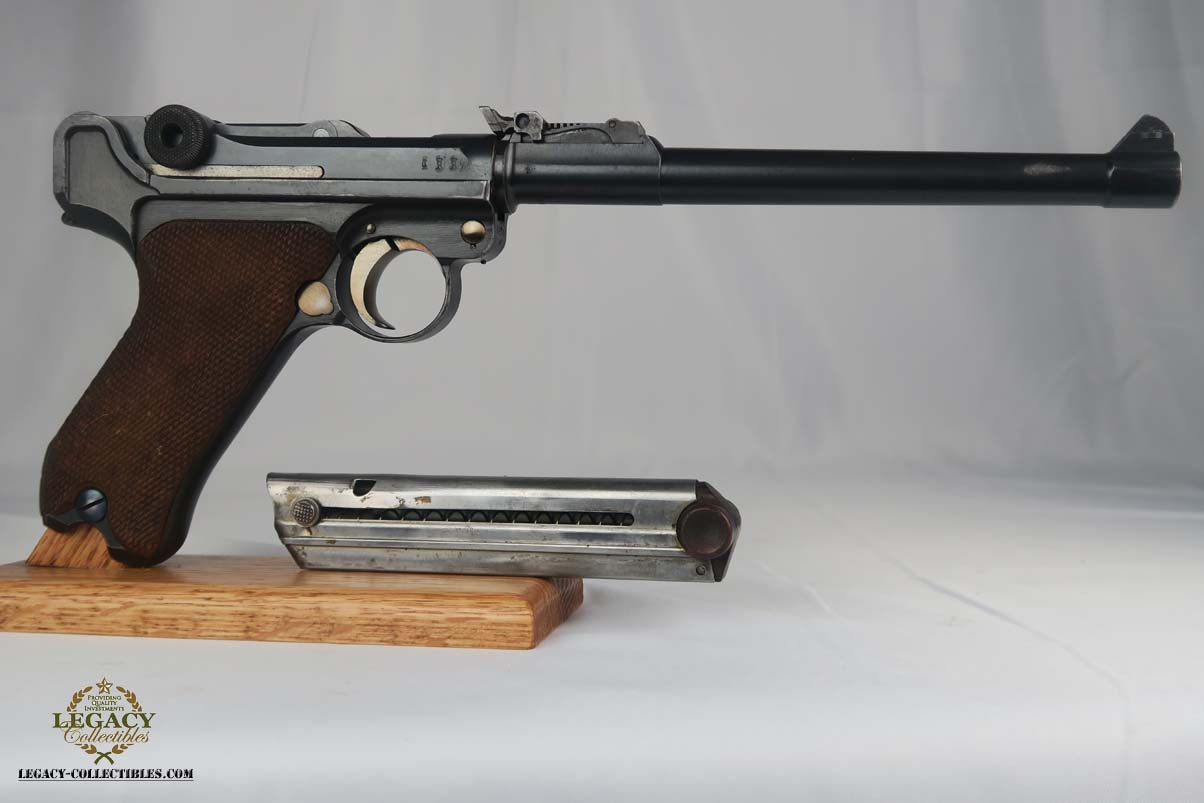 6/12/17 – This is an all original and all matching 1917 Artillery Rig.    The luger has original finish that I would rate in the 95-96% range.   The grips straps are particularly nice as is the strawed color small parts.    The serial under the barrel shows the appropriate “halo” effect.   All parts match all the way down to the hold open and firing pin.  The grips and magazine match as well, however the 44 on the grips are extremely faint, and on the left side might just be my imagination.  But they do fit perfectly.  The gore is shiny and strong.  I would rate it a 7 out of 10.  To top it off, the luger comes with a worn but original holster.  I do not see a maker on date on the holster.   The original straps are included although there is re-stitching on the closure strap to repair a break.   The cup is pink inside as it should be.    The shoulder board is Imperial proofed and MATCHES the gun.    Comes with an original cleaning rod.  There was no tool included.