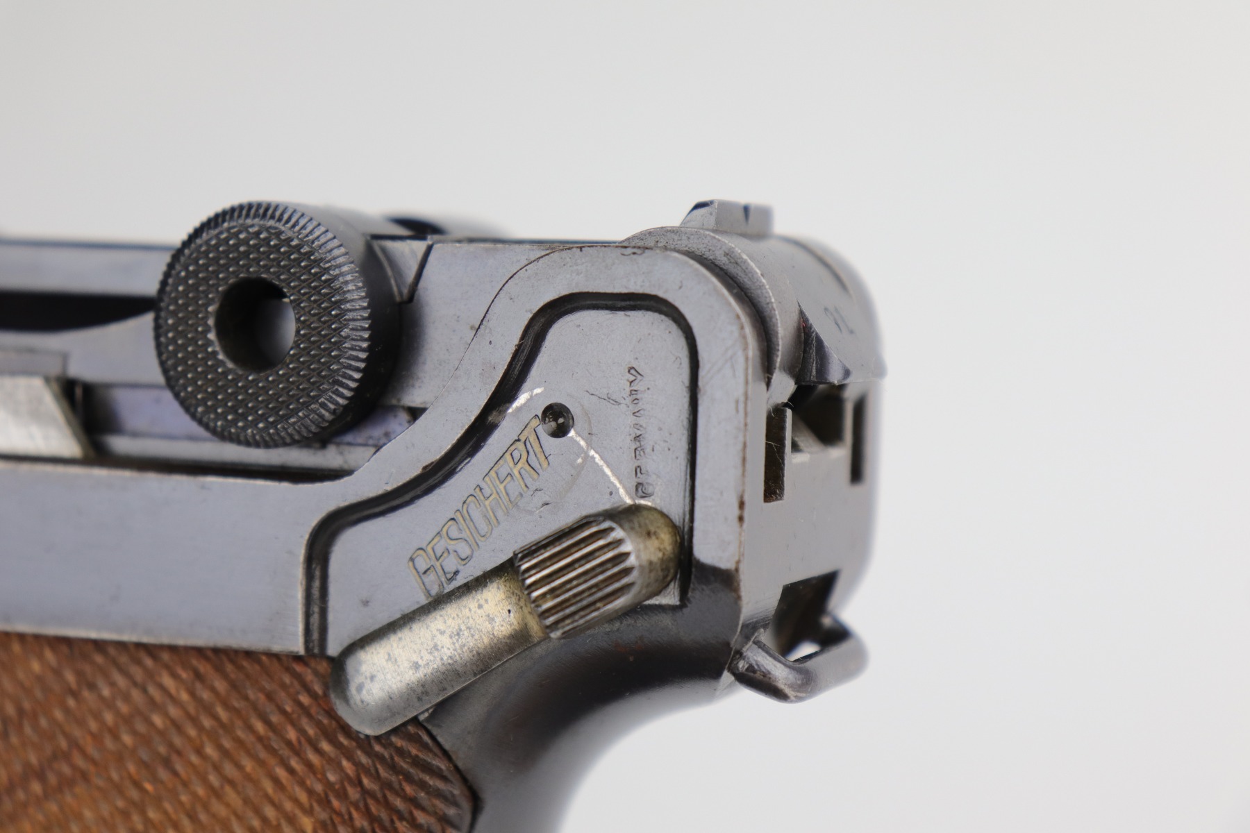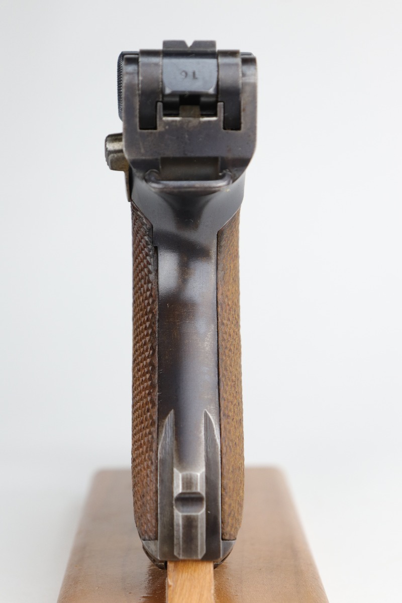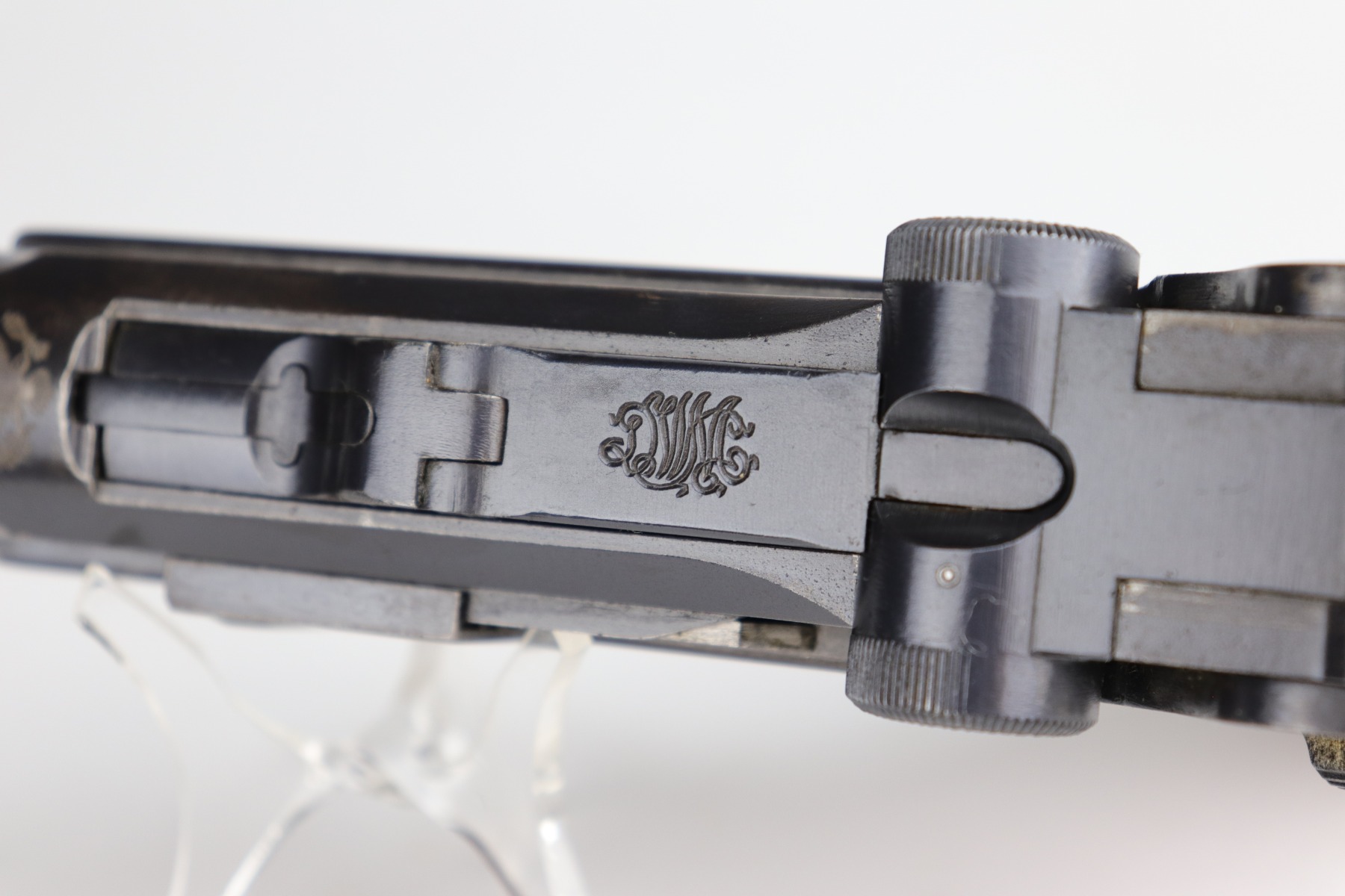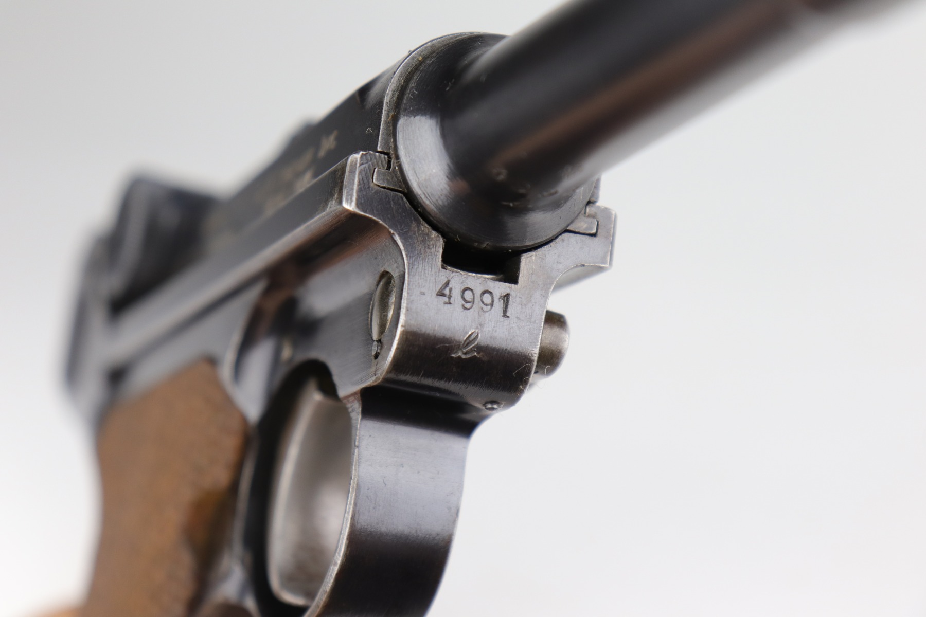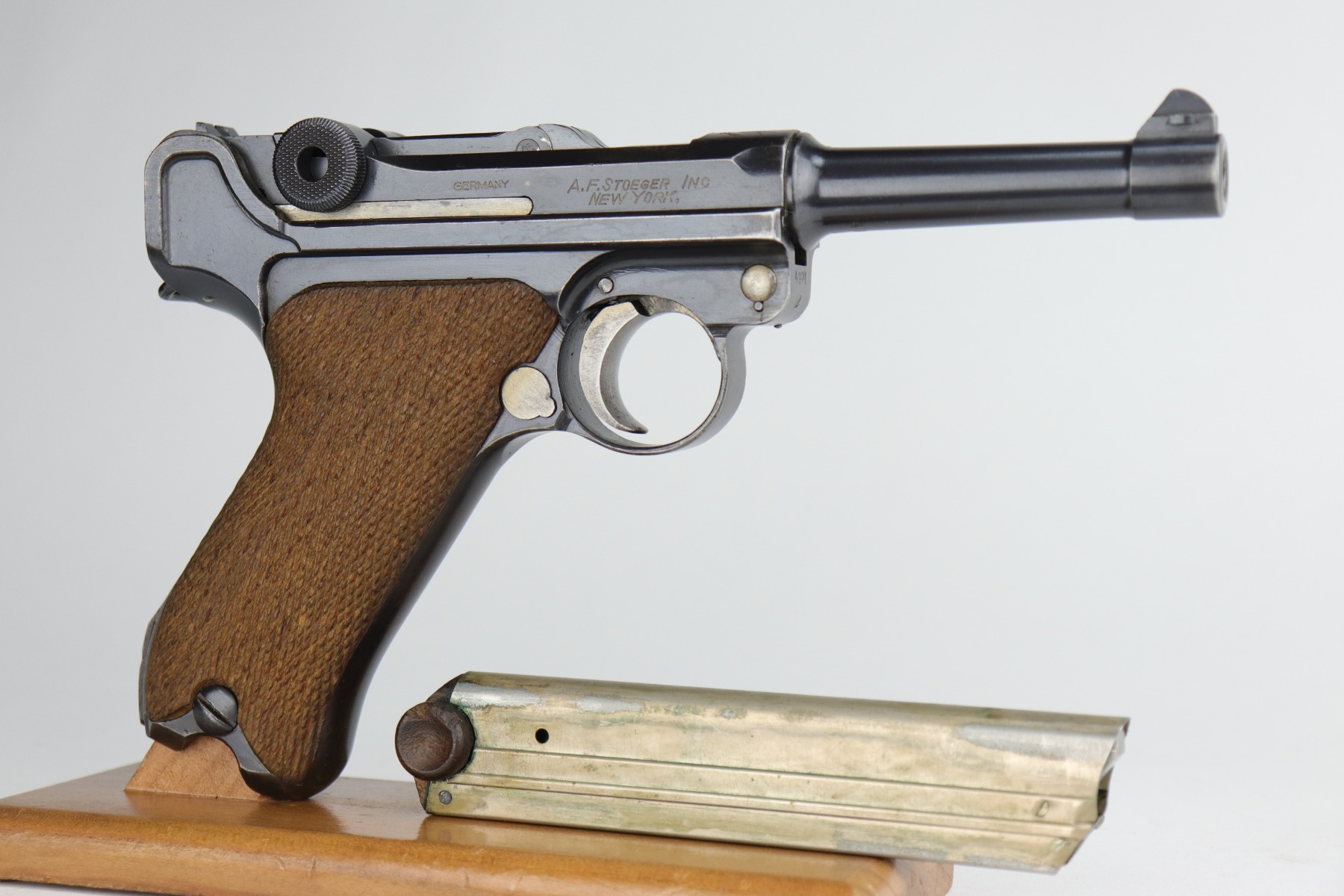 3/28/23 – This is a nice example of a DWM Luger made in Germany for Stoeger Arms Corporation to be sold in the U.S. Several different barrel lengths were offered in either 9mm or 7.65mm. This particular gun has a 4″ barrel and is chambered in 7.65mm, or .30 Luger. The quantity of Lugers acquired by Stoeger was rather low, making this Luger a scarce variation. This example is marked with the “American Eagle” stamp on the chamber and “DWM” on the toggle. There is a Germany export mark on the right side of the slide. It is all matching and has retained somewhere between 85-90% of its original bluing. There is very minor muzzle wear, wear on some of the high edges, and wear on the side plate. There isn’t much actual finish loss on the straps, but there is spotty oxidation/discoloration throughout. The grips are very nice – just a a few small areas of wear. It comes with a WW1-era numbered magazine – small chip in the left side. The bore has relatively weak rifling with minor pitting throughout.