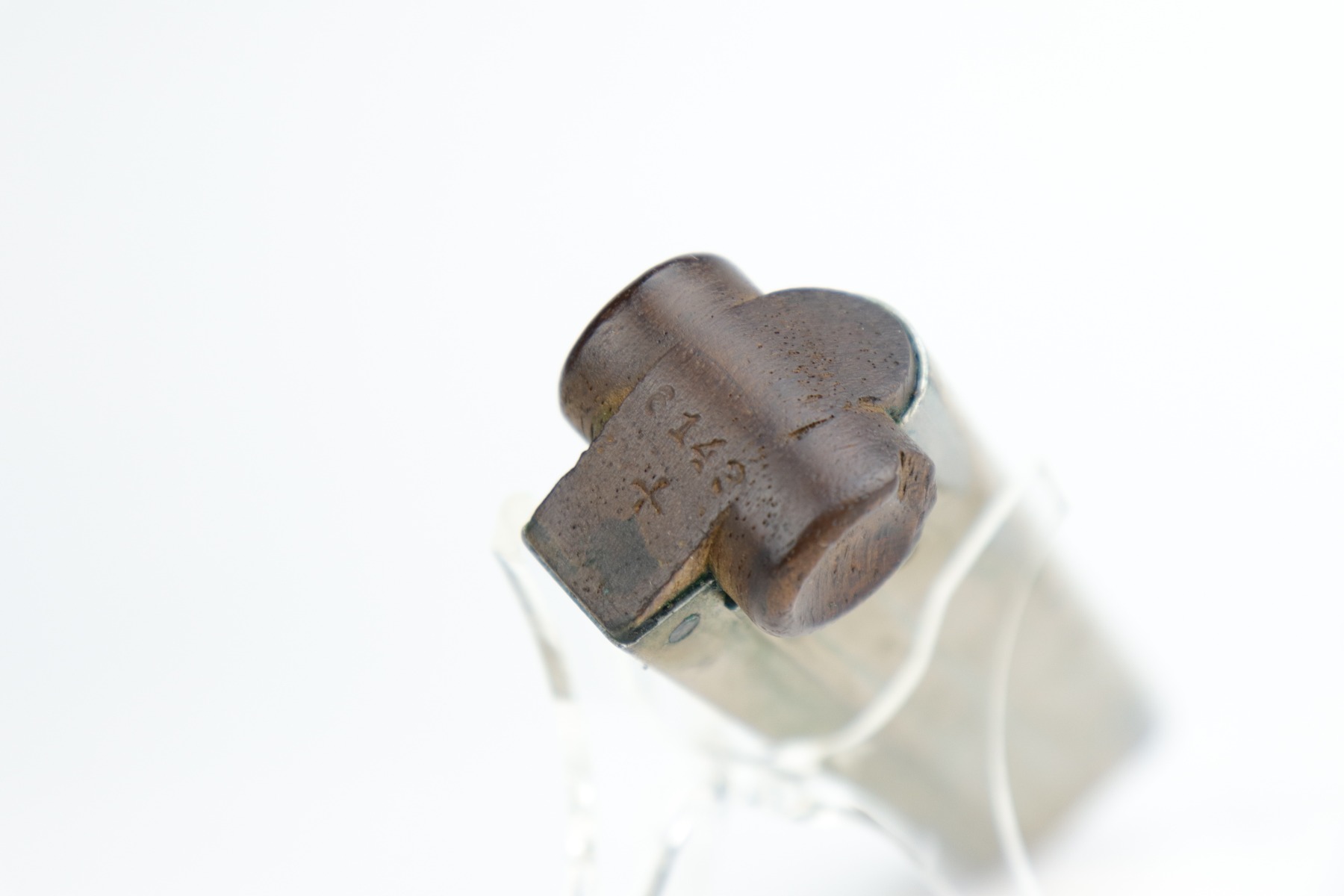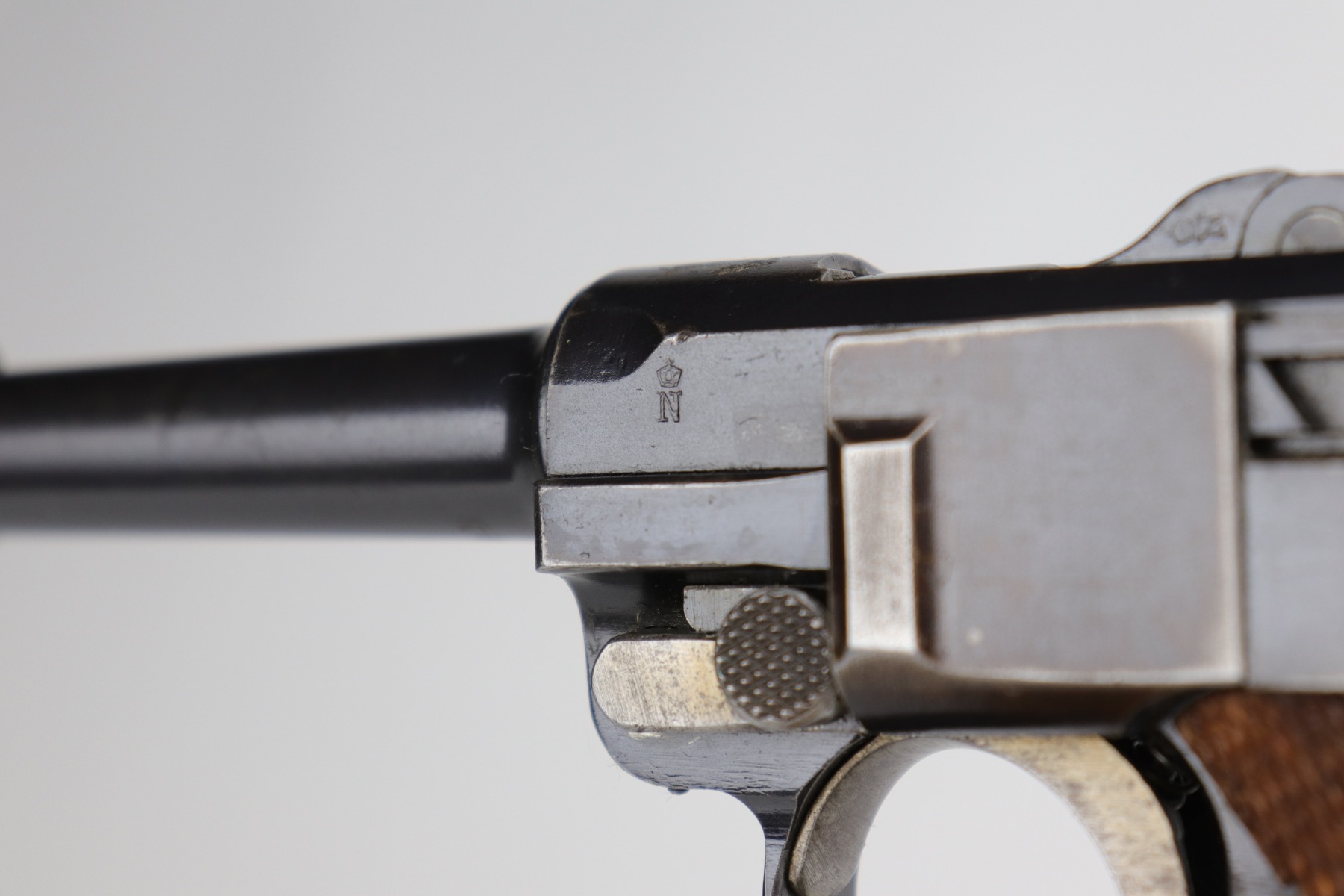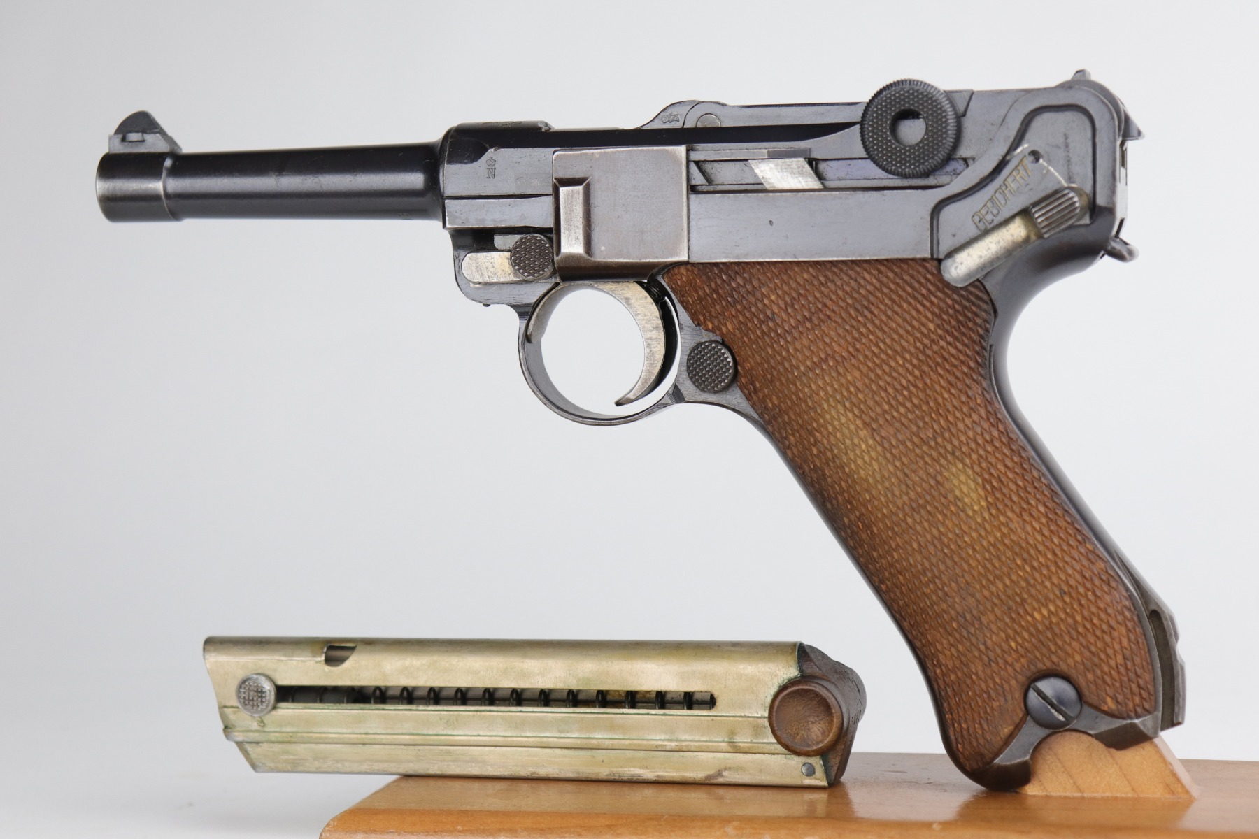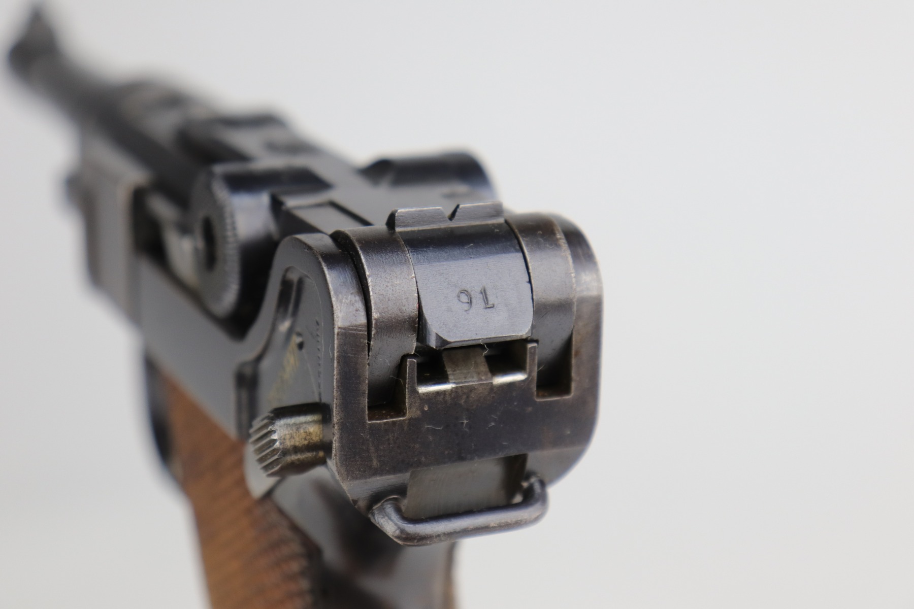 3/28/23 – This is a nice example of a DWM Luger made in Germany for Stoeger Arms Corporation to be sold in the U.S. Several different barrel lengths were offered in either 9mm or 7.65mm. This particular gun has a 4″ barrel and is chambered in 7.65mm, or .30 Luger. The quantity of Lugers acquired by Stoeger was rather low, making this Luger a scarce variation. This example is marked with the “American Eagle” stamp on the chamber and “DWM” on the toggle. There is a Germany export mark on the right side of the slide. It is all matching and has retained somewhere between 85-90% of its original bluing. There is very minor muzzle wear, wear on some of the high edges, and wear on the side plate. There isn’t much actual finish loss on the straps, but there is spotty oxidation/discoloration throughout. The grips are very nice – just a a few small areas of wear. It comes with a WW1-era numbered magazine – small chip in the left side. The bore has relatively weak rifling with minor pitting throughout.