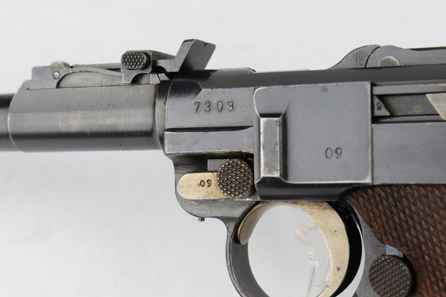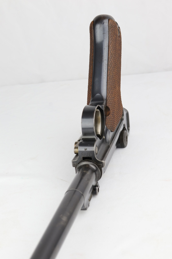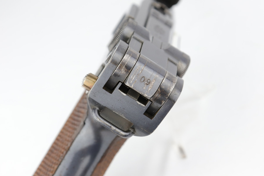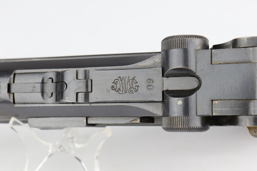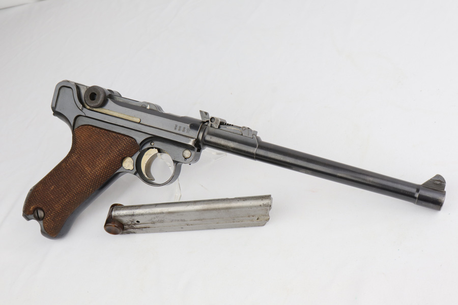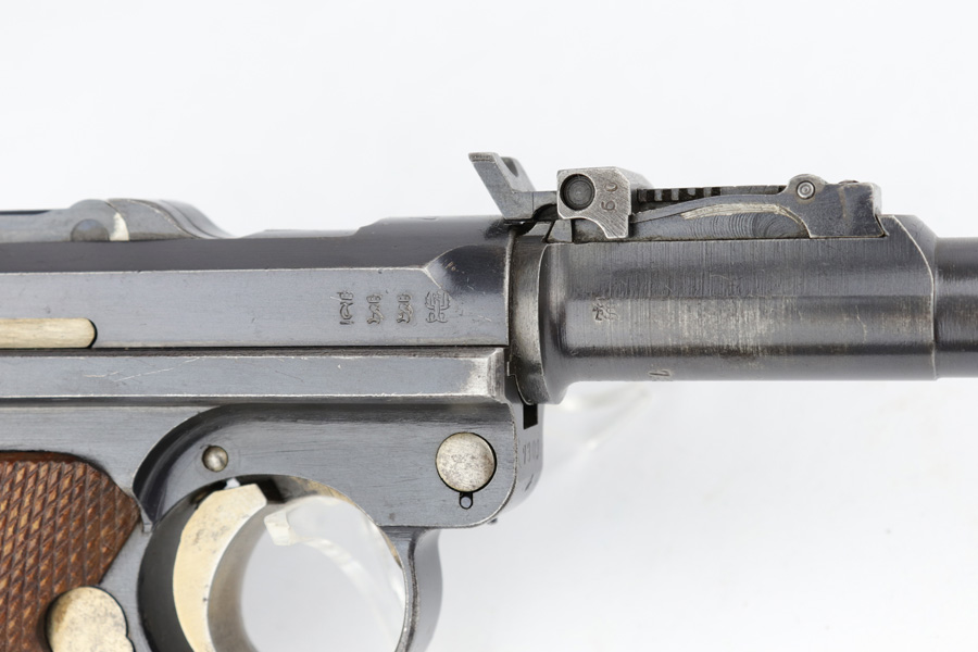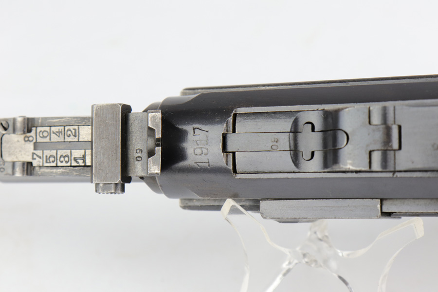 3/13/19 – This is an excellent and all matching Artillery DWM Luger, manufactured in 1917. The original bluing rates at 95-96% with minor finish loss on the muzzle, sideplate and barrel. Very good straw on the small parts. The grips are excellent and appear matching to the gun, but the numbering is faint so it’s hard to say for certain. The ‘0’ is sharp on each panel, but both ‘9’ markings are harder to make out. The magazine is period original and unnumbered, with an excellent wood bottom. Strong, shiny bore.