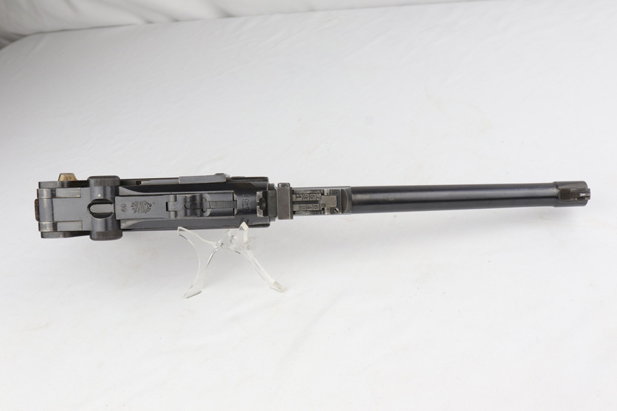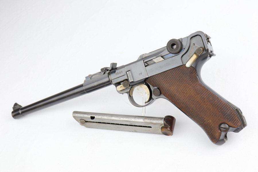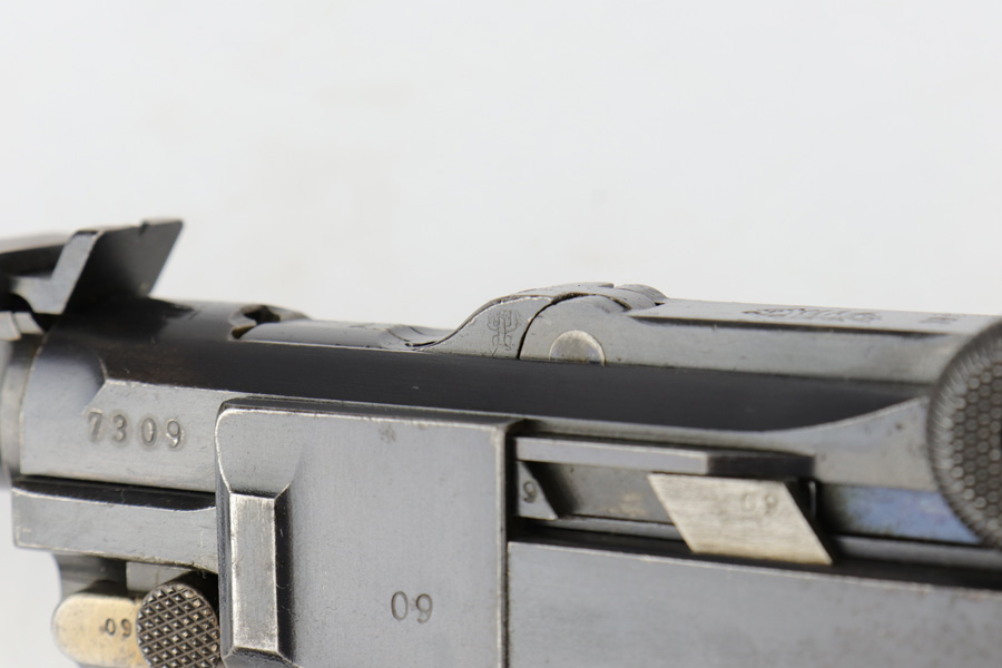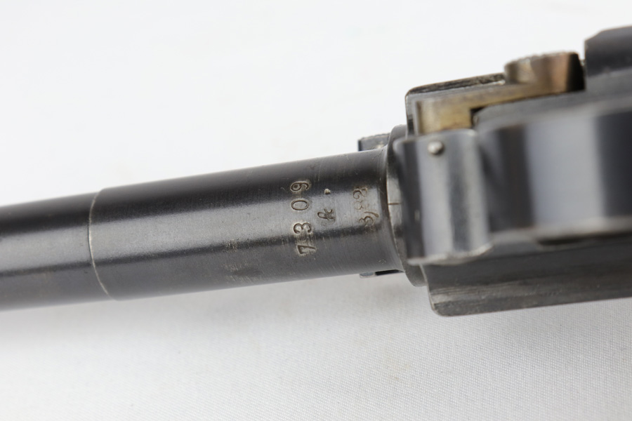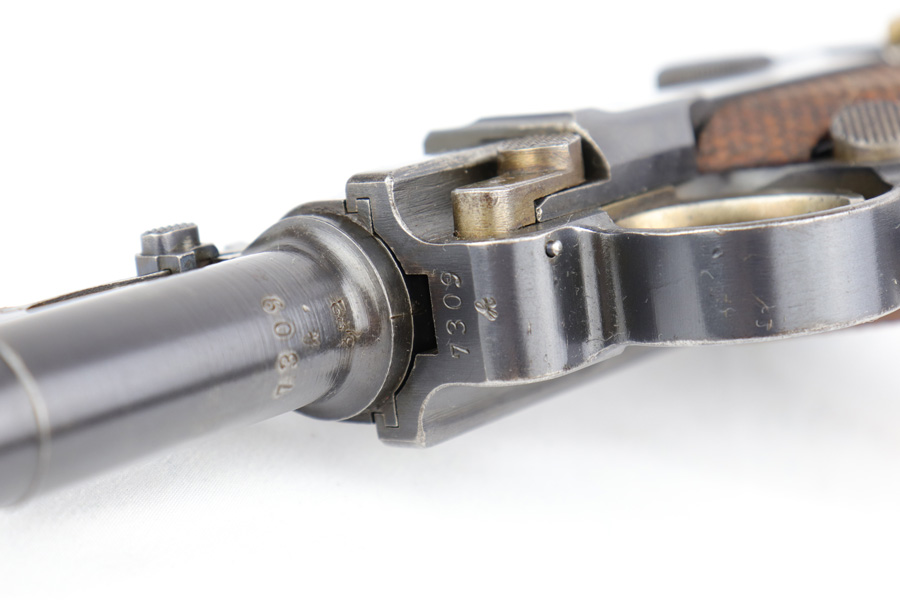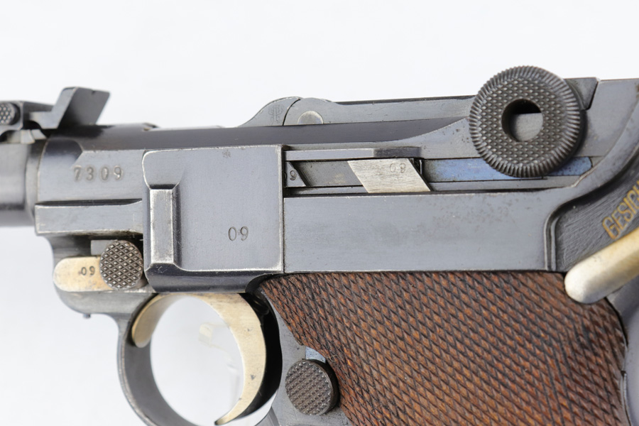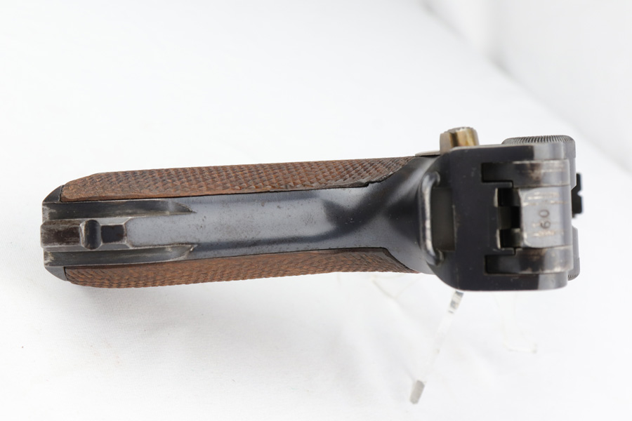 3/13/19 – This is an excellent and all matching Artillery DWM Luger, manufactured in 1917. The original bluing rates at 95-96% with minor finish loss on the muzzle, sideplate and barrel. Very good straw on the small parts. The grips are excellent and appear matching to the gun, but the numbering is faint so it’s hard to say for certain. The ‘0’ is sharp on each panel, but both ‘9’ markings are harder to make out. The magazine is period original and unnumbered, with an excellent wood bottom. Strong, shiny bore.