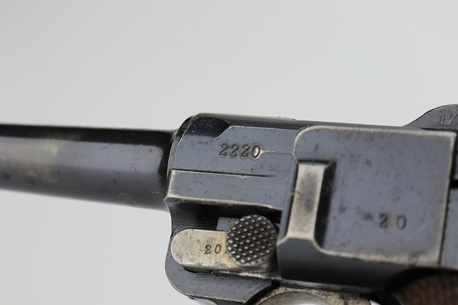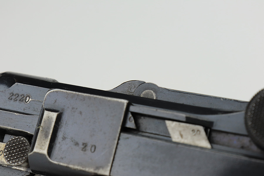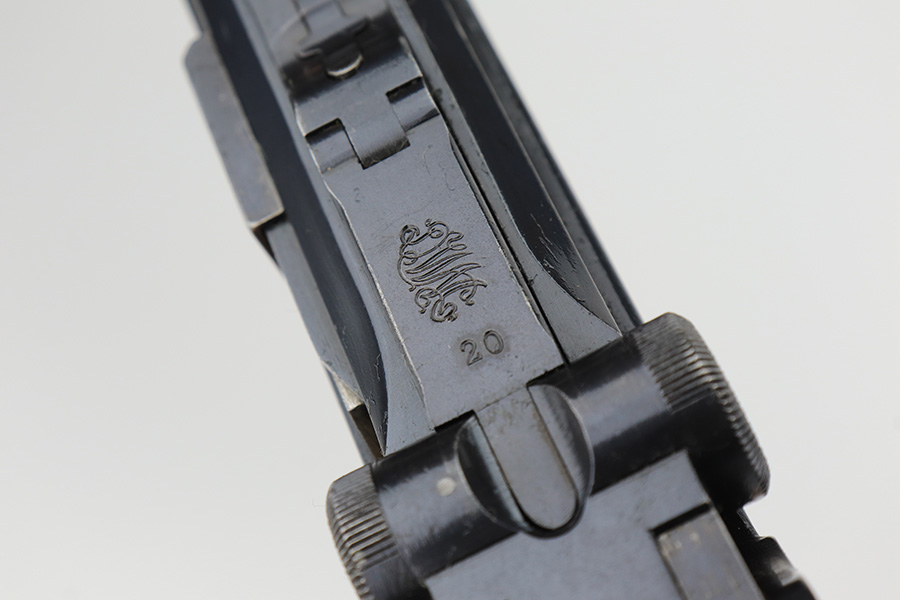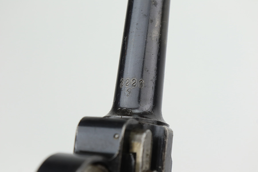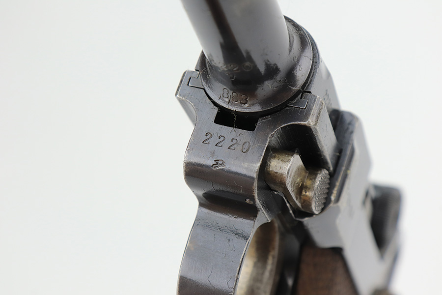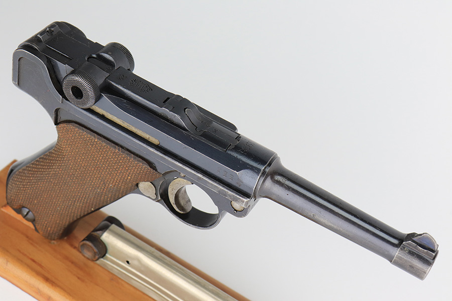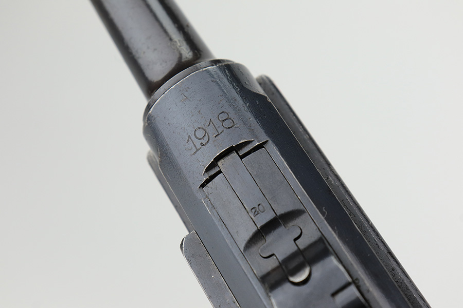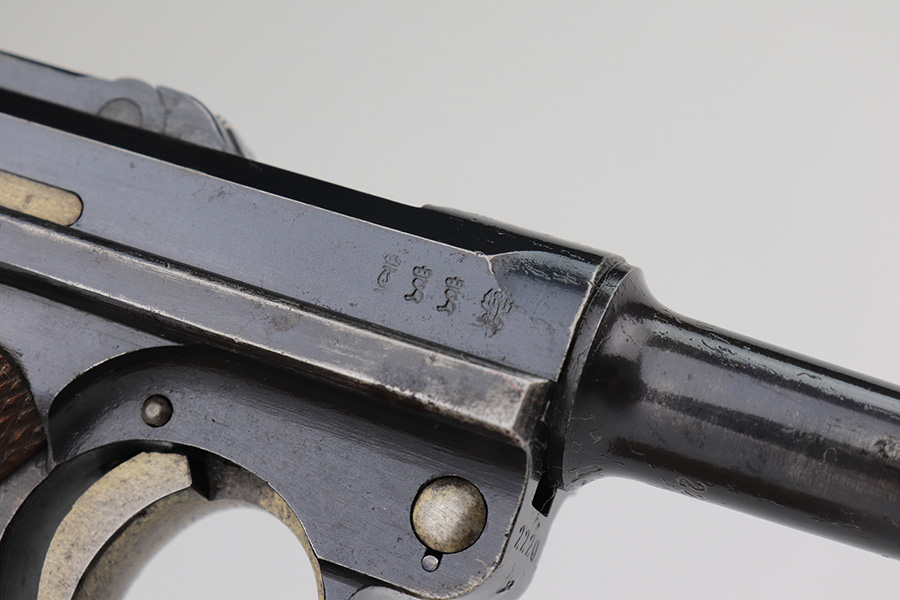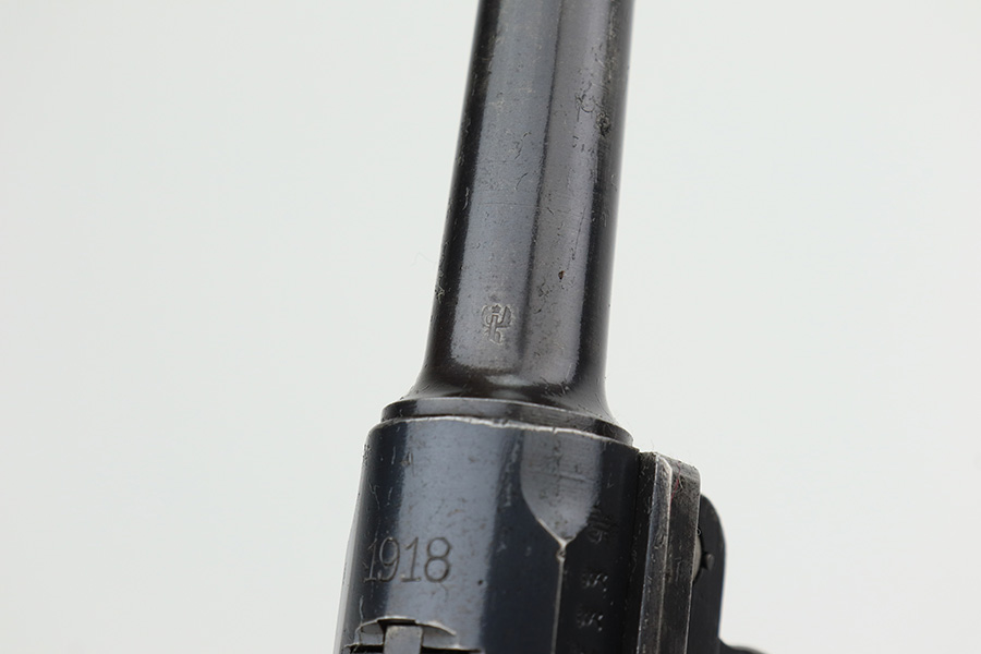 4/25/23 – This is a matching and original DWM Luger from 1918. All numbered small parts match, as does the original set of grips. The magazine is period original but faded/faint and appears to be mismatched. The original blue rates at around 80-85% with were on the sideplate, left side of the barrel, ears of the frame and the right side rail. Also minor freckling on the rail. The bore has decent rifling but some pitting in the grooves. The grips are in very good condition with no cracks or chips and only minor smoothing.