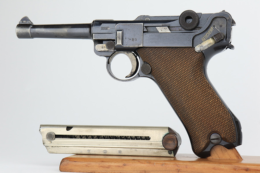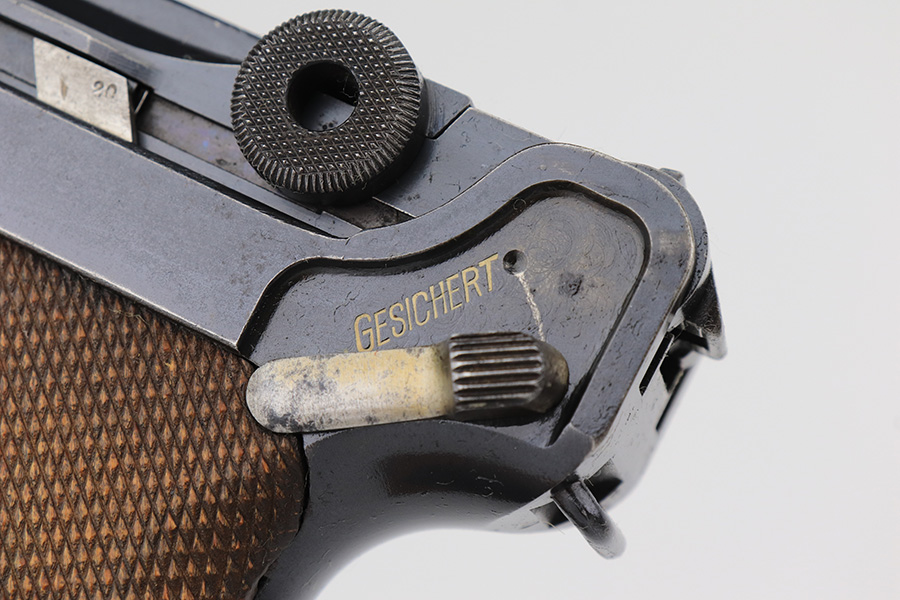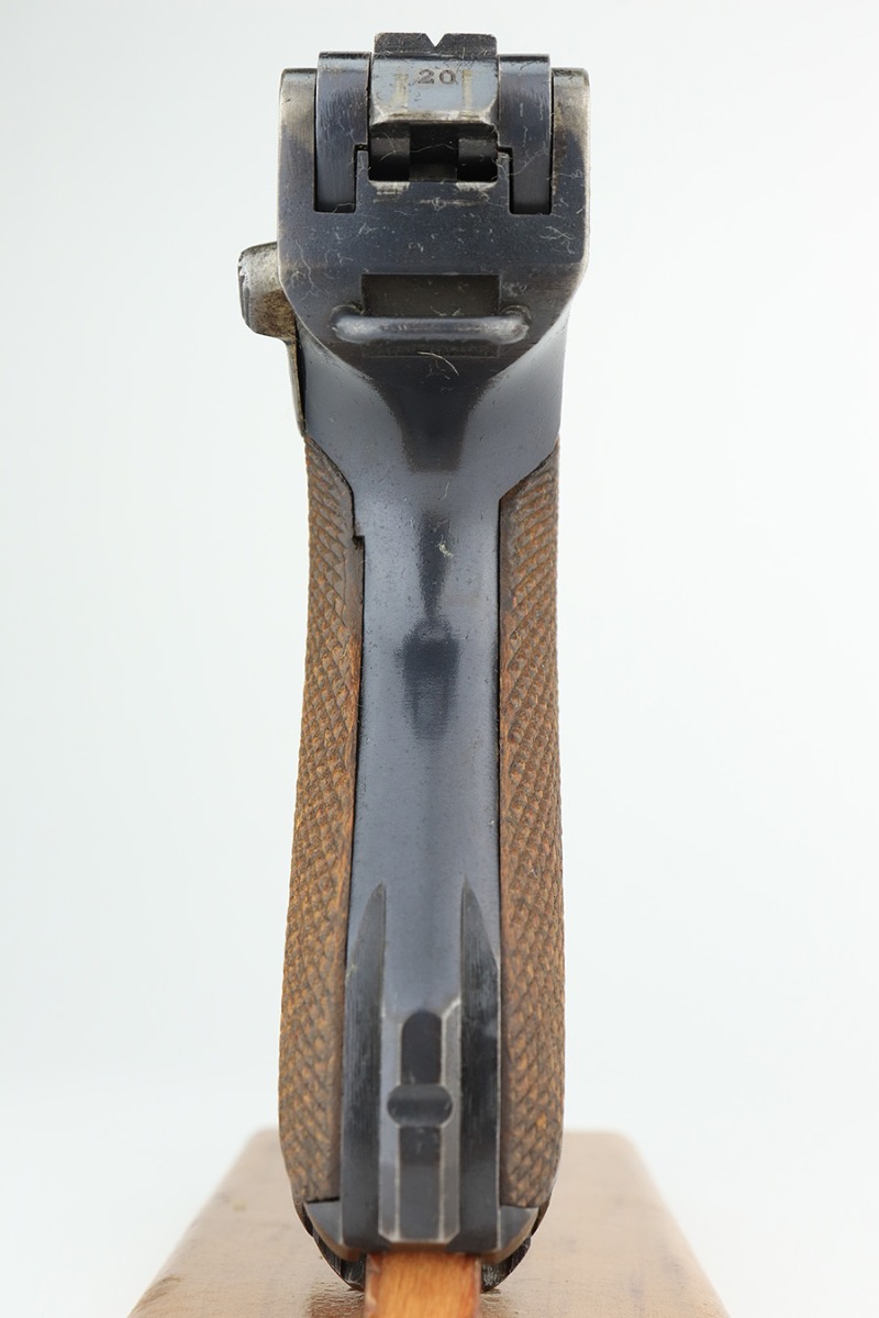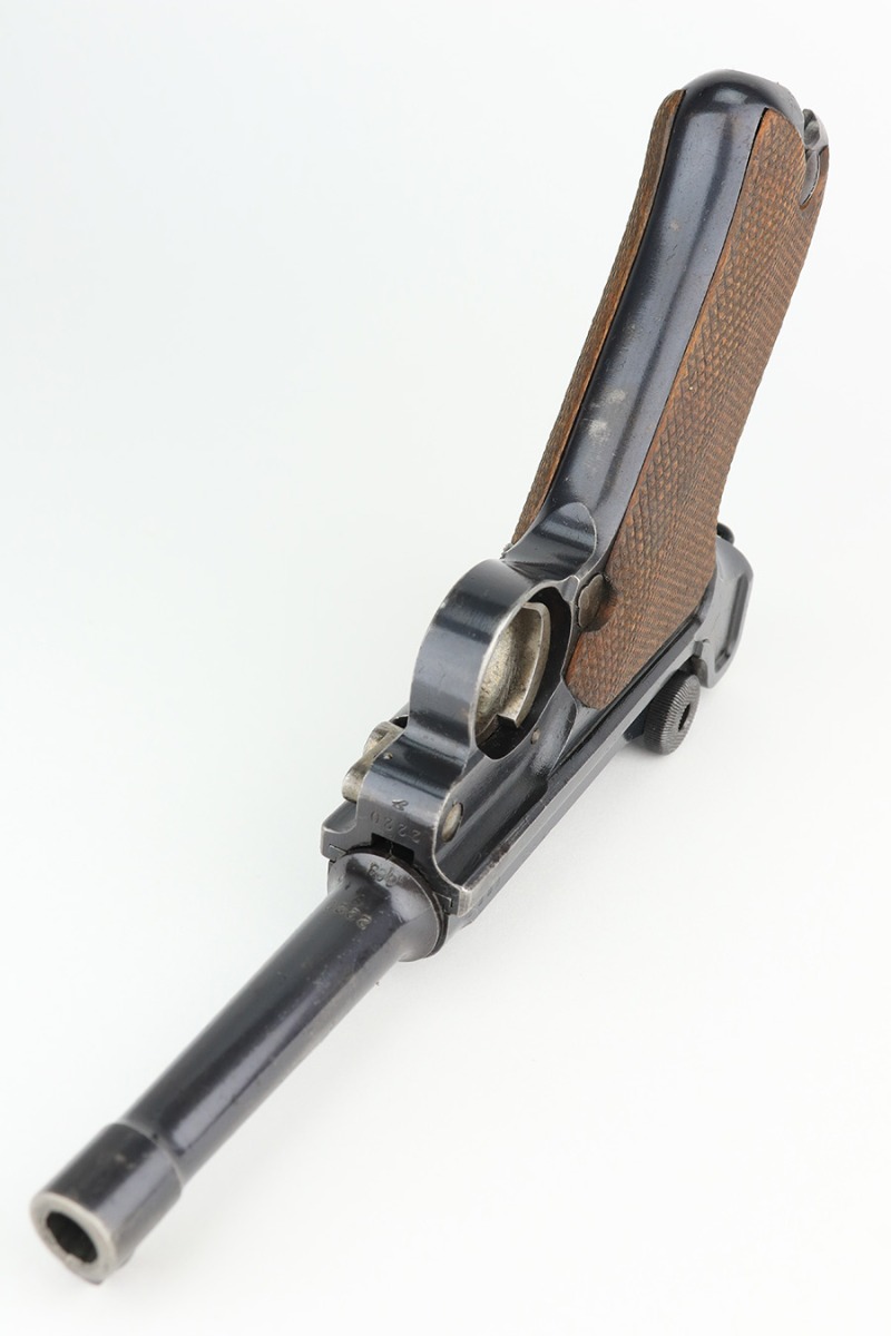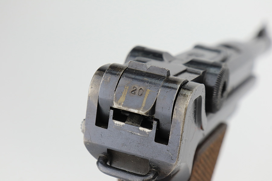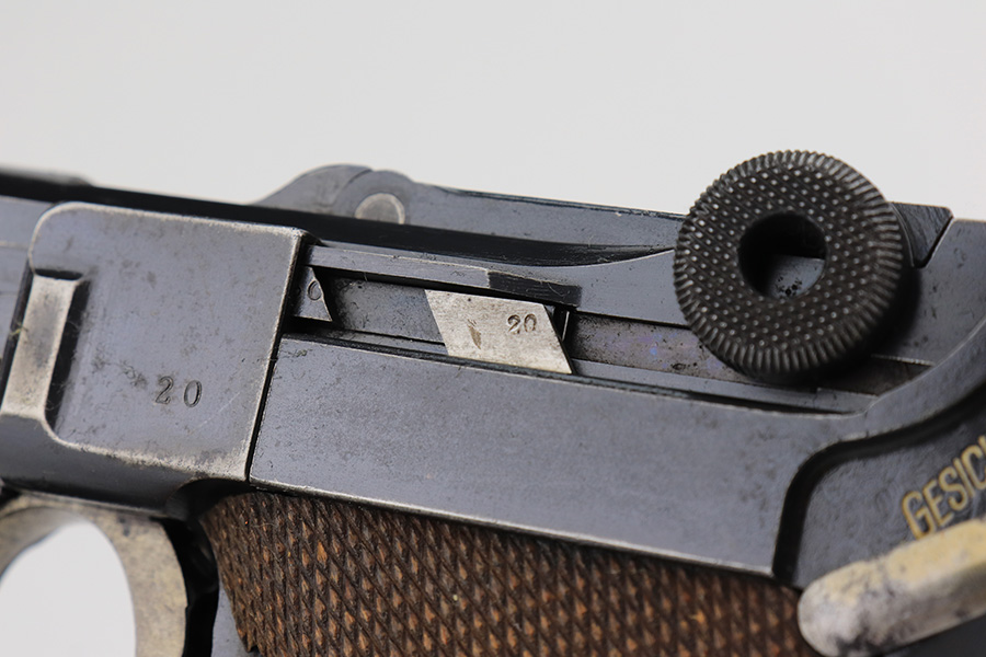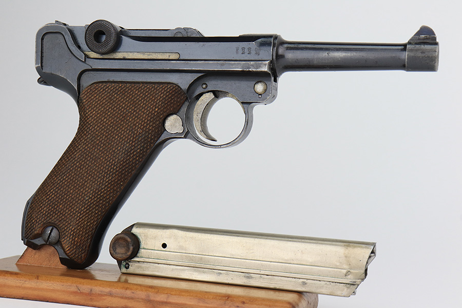4/25/23 – This is a matching and original DWM Luger from 1918. All numbered small parts match, as does the original set of grips. The magazine is period original but faded/faint and appears to be mismatched. The original blue rates at around 80-85% with were on the sideplate, left side of the barrel, ears of the frame and the right side rail. Also minor freckling on the rail. The bore has decent rifling but some pitting in the grooves. The grips are in very good condition with no cracks or chips and only minor smoothing.