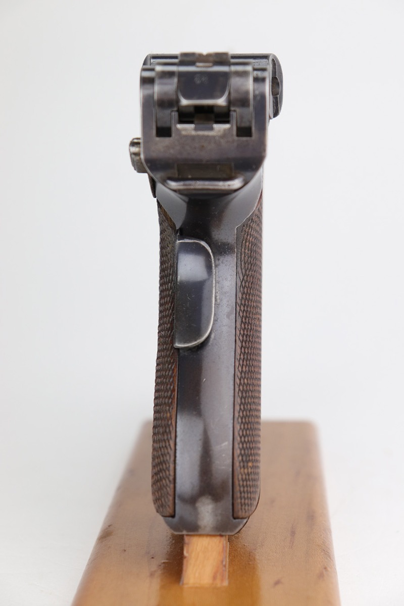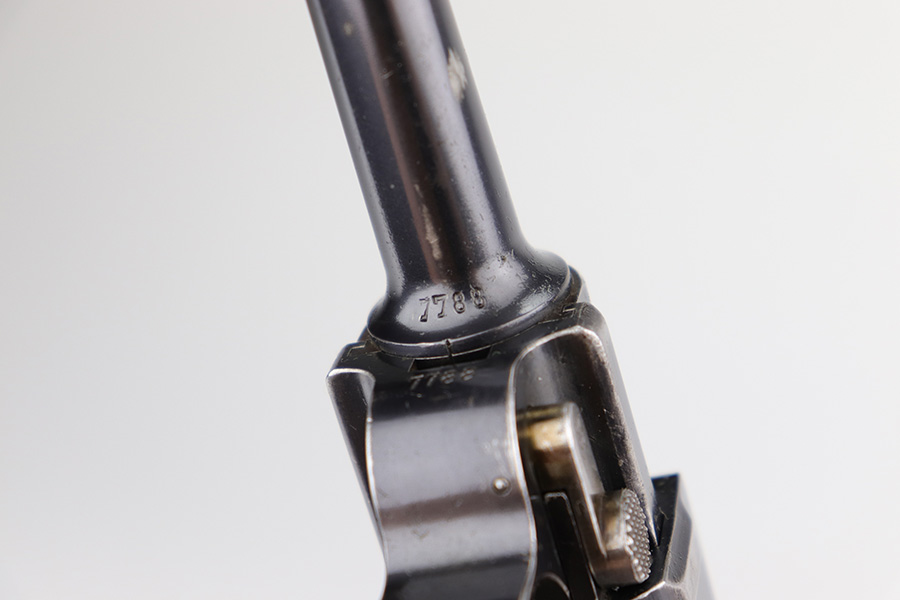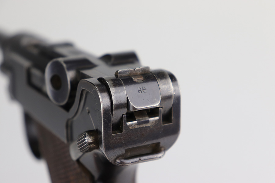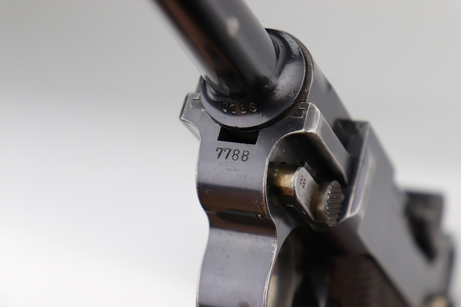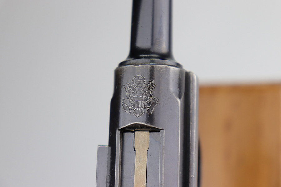 12/16/22 – This is a rare American Eagle Army Test luger, produced by DWM. In April of 1901, the United States Board of Ordnance and Fortifications put in an order for 1,000 of these lugers following test trials in which the model was fired 2,000 times under the harshest conditions possible. These lugers feature the Great Seal over the chamber, which was not included upon request, but rather was found to be a great sales tool for the Swiss market by DWM following their initial sales of the same model but featuring the Swiss sunburst. The characteristics that separate these American Test Eagle lugers from the other Model 1900 lugers are the lack of proofs, the lack of a ‘GERMANY’ import stamp, and the last two digits of the serial number on the right end of the takedown lever. There has been much research, including expert’s ranges on pistols that meet many of the Army Test luger characteristics but are not in the most commonly accepted range. This particular pistol is in the “extended” Bannerman serial range. It is all matching and has all the proper characteristics. It has retained about 80+% of its original finish. There is spotty wear on both straps, sides of the barrel, sideplate and rails. The original matching grips are present, and the left panel has a chip under the safety. The front sight is a Lyman replacement. Unmarked wood base mag with a few dings in it. The bore has good rifling with minor frost throughout.