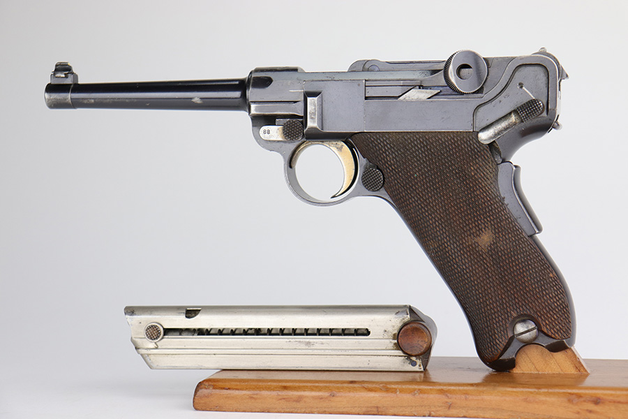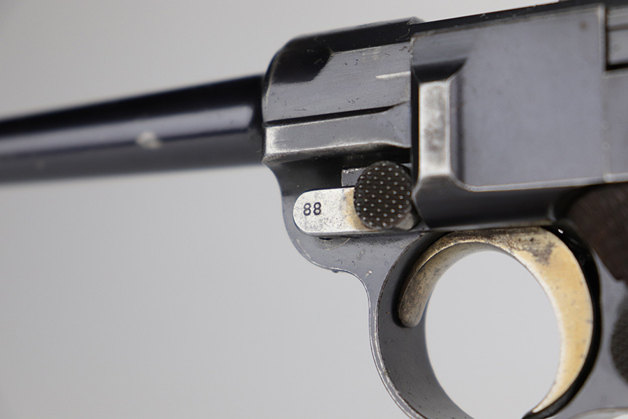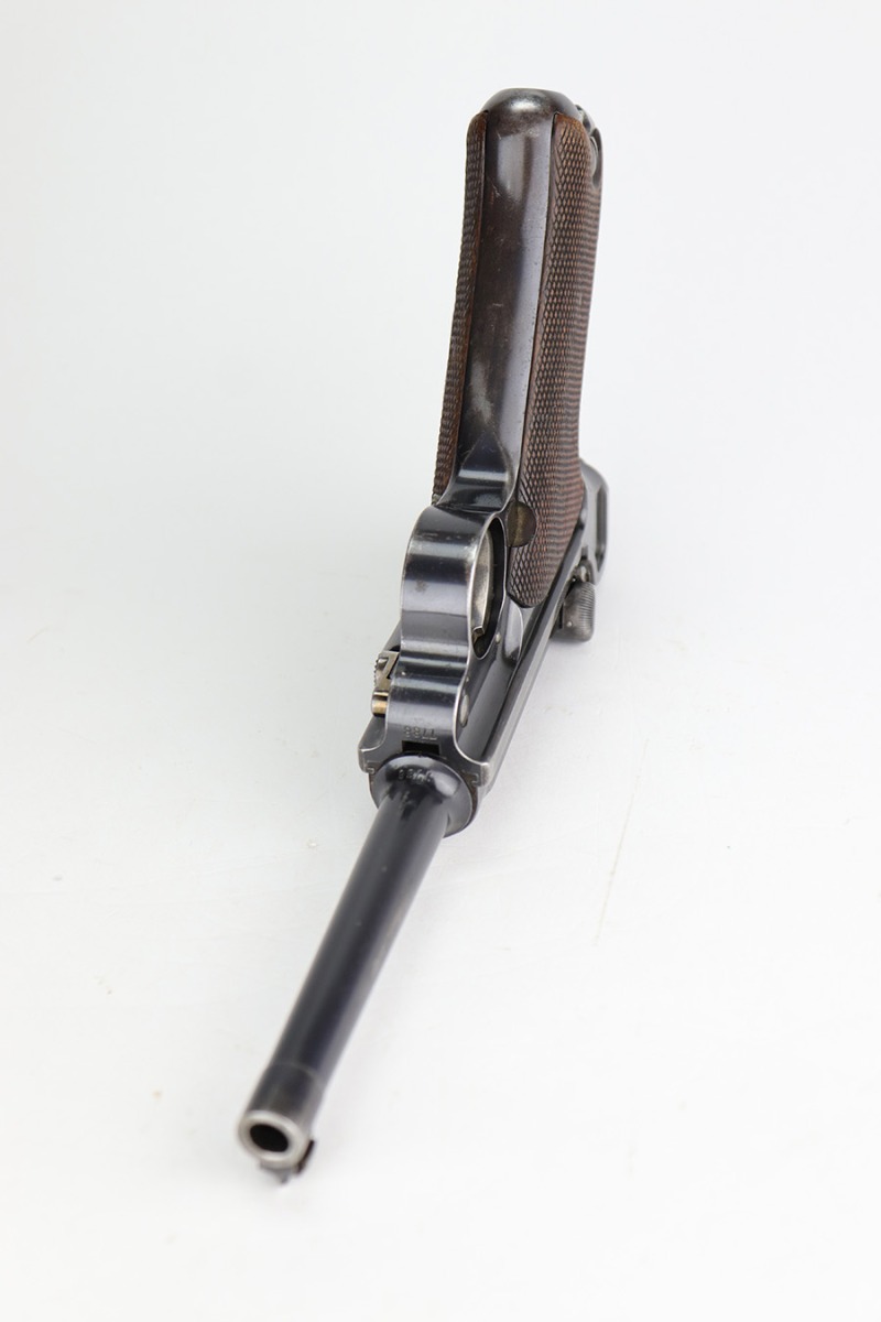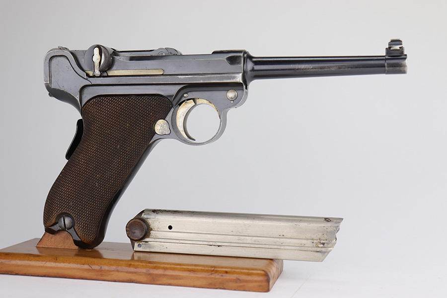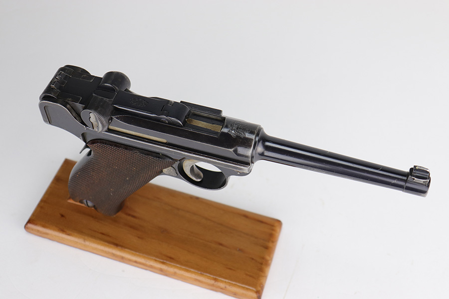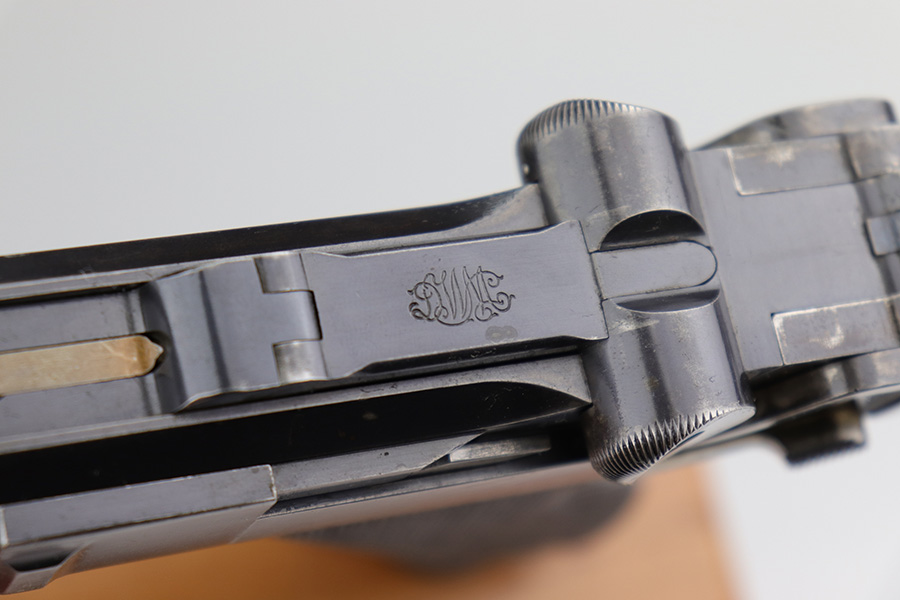 12/16/22 – This is a rare American Eagle Army Test luger, produced by DWM. In April of 1901, the United States Board of Ordnance and Fortifications put in an order for 1,000 of these lugers following test trials in which the model was fired 2,000 times under the harshest conditions possible. These lugers feature the Great Seal over the chamber, which was not included upon request, but rather was found to be a great sales tool for the Swiss market by DWM following their initial sales of the same model but featuring the Swiss sunburst. The characteristics that separate these American Test Eagle lugers from the other Model 1900 lugers are the lack of proofs, the lack of a ‘GERMANY’ import stamp, and the last two digits of the serial number on the right end of the takedown lever. There has been much research, including expert’s ranges on pistols that meet many of the Army Test luger characteristics but are not in the most commonly accepted range. This particular pistol is in the “extended” Bannerman serial range. It is all matching and has all the proper characteristics. It has retained about 80+% of its original finish. There is spotty wear on both straps, sides of the barrel, sideplate and rails. The original matching grips are present, and the left panel has a chip under the safety. The front sight is a Lyman replacement. Unmarked wood base mag with a few dings in it. The bore has good rifling with minor frost throughout.