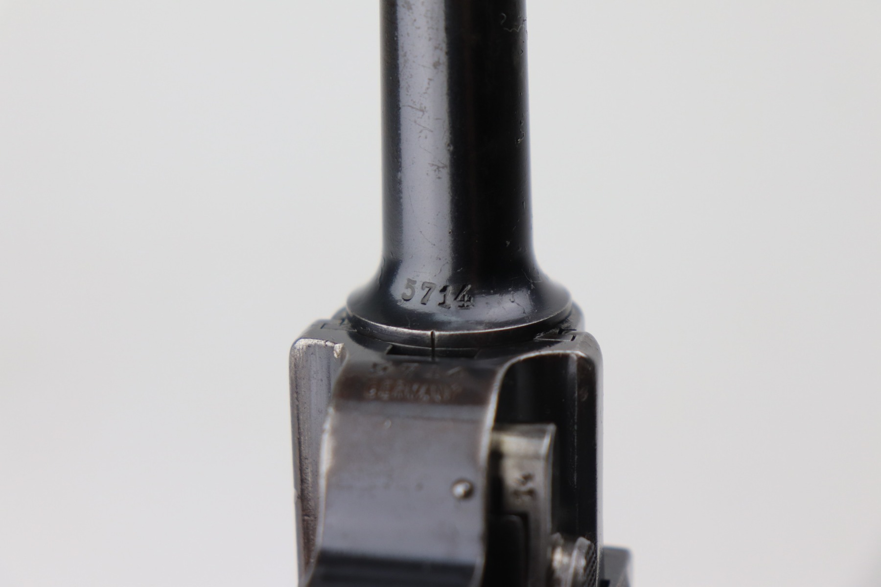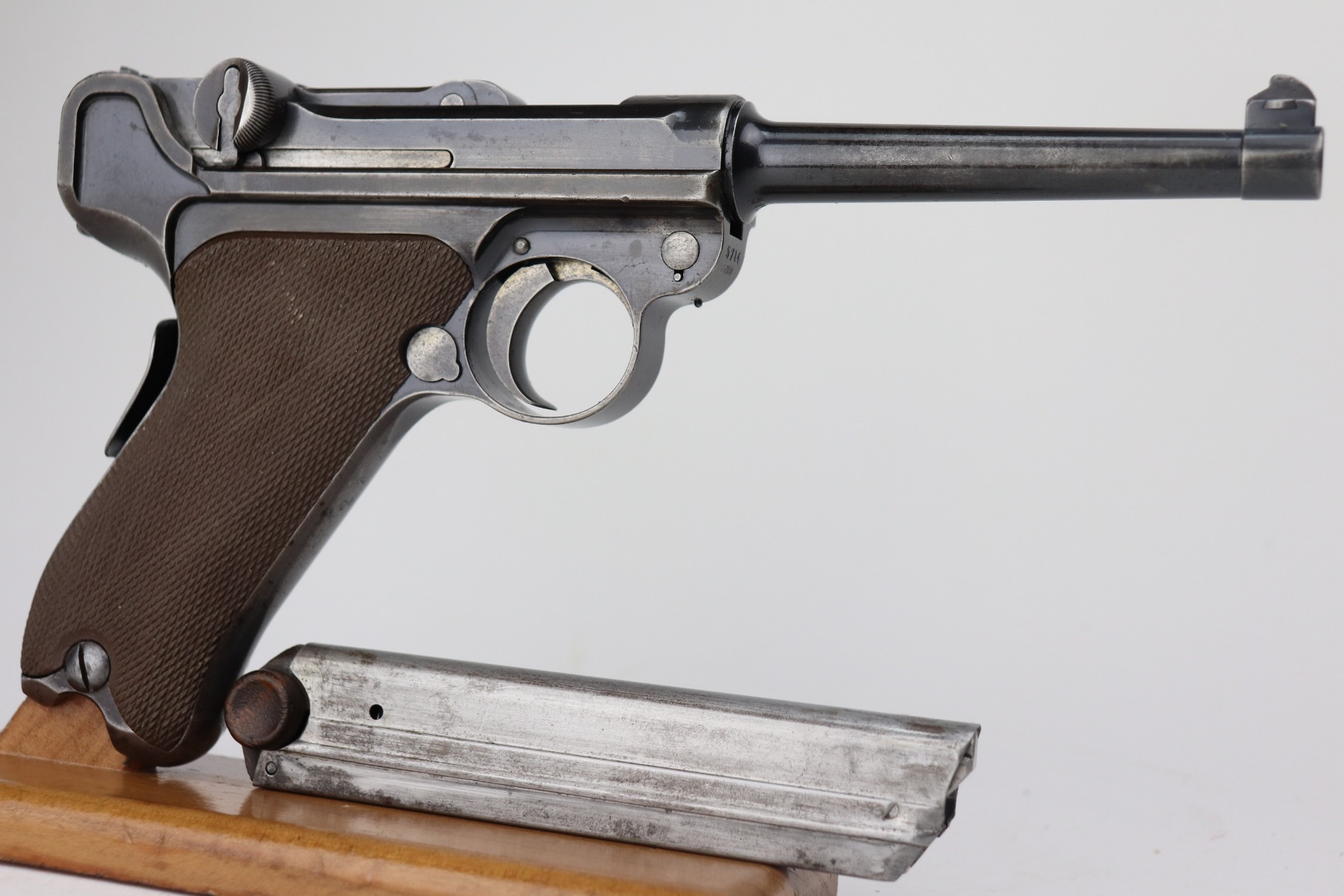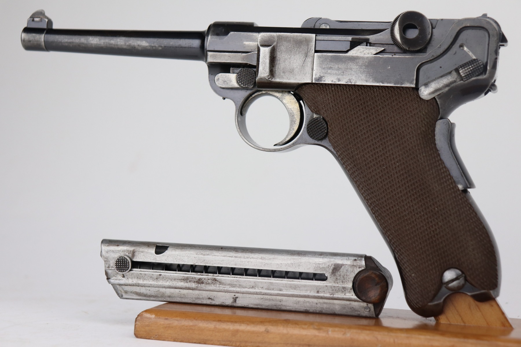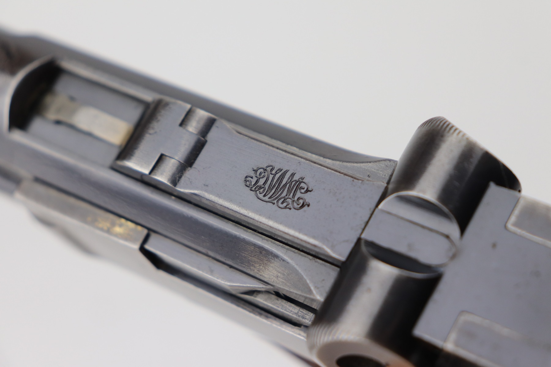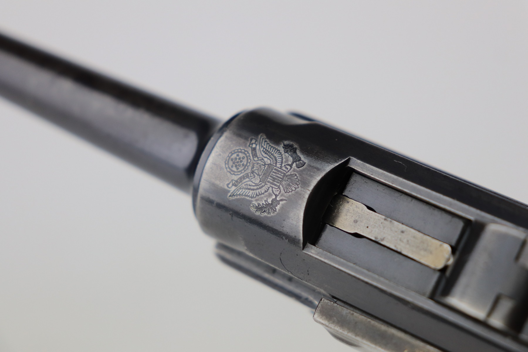 3/19/21 – This is a nice example of a DWM Model 1900 American Eagle Luger sold in the commercial market in the early 1900’s. This is the first production model of this variation, made in or around 1900 with early dish toggle. These pistols went to the US retail market and the manufacturers at DWM realized that nation-based crests increased sales of these lugers, so that is why you find the American Eagle over the chamber. This is also why you see GERMANY marked on the frame, denoting these were exported for commercial sale. This particular gun was made just before the military test-eagle variation. It is all matching and has retained roughly 45% of its original finish. There is significant wear on the straps, side plate, and sides of the frame. Spotty wear around the high edges and on the barrel. Spotty oxidation here and there, most noticeable on the barrel and left side of the gun. Comes with excellent grips and an un-marked magazine. The right side of the mag bottom is a little worn down. Decently rifling in the bore with pin-pricking throughout.