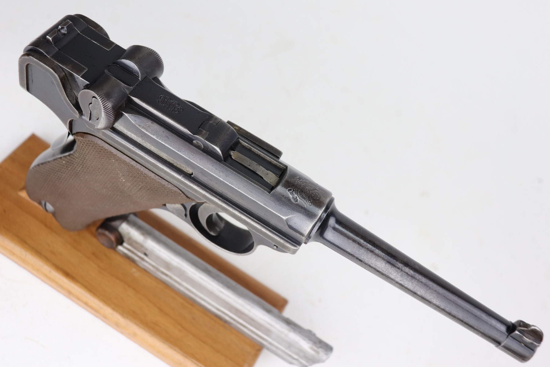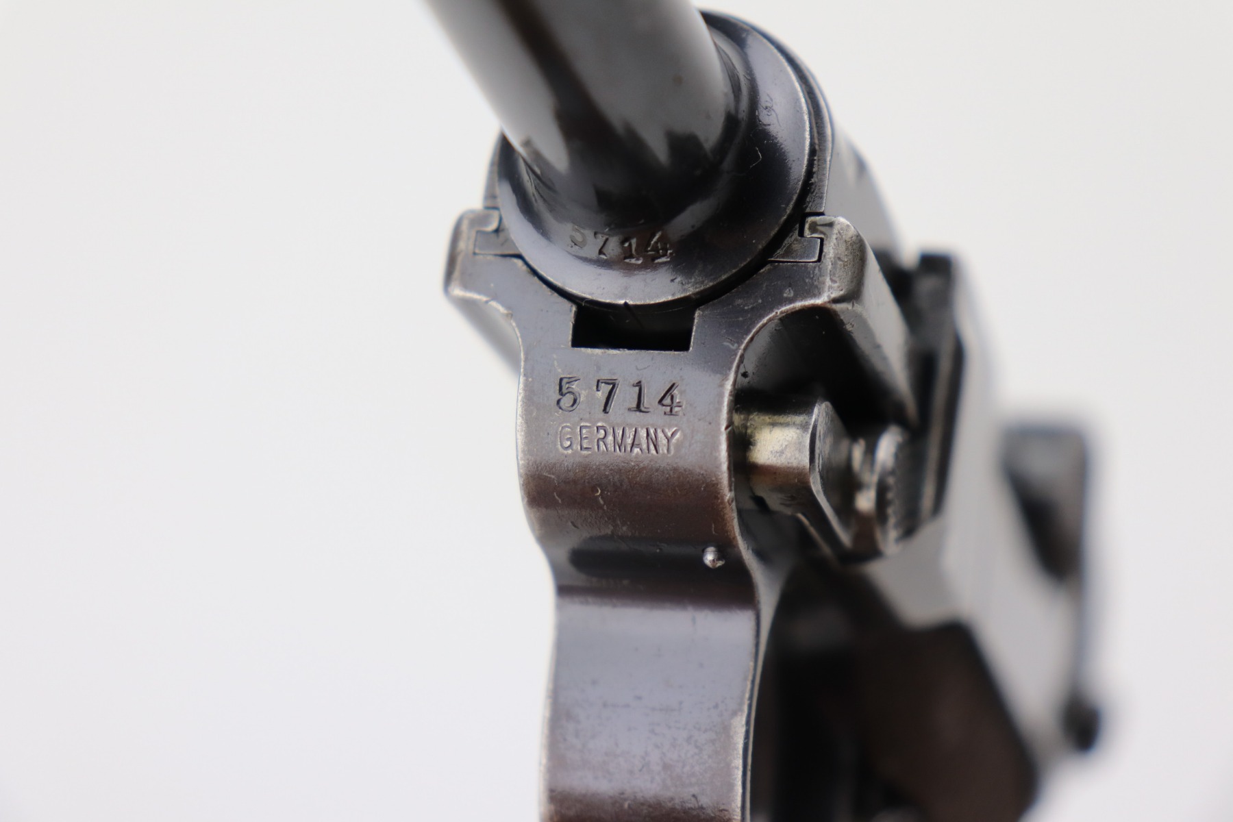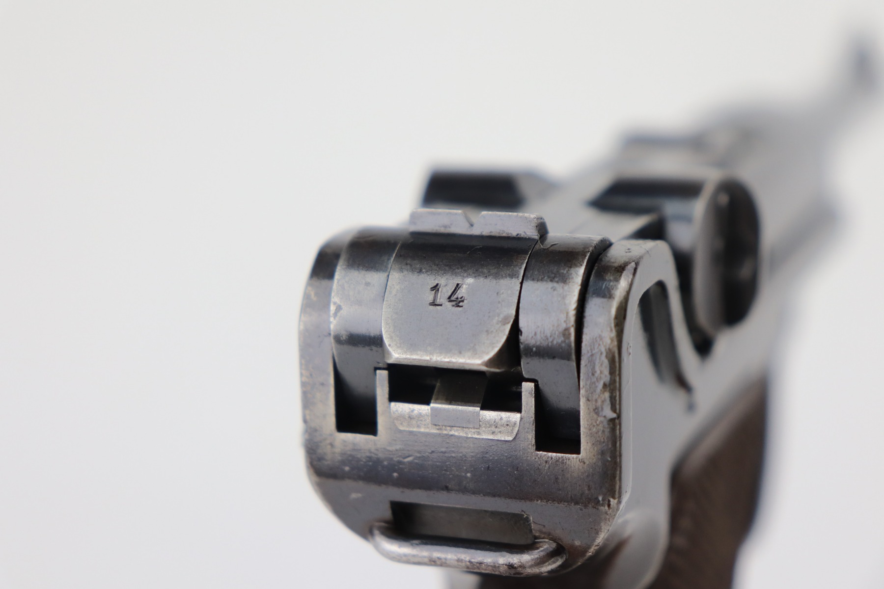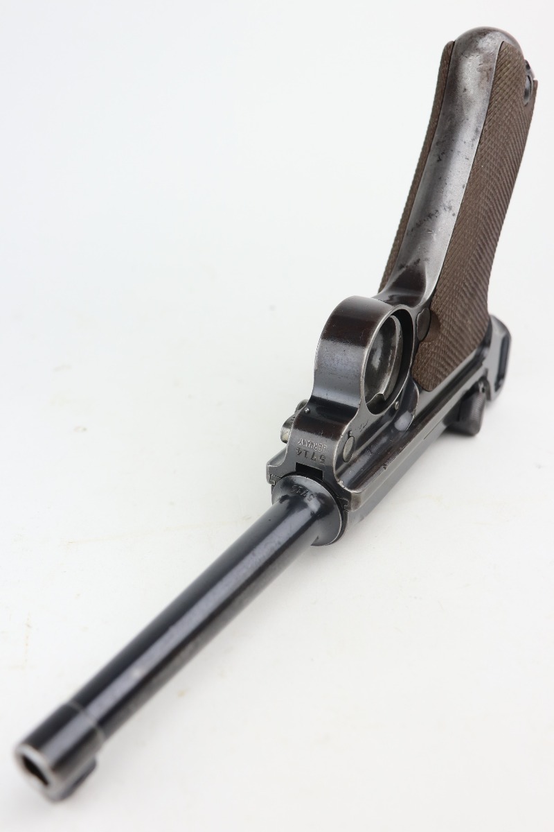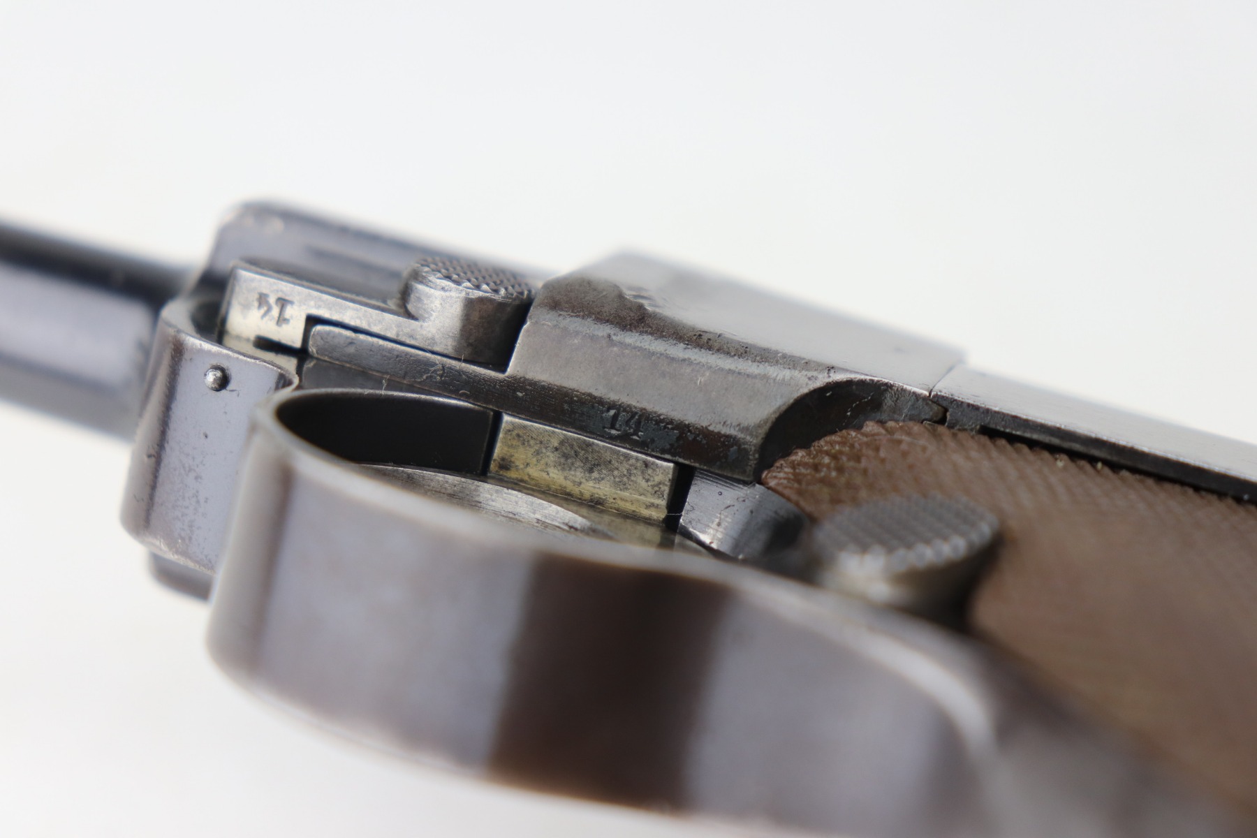 3/19/21 – This is a nice example of a DWM Model 1900 American Eagle Luger sold in the commercial market in the early 1900’s. This is the first production model of this variation, made in or around 1900 with early dish toggle. These pistols went to the US retail market and the manufacturers at DWM realized that nation-based crests increased sales of these lugers, so that is why you find the American Eagle over the chamber. This is also why you see GERMANY marked on the frame, denoting these were exported for commercial sale. This particular gun was made just before the military test-eagle variation. It is all matching and has retained roughly 45% of its original finish. There is significant wear on the straps, side plate, and sides of the frame. Spotty wear around the high edges and on the barrel. Spotty oxidation here and there, most noticeable on the barrel and left side of the gun. Comes with excellent grips and an un-marked magazine. The right side of the mag bottom is a little worn down. Decently rifling in the bore with pin-pricking throughout.
