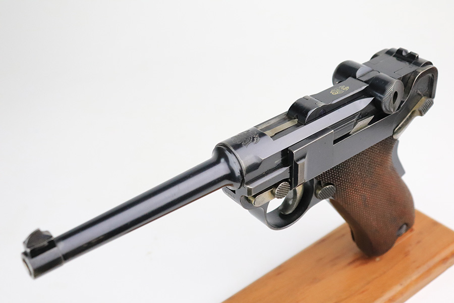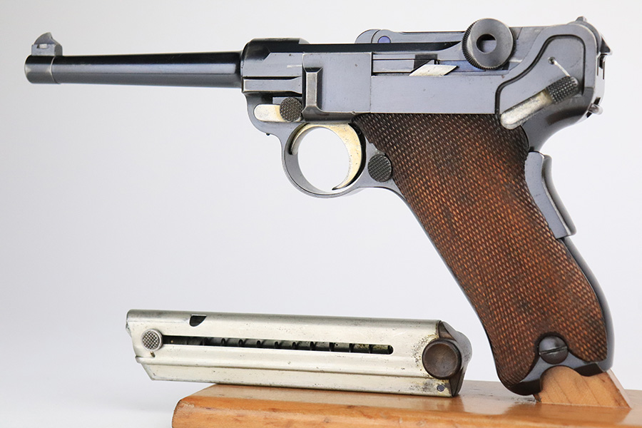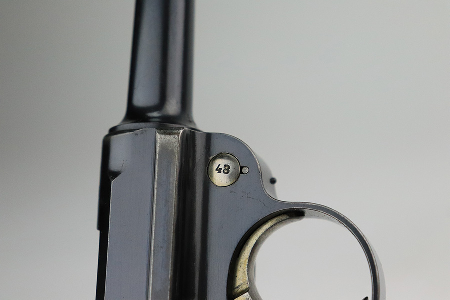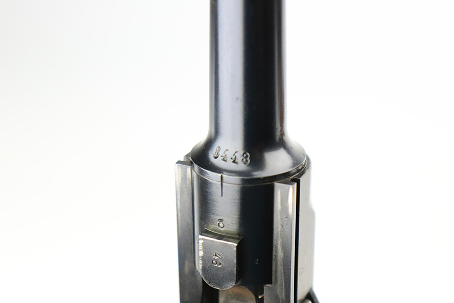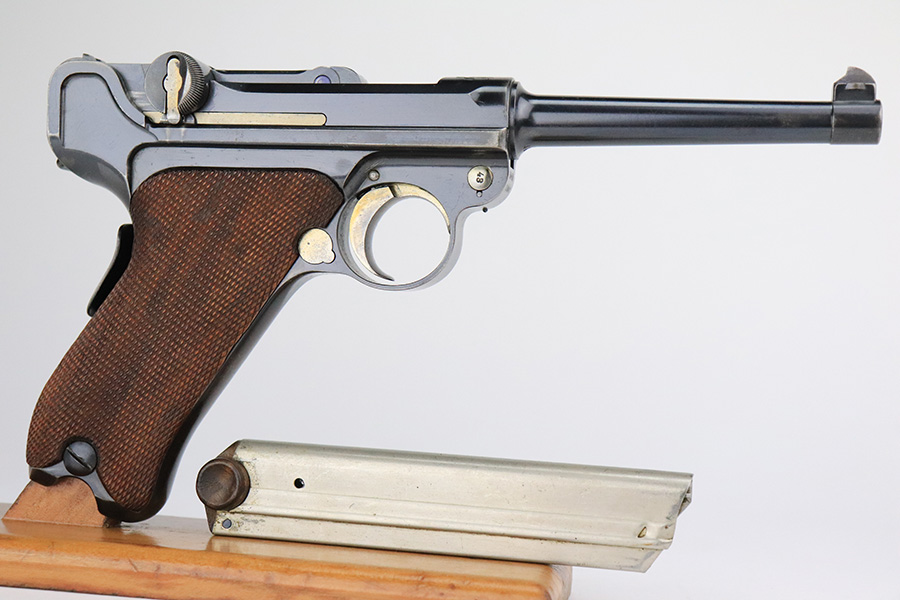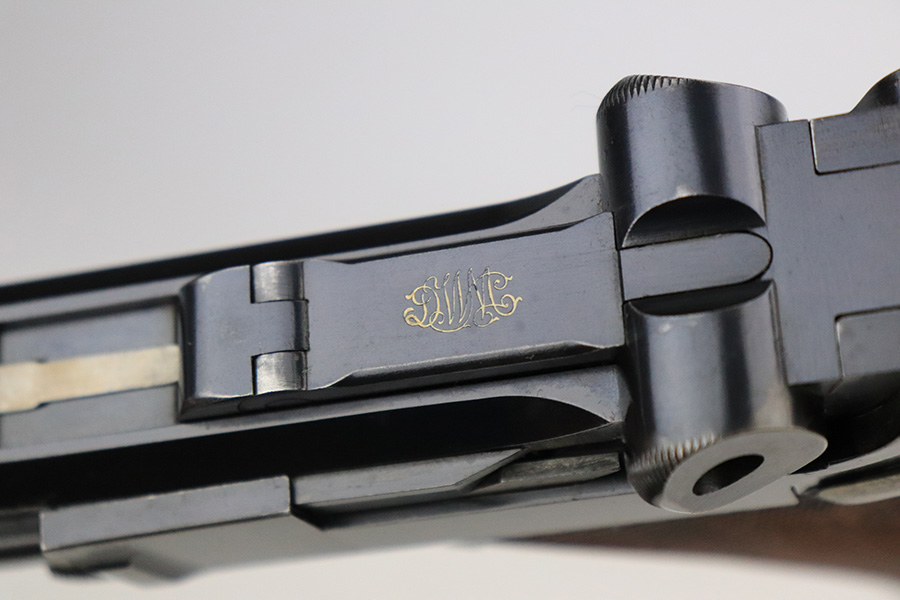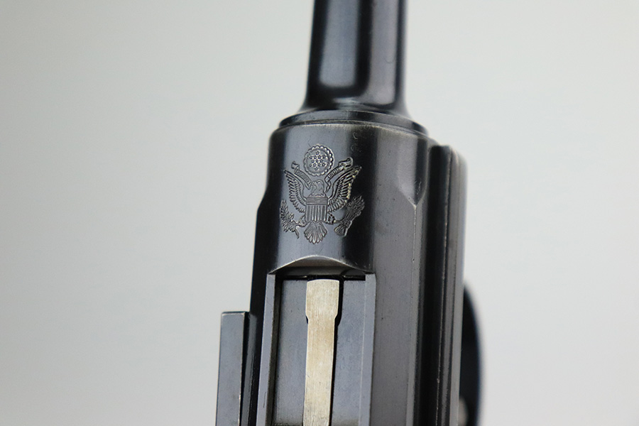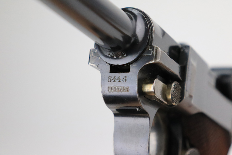 7/13/22 – This is a rare DWM model 1900 luger with American Eagle crest on the chamber. This is the first production model of this variation, made in or around 1900 with early dish toggle. These pistols went to the US retail market and the manufacturers at DWM realized that nation-based crests increased sales of these lugers, so that is why you find the American Eagle over the chamber. This is also why you see GERMANY marked on the frame, denoting these were exported for commercial sale. This one is all matching and has retained about 93% of its original finish. Most of the finish loss is on the grip straps, where there is also some light brown patina. Very light wear on side plate, side rails, and around the muzzle. A few tiny spots of wear along the barrel. Comes with minty wood grips and a mismatched magazine. The bore has decent rifling with very minor pin-pricking throughout.