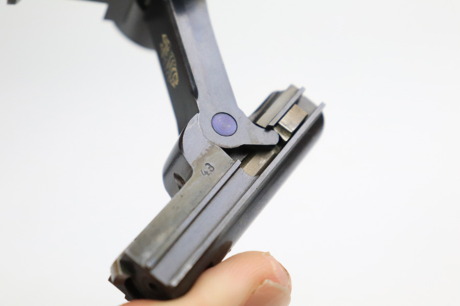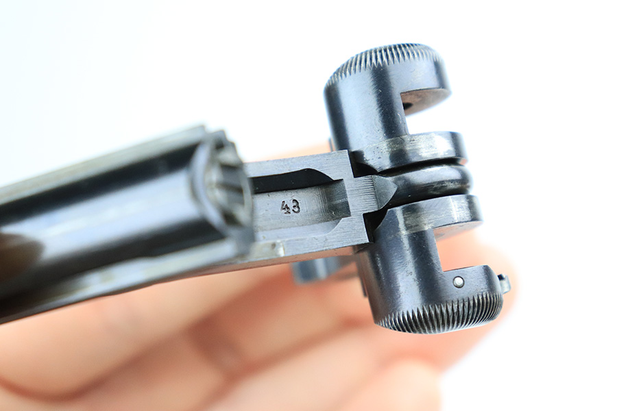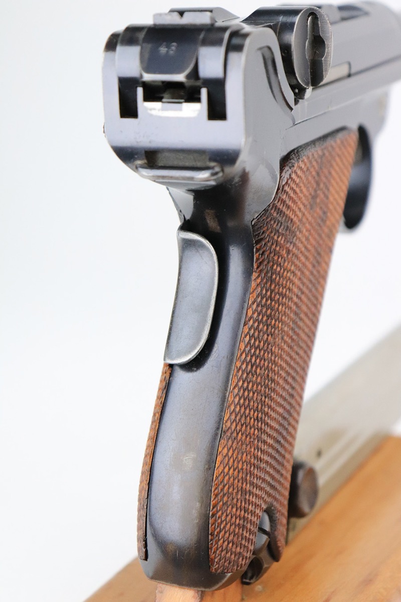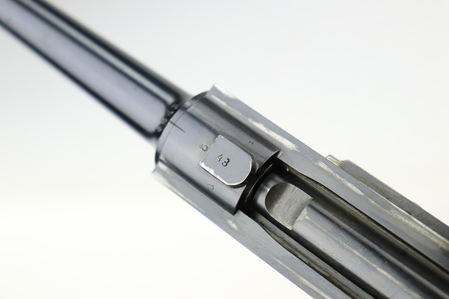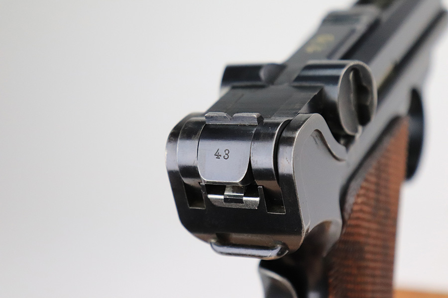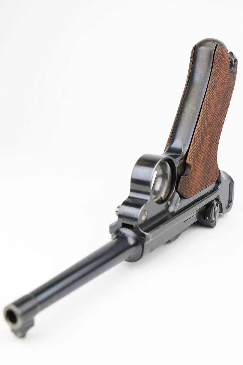 7/13/22 – This is a rare DWM model 1900 luger with American Eagle crest on the chamber. This is the first production model of this variation, made in or around 1900 with early dish toggle. These pistols went to the US retail market and the manufacturers at DWM realized that nation-based crests increased sales of these lugers, so that is why you find the American Eagle over the chamber. This is also why you see GERMANY marked on the frame, denoting these were exported for commercial sale. This one is all matching and has retained about 93% of its original finish. Most of the finish loss is on the grip straps, where there is also some light brown patina. Very light wear on side plate, side rails, and around the muzzle. A few tiny spots of wear along the barrel. Comes with minty wood grips and a mismatched magazine. The bore has decent rifling with very minor pin-pricking throughout.