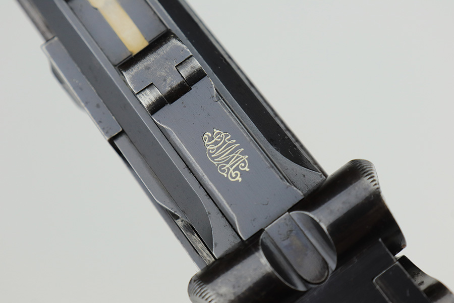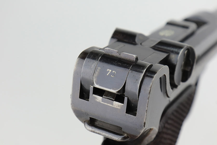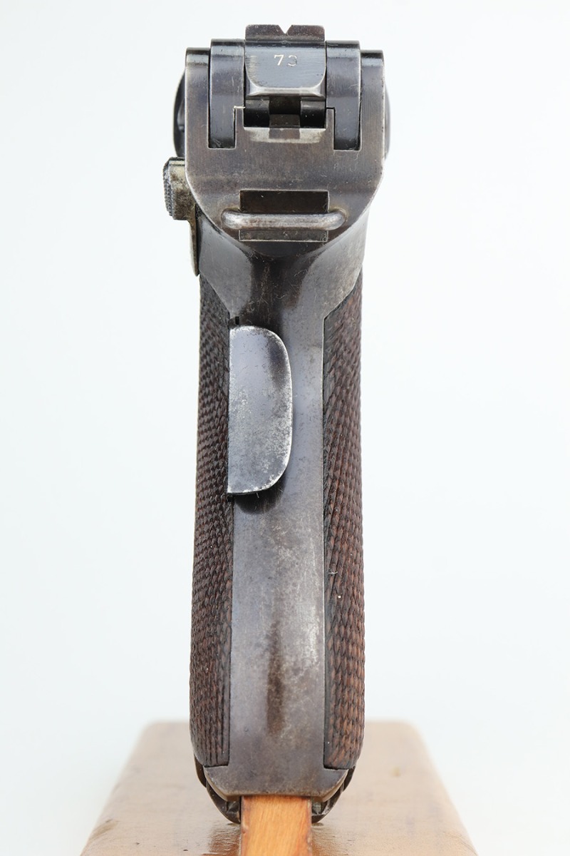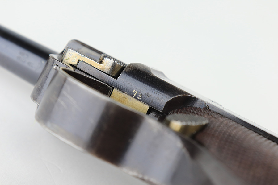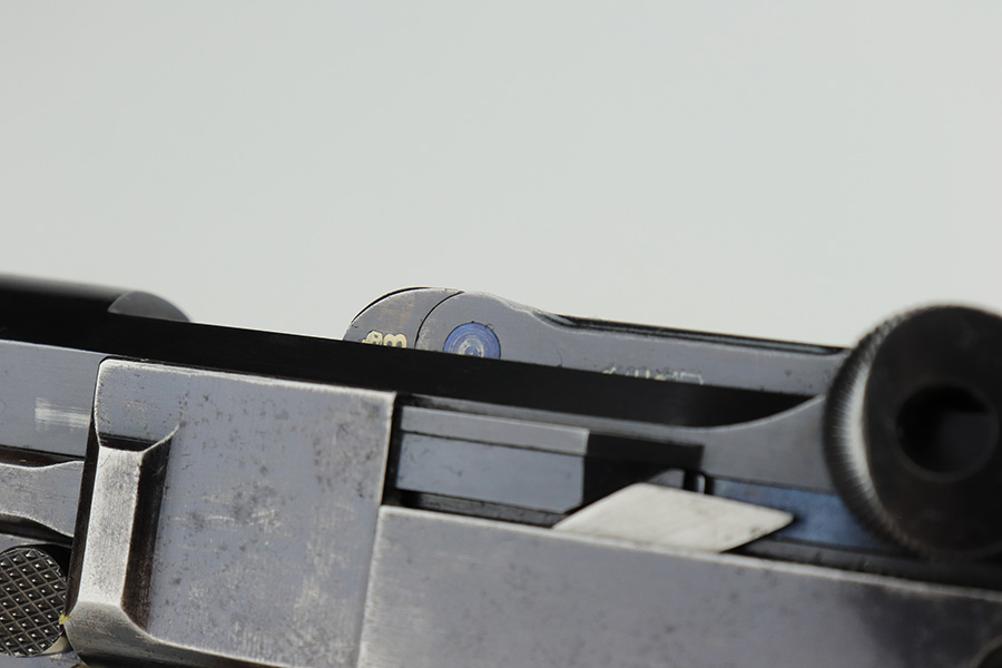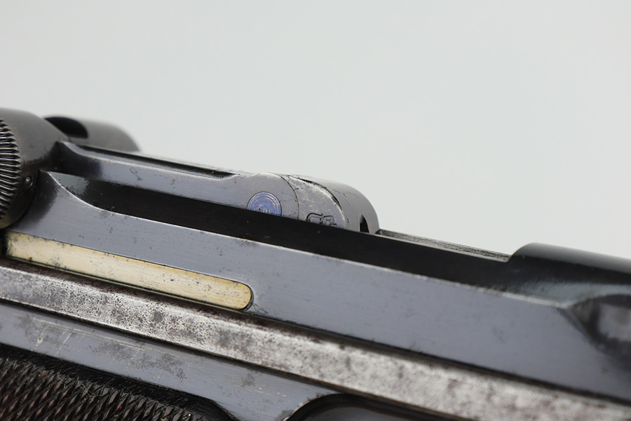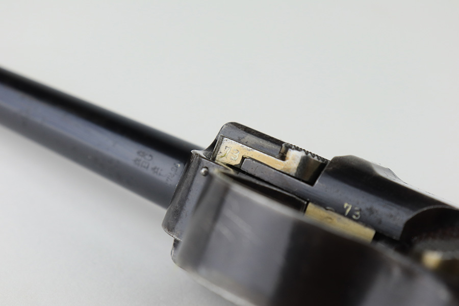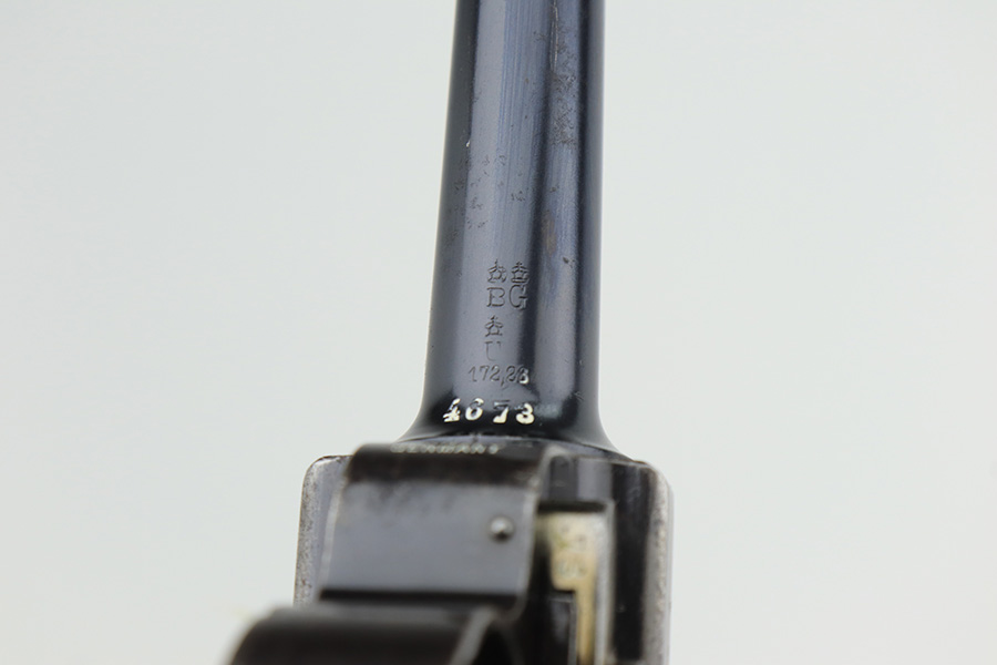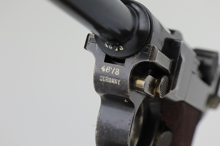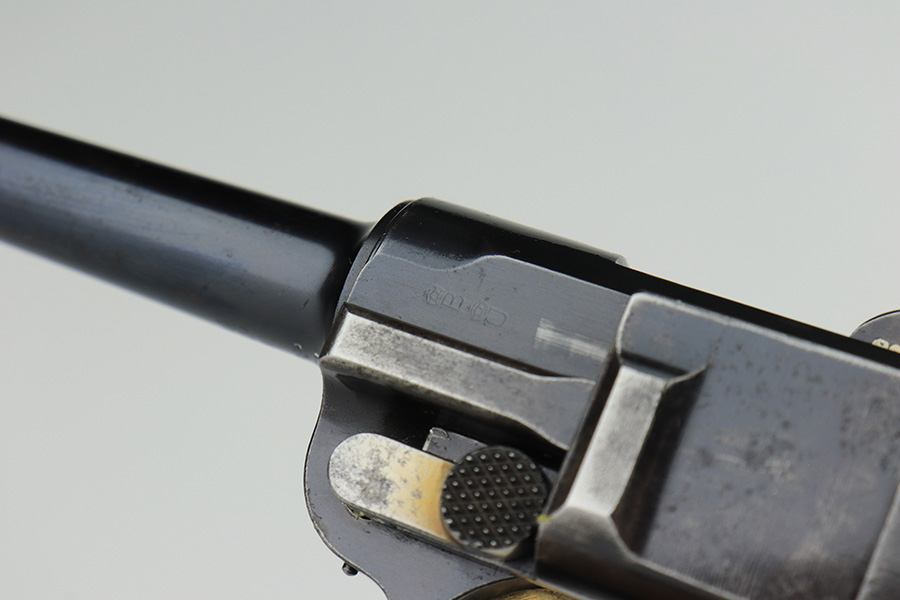 3/2/23 – This is a nice example of a commercial DWM Model 1900 Luger. The gun is all matching and has the proper “Crown BUG” proofs throughout. “Germany” export mark on the frame. It has retained roughly 85% of its original finish. There are areas of finish loss around the muzzle, on the left side of the frame, on the right side rail, and on both grip straps. Spotty oxidation on the grip straps as well. Some light oxidation and pin-pricking on the right side rail. Fitted with excellent matching-numbered grips and comes with one mismatched military magazine. The bore has good rifling with minor frosting throughout.