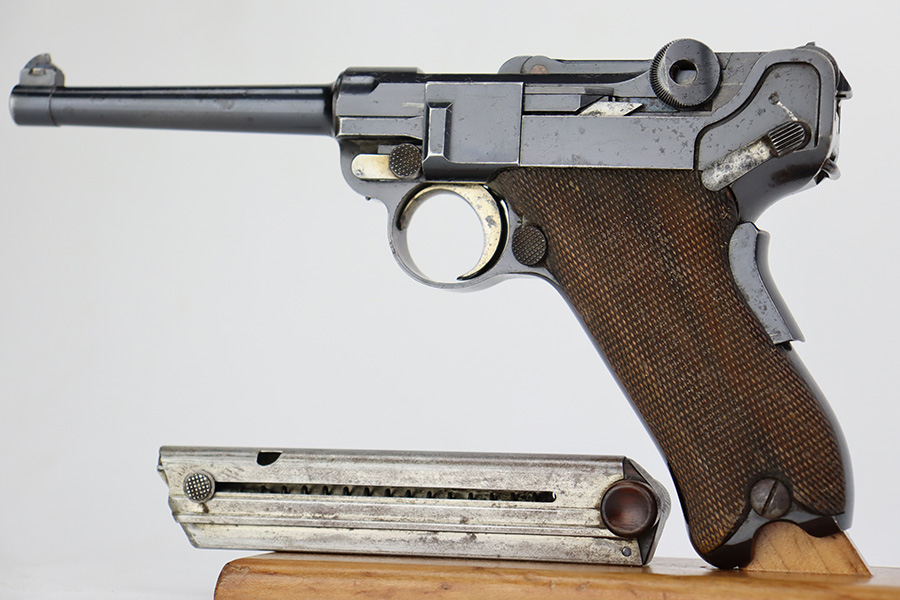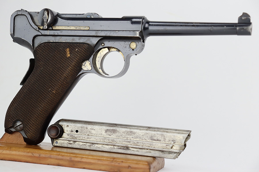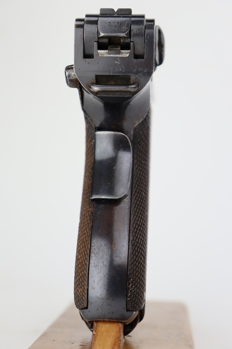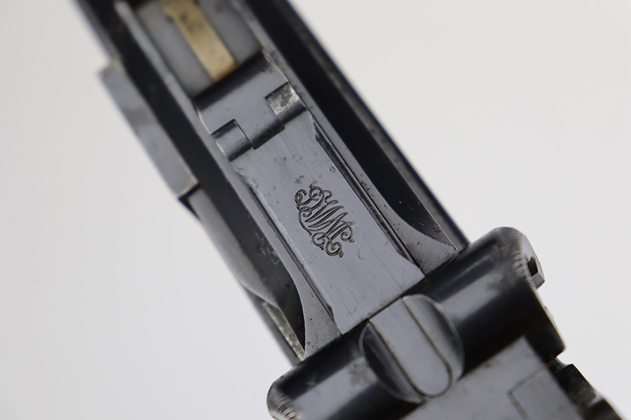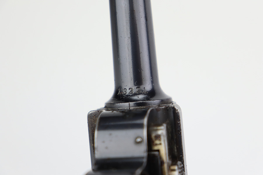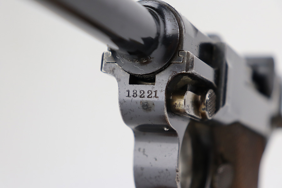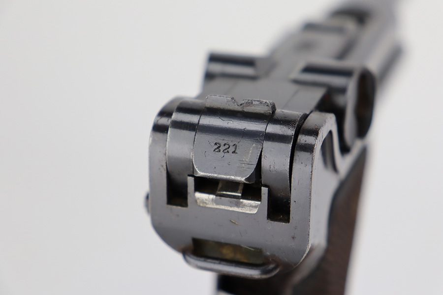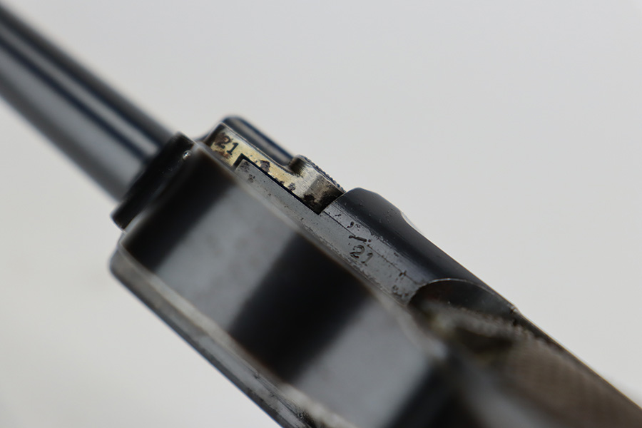 7/28/23 – This is a nice example of a commercial DWM Model 1900 Luger. The gun is all matching, but oddly enough, there are no proof marks anywhere on the gun. It has retained roughly 90% of its original finish with areas of wear around the muzzle and on the high edges in general. Some scratchy wear on the front strap. Brown patina on the grip straps. There are some areas of spotty oxidation here and there. The heaviest oxidation is along the barrel, where there is also minor pitting. Fitted with very nice matching-numbered wood grips – a couple of small blemishes on the right side. Comes with an un-marked magazine – one tiny hairline crack in the base. The bore has decent rifling, but there is pin-pricking throughout.