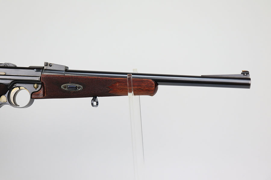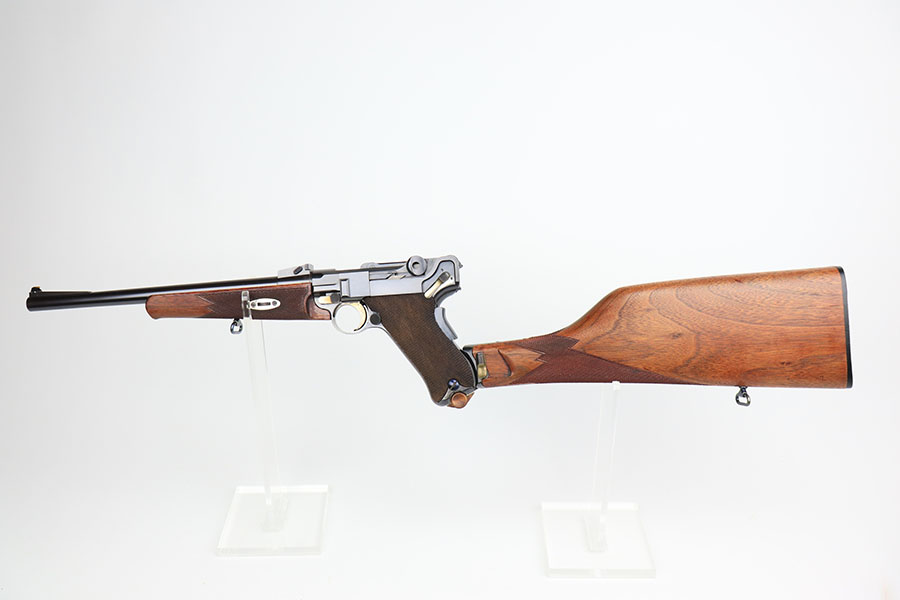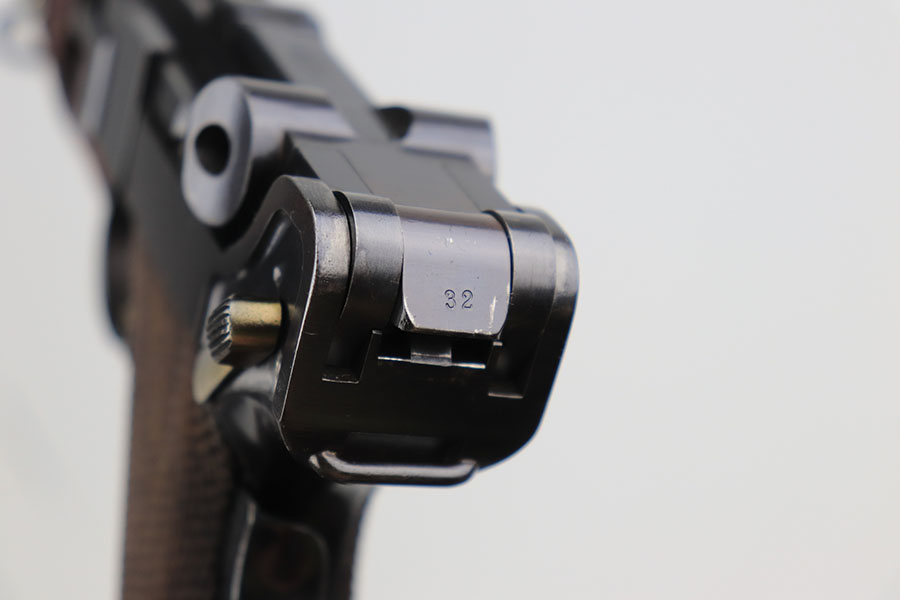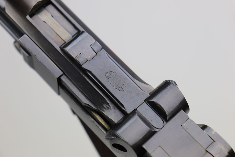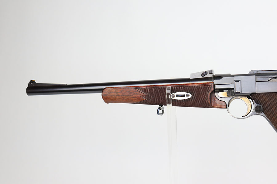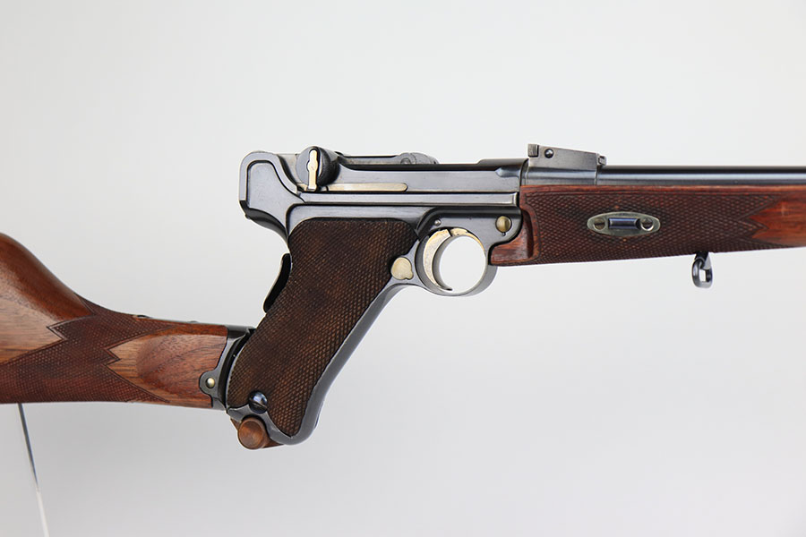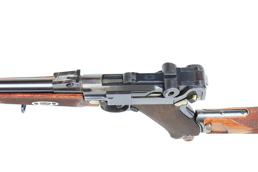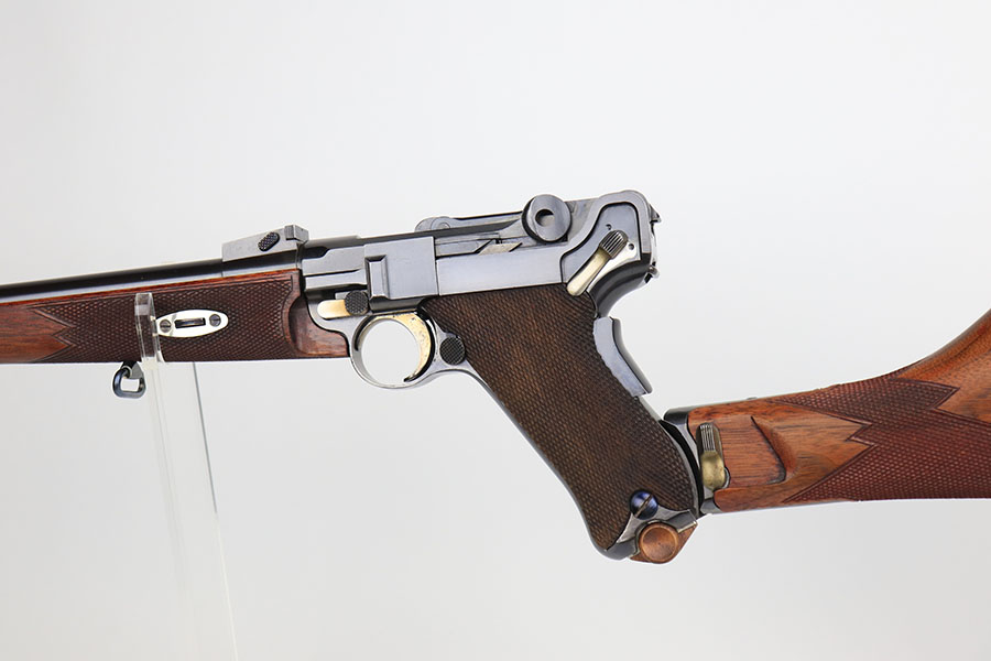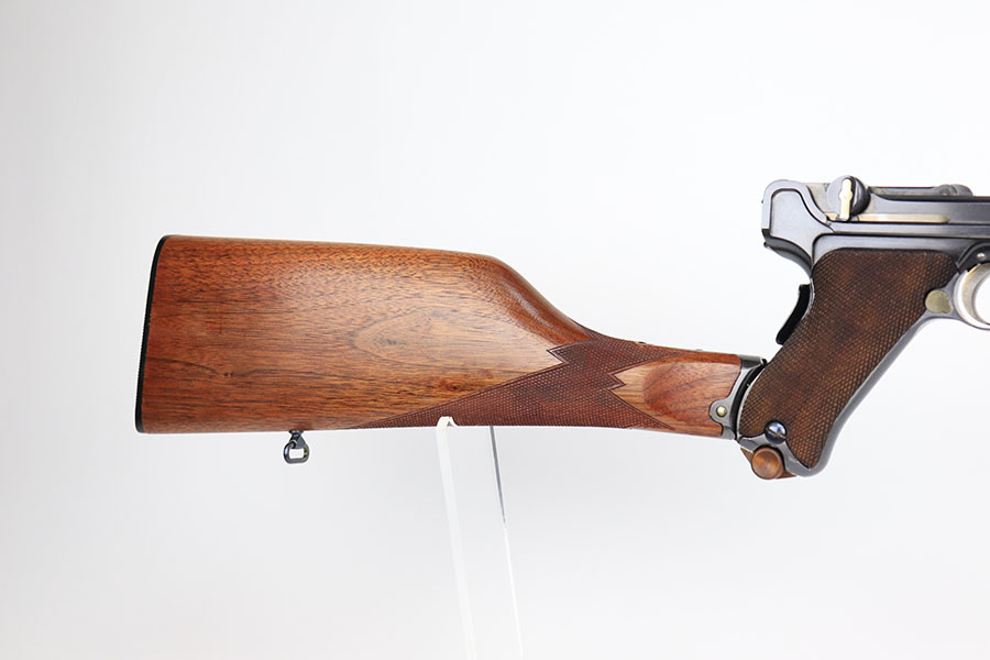 1/20/21 – This is a fantastic example of an early production DWM Model 1902 Luger carbine that is complete with it’s original matching walnut shoulder stock. Approximately 2,500 were manufactured, beginning with serial 21,000. All these early carbines exhibit the very desirable early features such the long frame, flat mainspring, grip safety, dished toggles, toggle lock on the right side, recessed/flat breech bolt, and flat straw colored extractor. One of the most unique features is the 11 3/4 inch carbine barrel with a detachable checkered forearm. The underside of the barrel is fitted with a small lug that engages a small spring actuator located inside the forearm that helps to cycle the heavier carbine barrel during firing. No other Luger has this feature. The top of the chamber is blank, and the front toggle has the standard DWM logo. Fitted with the correct 3-position rear sight (adjustable from 100-300 meters) and a small ramp front sight base fitted with a bead front sight. The full serial number is correctly marked on the frame extension and barrel underside. The last digits of the serial number are discretely marked on the various parts in the correct commercial manner. It is complete with an original matching numbered walnut shoulder stock that has a fine checkered pattern in the grip area and horn buttplate. Comes with one original commercial magazine with a correct unnumbered wood base. The finish rates at 98-99% with just a bit of finish loss on the stock lug and ears of receiver. Bore is stone mint, looks unfired. The grips are unnumbered but in terrific condition. The grip safety has a little freckling on it, and after further inspection appears to have been replaced. The two digit serial that is hidden by the grip panel appears renumbered or overstamped.
