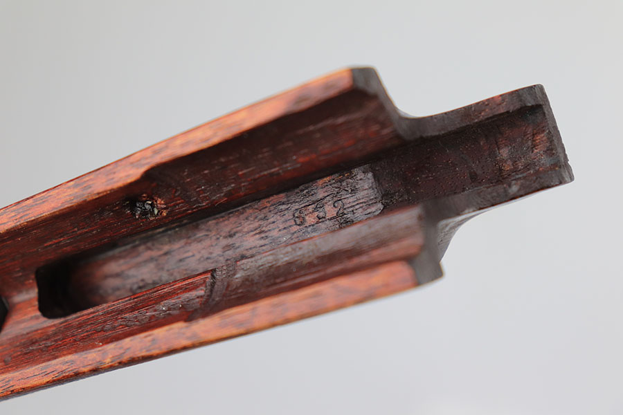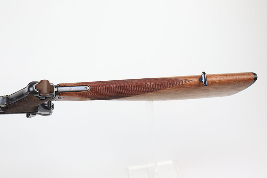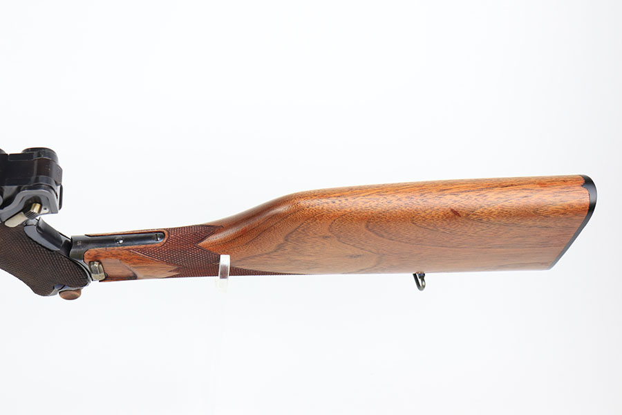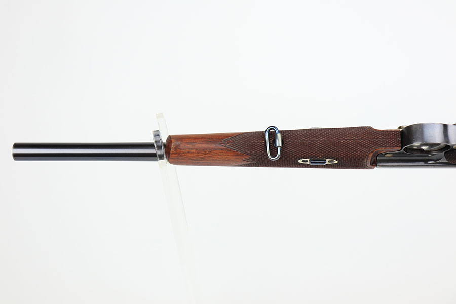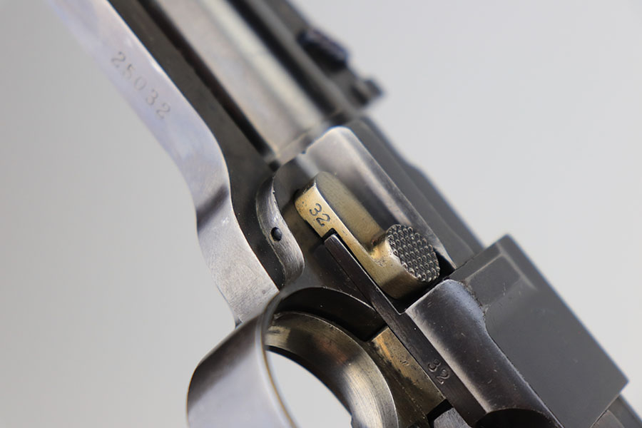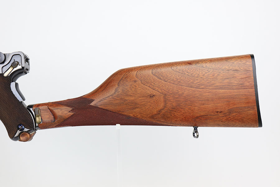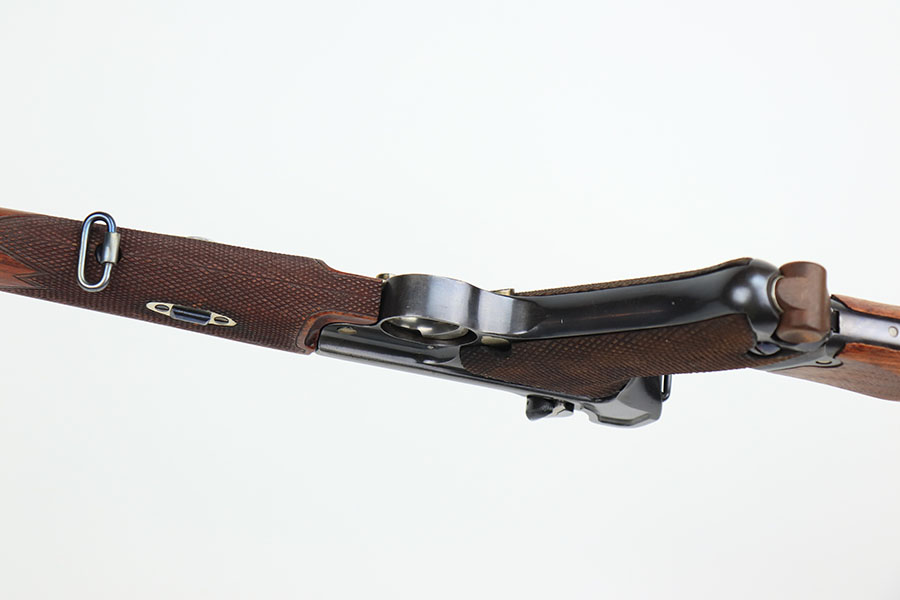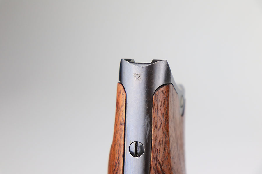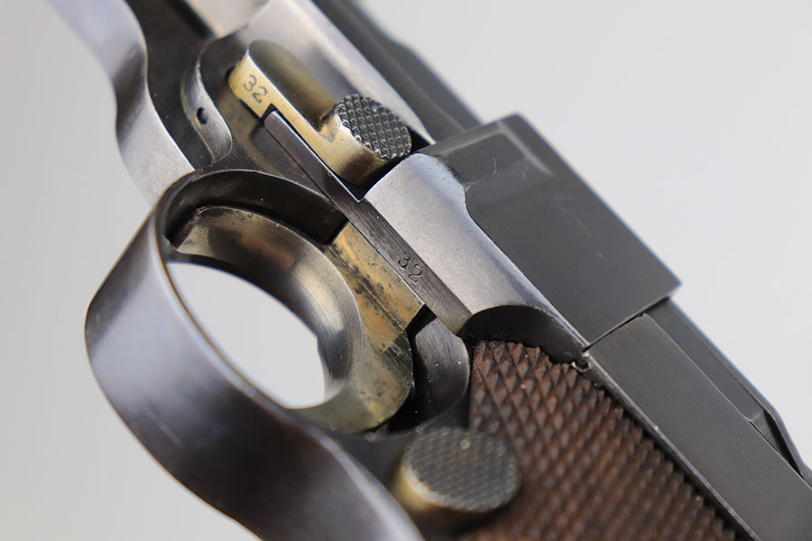 1/20/21 – This is a fantastic example of an early production DWM Model 1902 Luger carbine that is complete with it’s original matching walnut shoulder stock. Approximately 2,500 were manufactured, beginning with serial 21,000. All these early carbines exhibit the very desirable early features such the long frame, flat mainspring, grip safety, dished toggles, toggle lock on the right side, recessed/flat breech bolt, and flat straw colored extractor. One of the most unique features is the 11 3/4 inch carbine barrel with a detachable checkered forearm. The underside of the barrel is fitted with a small lug that engages a small spring actuator located inside the forearm that helps to cycle the heavier carbine barrel during firing. No other Luger has this feature. The top of the chamber is blank, and the front toggle has the standard DWM logo. Fitted with the correct 3-position rear sight (adjustable from 100-300 meters) and a small ramp front sight base fitted with a bead front sight. The full serial number is correctly marked on the frame extension and barrel underside. The last digits of the serial number are discretely marked on the various parts in the correct commercial manner. It is complete with an original matching numbered walnut shoulder stock that has a fine checkered pattern in the grip area and horn buttplate. Comes with one original commercial magazine with a correct unnumbered wood base. The finish rates at 98-99% with just a bit of finish loss on the stock lug and ears of receiver. Bore is stone mint, looks unfired. The grips are unnumbered but in terrific condition. The grip safety has a little freckling on it, and after further inspection appears to have been replaced. The two digit serial that is hidden by the grip panel appears renumbered or overstamped.