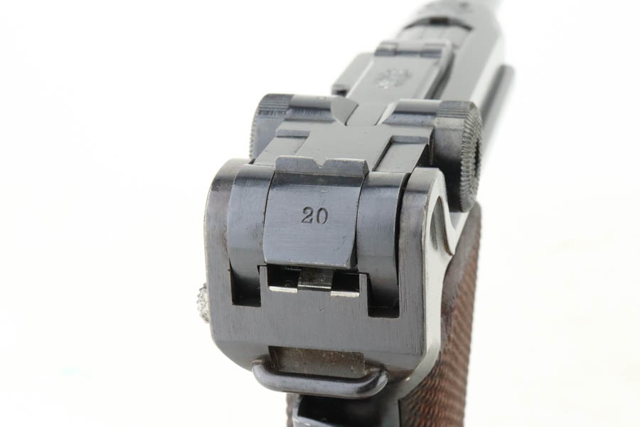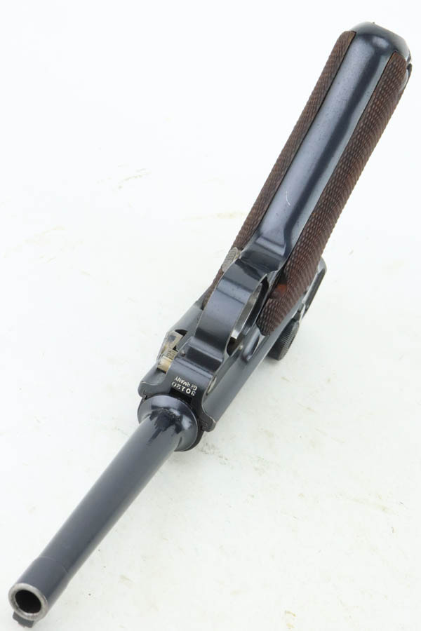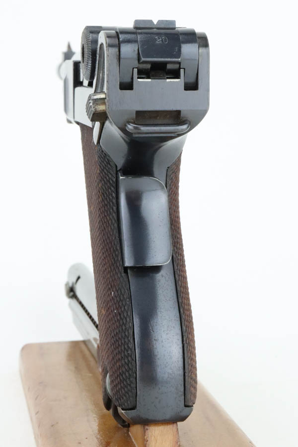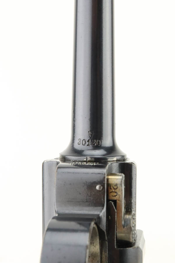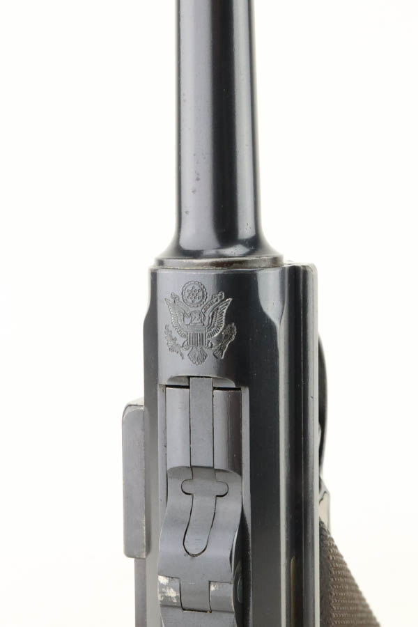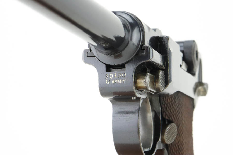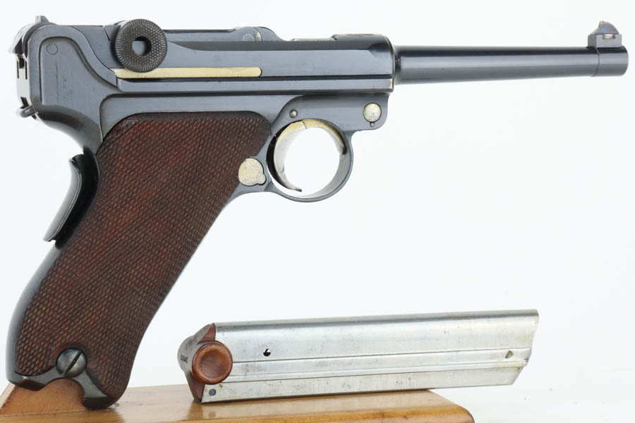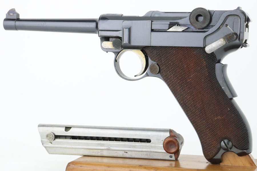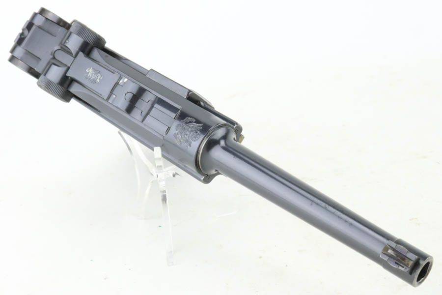 5/29/24 – This is a really nice DWM Model 1906 “American Eagle” Luger sold in the US commercial market in the early 1900’s and chambered in .30 Luger. We believe this gun has been professionally restored, so the finish is beautiful with almost not signs of wear. Fitted with minty matching-numbered wood grips. Comes with a proper “Germany” marked commercial magazine. The bore has decent rifling, but there is tiny pitting throughout.