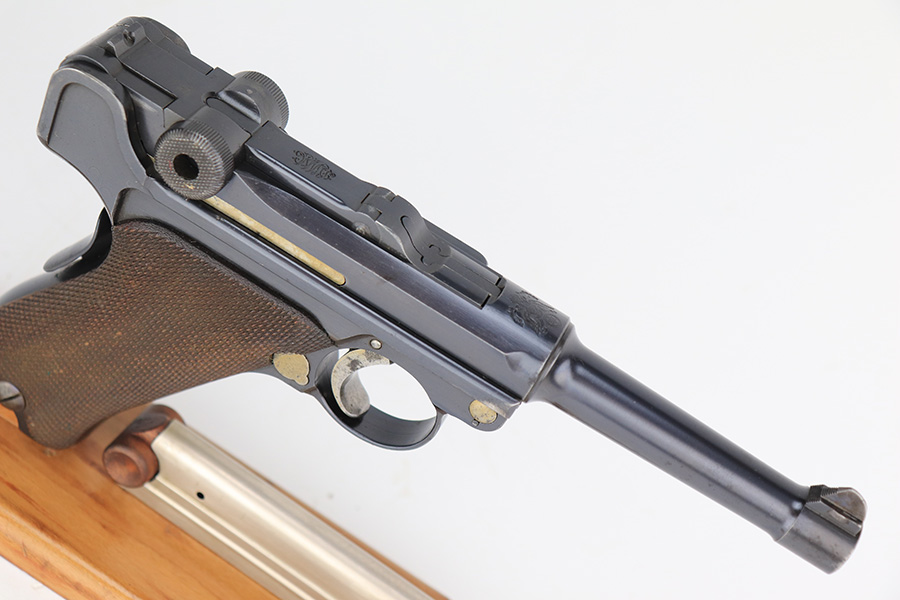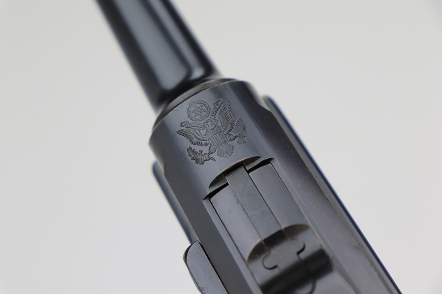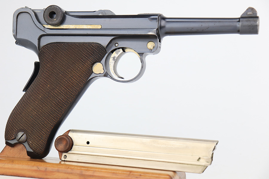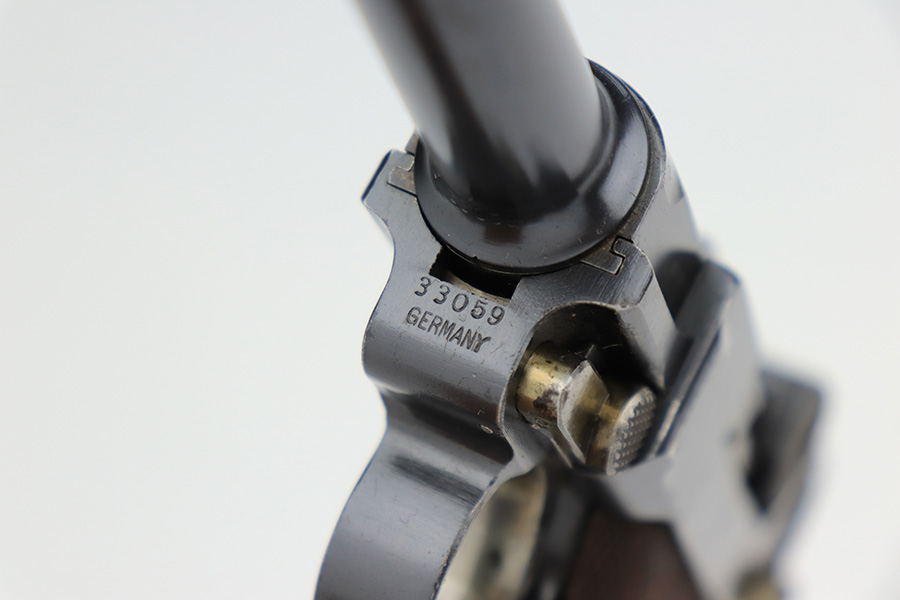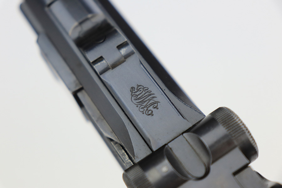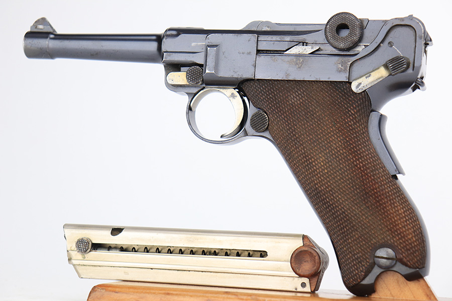 7/10/23 – This is an excellent DWM Model 1906 Luger with American Eagle crest over chamber. It’s a scarce and desirable example as it’s chambered for 9mm Luger, one of about 3,000 produced. 4″ barrel. The original blue rates at 96%. Hints of wear on some of the high edges and two spots of pitting on the left side of the frame. Light freckling on the grip straps and left side of the gun. Minty wood grips. Comes with a proper “9m/m” marked magazine. The bore has good rifling, but there is minor frosting throughout.