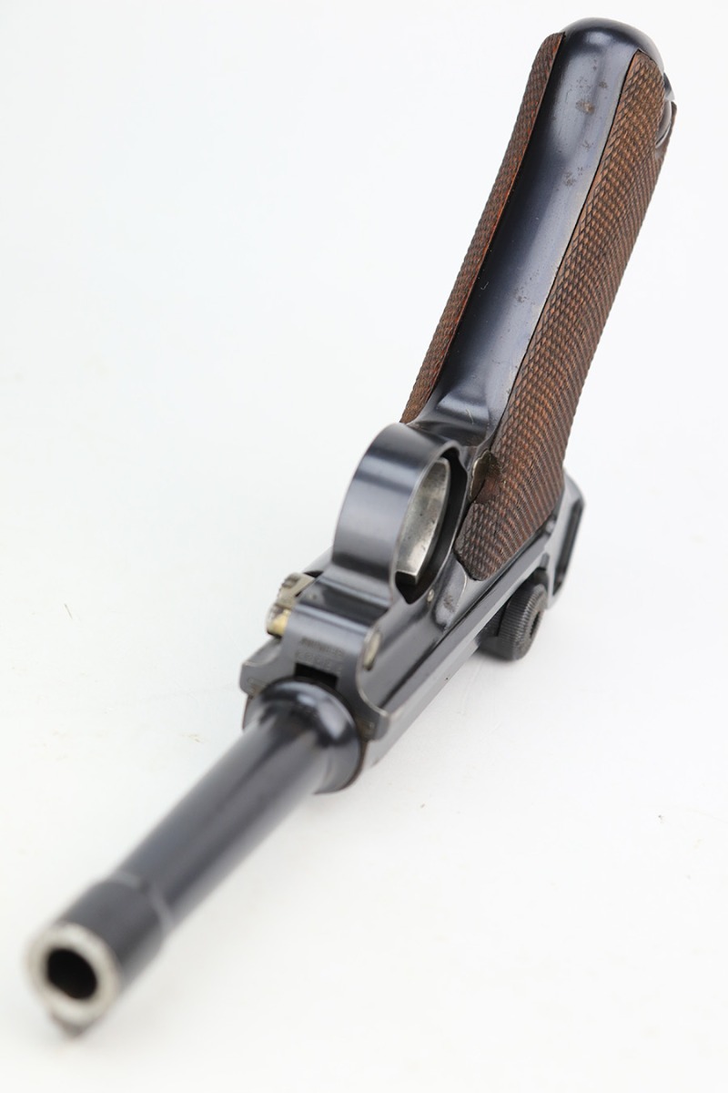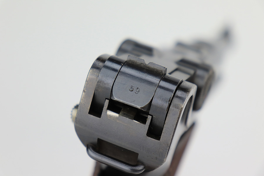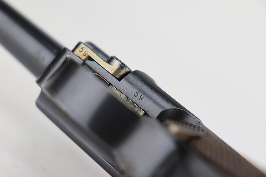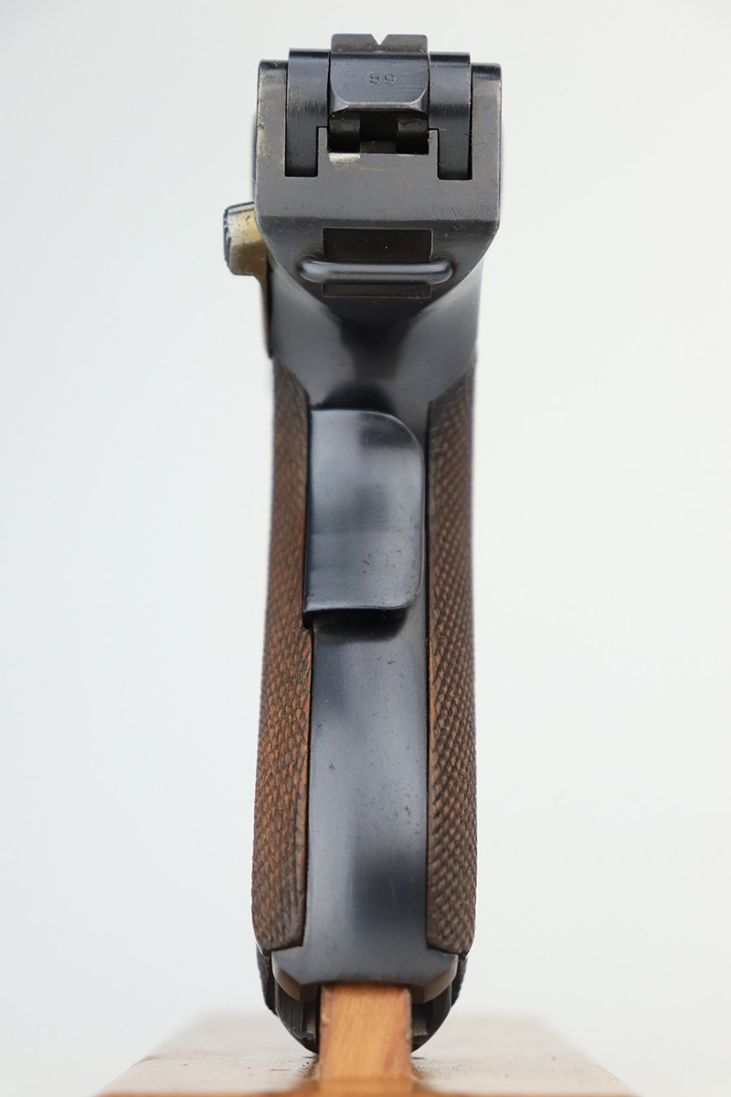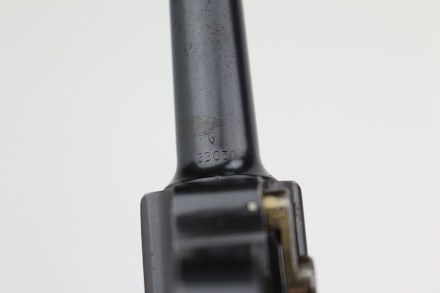 7/10/23 – This is an excellent DWM Model 1906 Luger with American Eagle crest over chamber. It’s a scarce and desirable example as it’s chambered for 9mm Luger, one of about 3,000 produced. 4″ barrel. The original blue rates at 96%. Hints of wear on some of the high edges and two spots of pitting on the left side of the frame. Light freckling on the grip straps and left side of the gun. Minty wood grips. Comes with a proper “9m/m” marked magazine. The bore has good rifling, but there is minor frosting throughout.