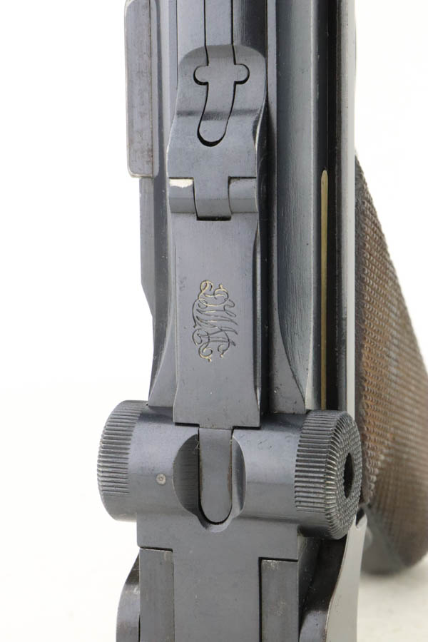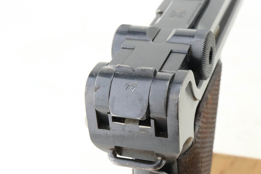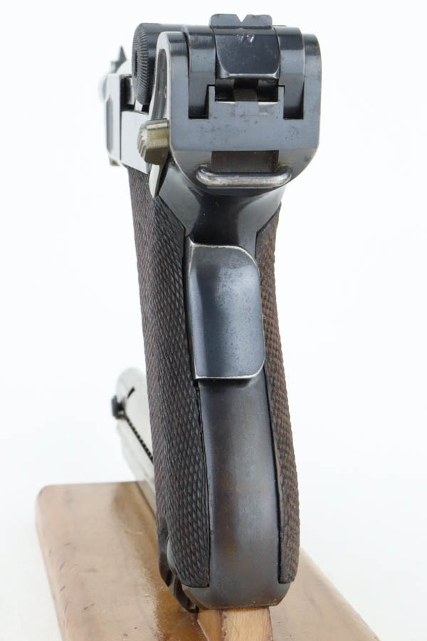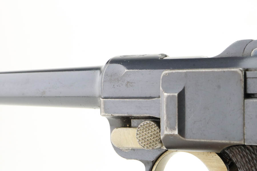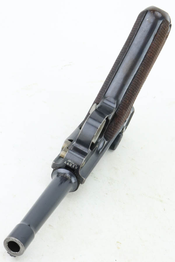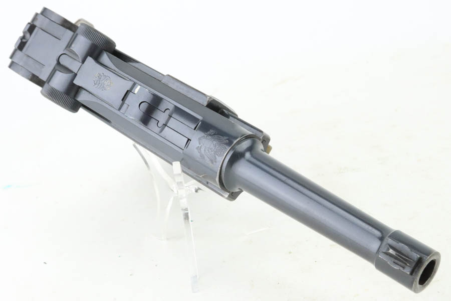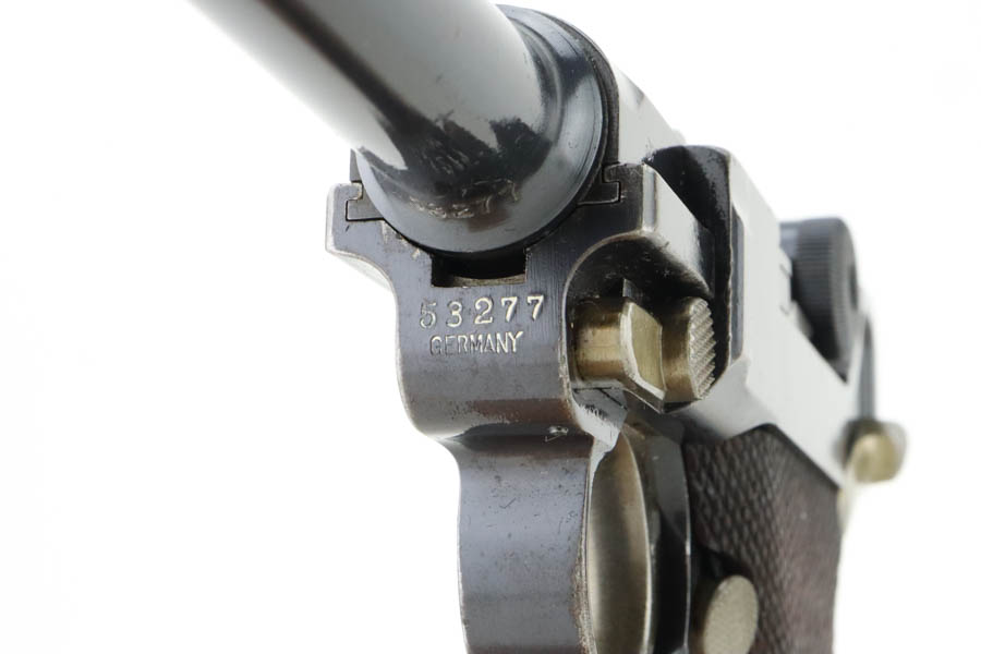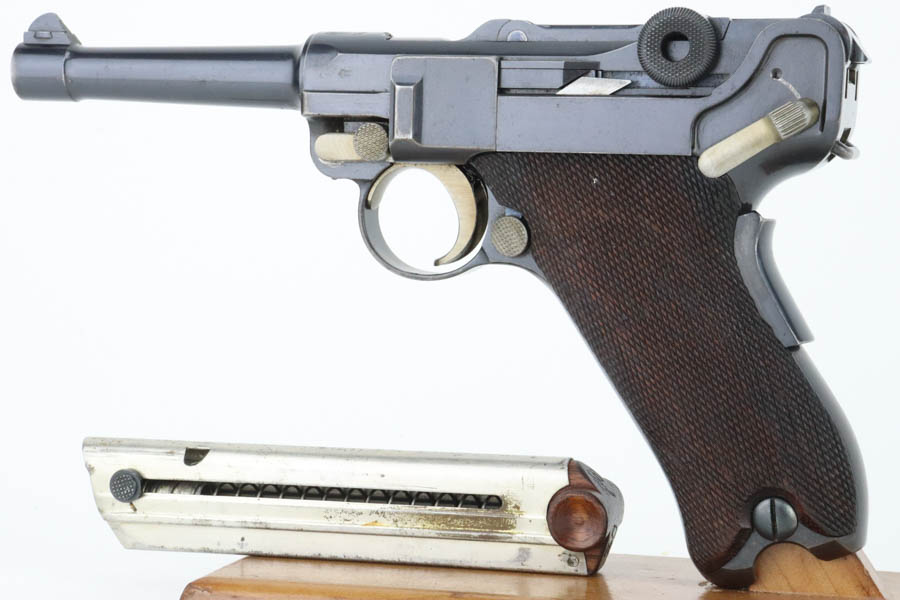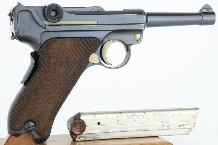 5/29/24 – This is an excellent DWM Model 1906 “American Eagle” Luger sold in the US commercial market in the early 1900’s and chambered in the scarcer 9mm. It has retained about 96% of its original finish with minor high edge and muzzle wear. Light brown patina on the grip straps. Fitted with excellent un-numbered wood grips. Comes with a proper and scarce “Cal 9mm” marked commercial magazine. Very nice bore.