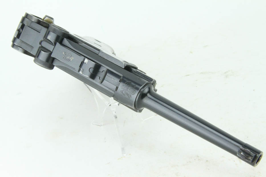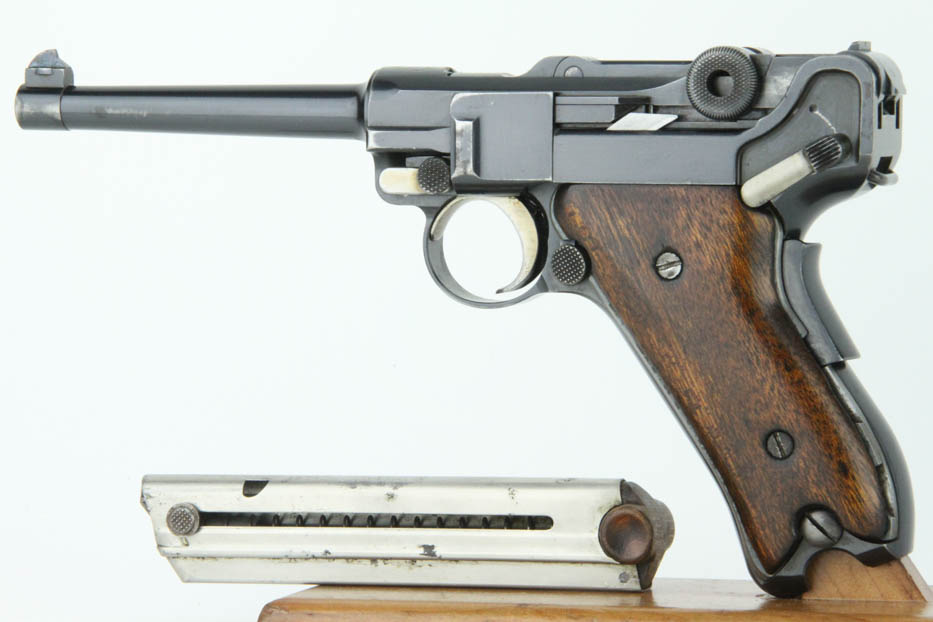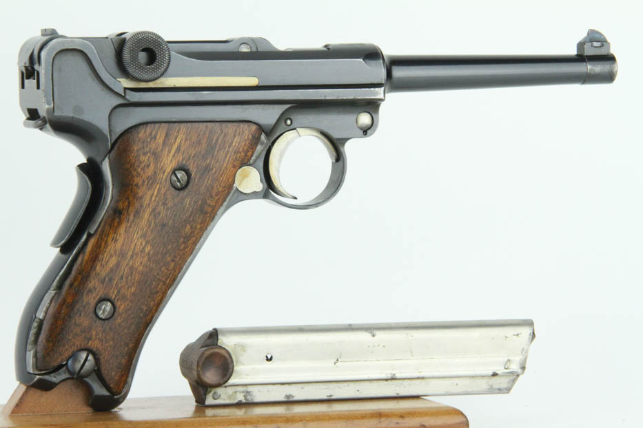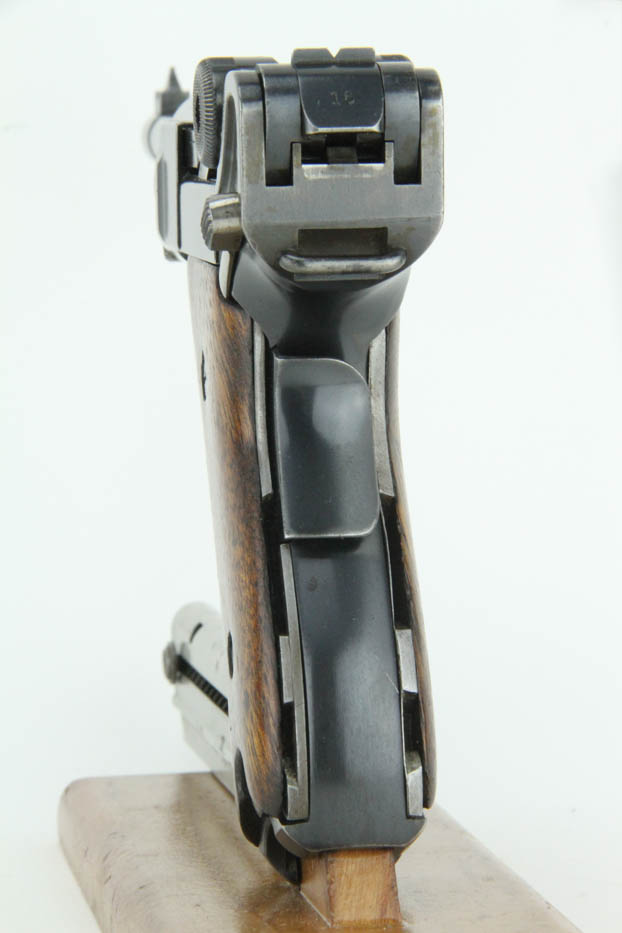 7/23/24 – This is an excellent Model 1906 Model DWM American Eagle Luger with rare Ideal grips for the Ideal stock / holster combo. This one does not come with the holster and stock, just the grips. The Ideal Holster Company applied for the patent on their grip and stock/holster in 1901, and the design uses a set of special grip panels with metal locking surfaces in them in conjunction with some very clever angular geometry to allow the stock to be easily attached and detached when in the short position, but lock tight and secure when the stock is extended to shooting length. The gun is all matching and has retained about 95-96% with minor high edge and muzzle wear. Mint bore. The grips are not numbered. Comes with a mismatched magazine. The hold-open does not work properly with this magazine.