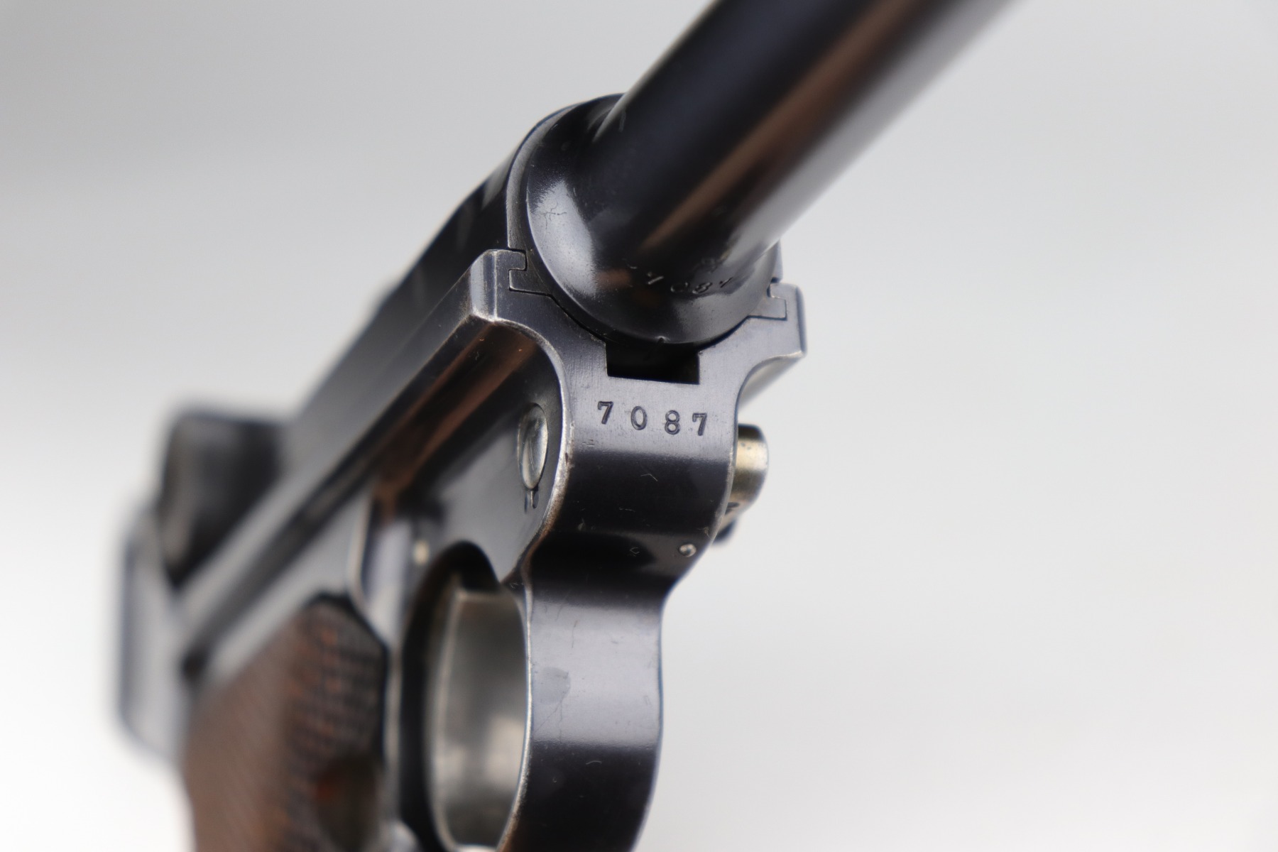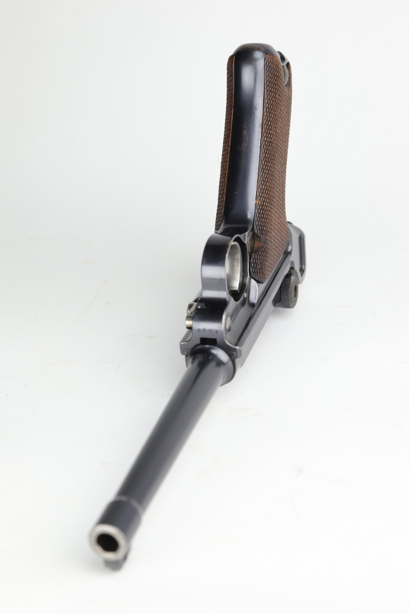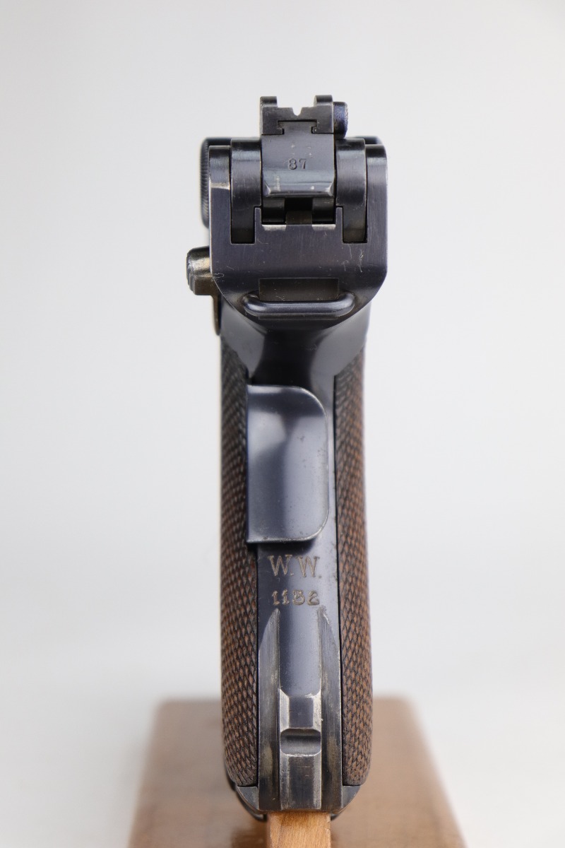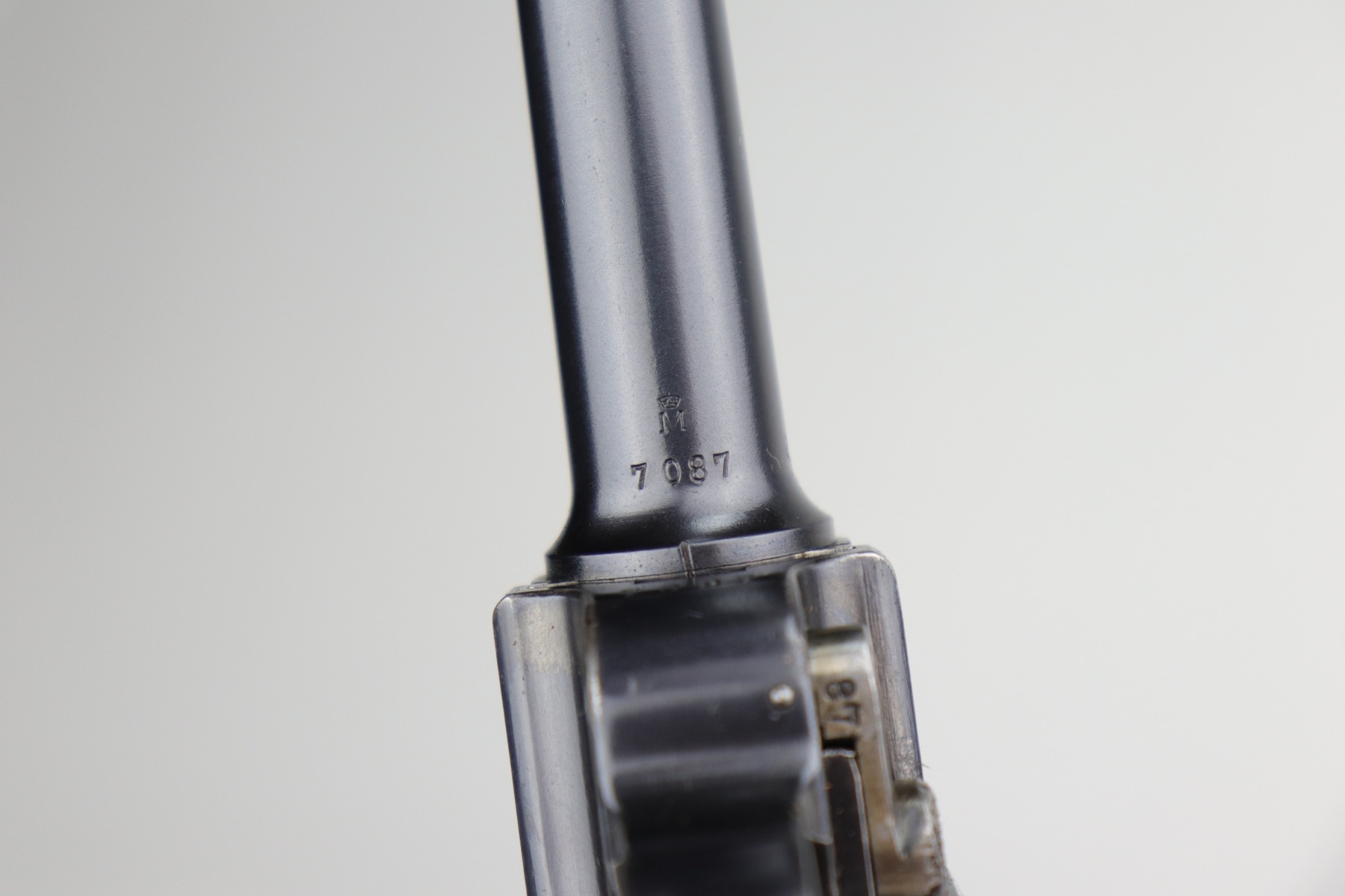 1/26/21 – This is an excellent example of a rare “First-Issue” DWM Model 1906 Navy Luger. The gun is all matching, has the proper Navy “Eagle M” Navy proofs, and no date on the chamber. The lower portion of the safety was ground, and a new “Gesichert” was added. There is a “W. W. 1132” marking on the back strap, likely a property mark from the Wilhelmshaven depot. It comes with a proper WW1 navy luger magazine that does not match the gun. The gun is in excellent condition, having retained about 95-96% of its original finish. There is minor wear and very minor pitting around the muzzle and on the side plate. Minor wear on the front edges of the frame. Minor pin-pricking on both straps and spotty wear on the front strap. The grips are excellent and matching. The bore has good rifling, but there is pin-pricking throughout.
