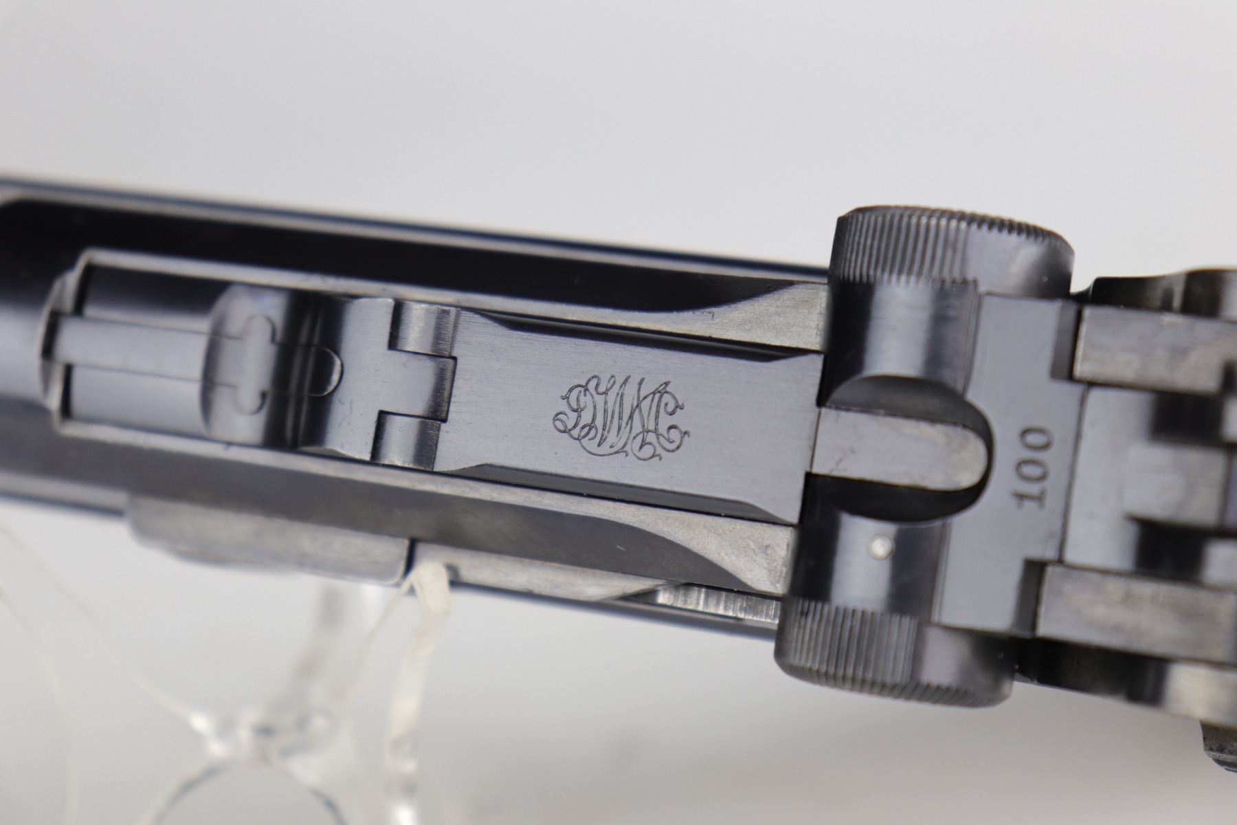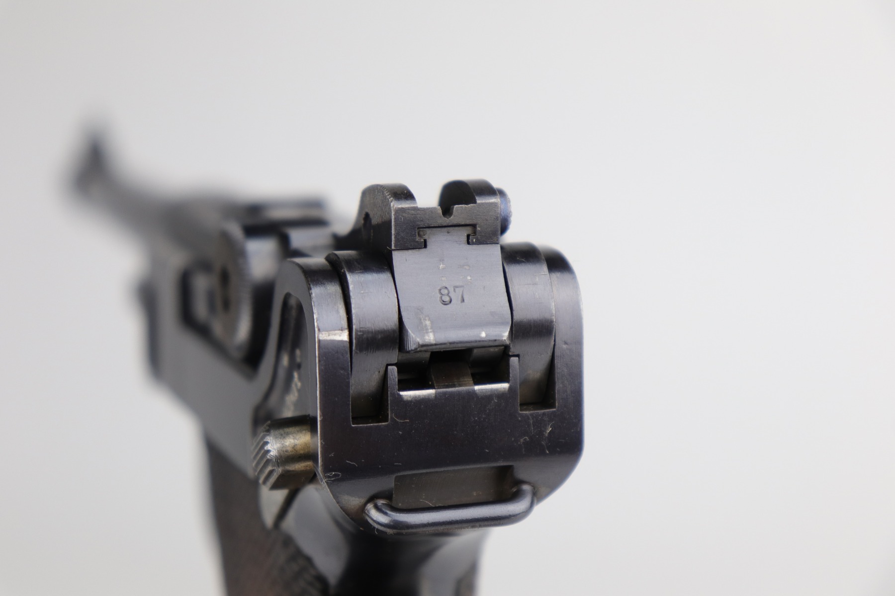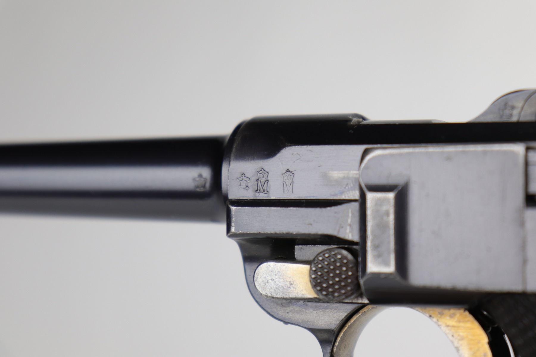1/26/21 – This is an excellent example of a rare “First-Issue” DWM Model 1906 Navy Luger. The gun is all matching, has the proper Navy “Eagle M” Navy proofs, and no date on the chamber. The lower portion of the safety was ground, and a new “Gesichert” was added. There is a “W. W. 1132” marking on the back strap, likely a property mark from the Wilhelmshaven depot. It comes with a proper WW1 navy luger magazine that does not match the gun. The gun is in excellent condition, having retained about 95-96% of its original finish. There is minor wear and very minor pitting around the muzzle and on the side plate. Minor wear on the front edges of the frame. Minor pin-pricking on both straps and spotty wear on the front strap. The grips are excellent and matching. The bore has good rifling, but there is pin-pricking throughout.