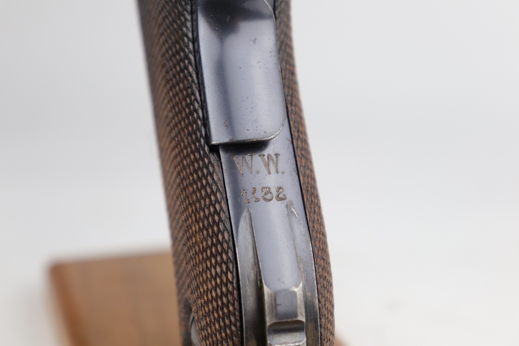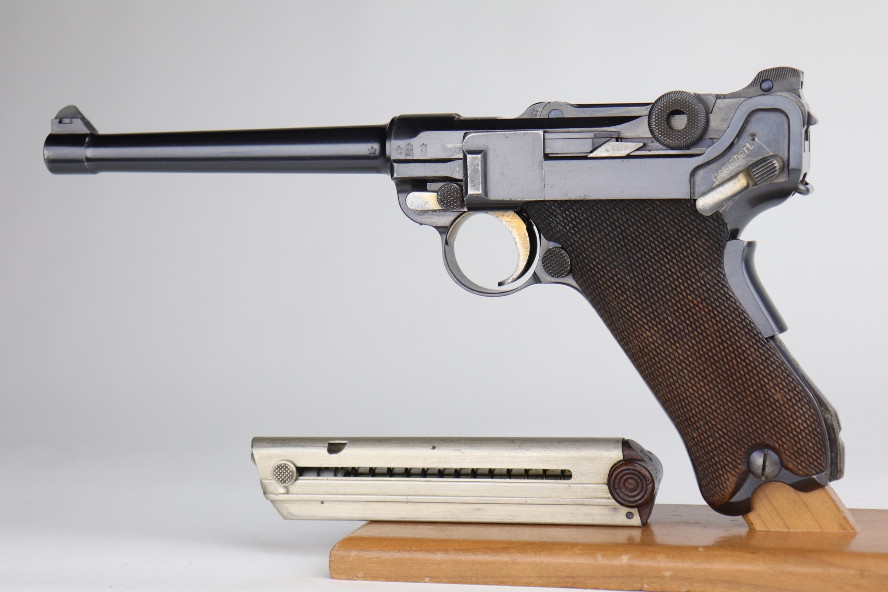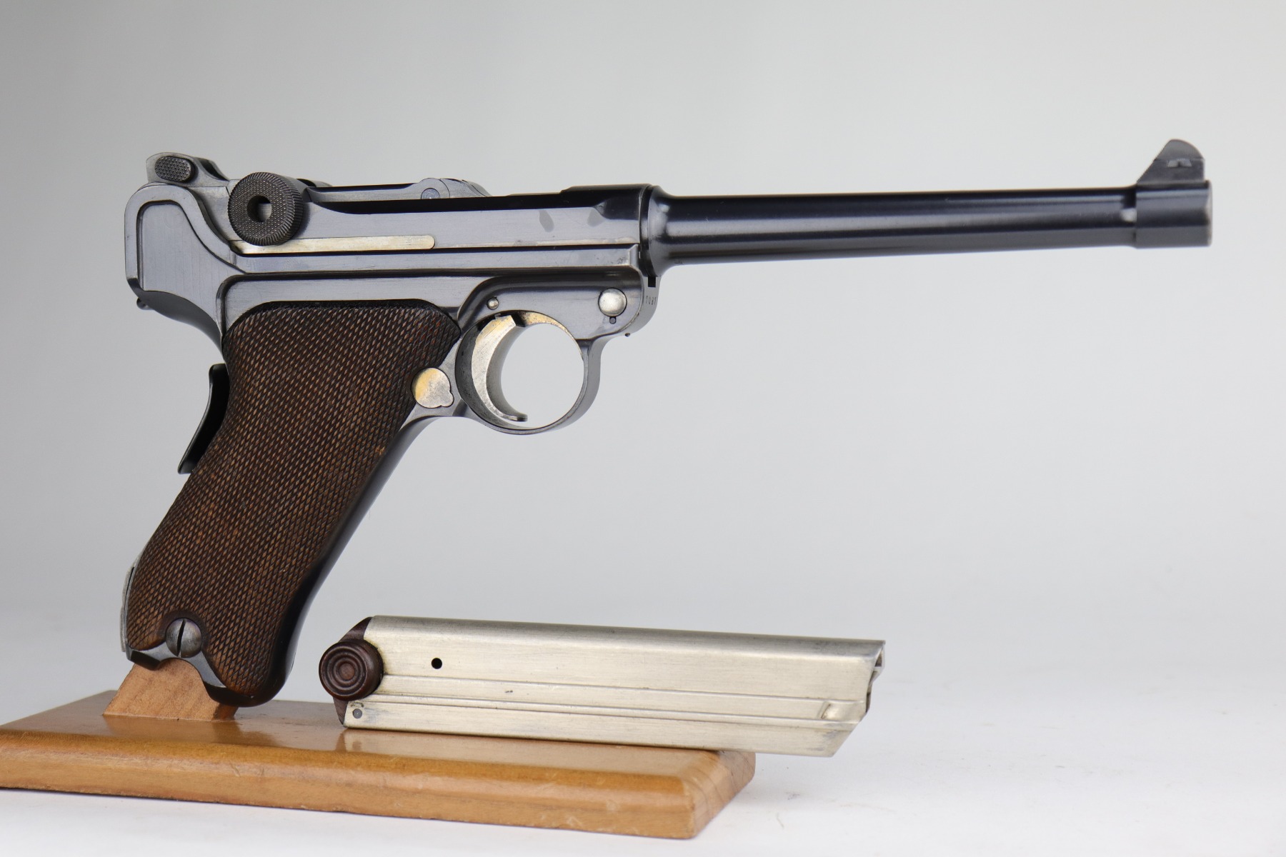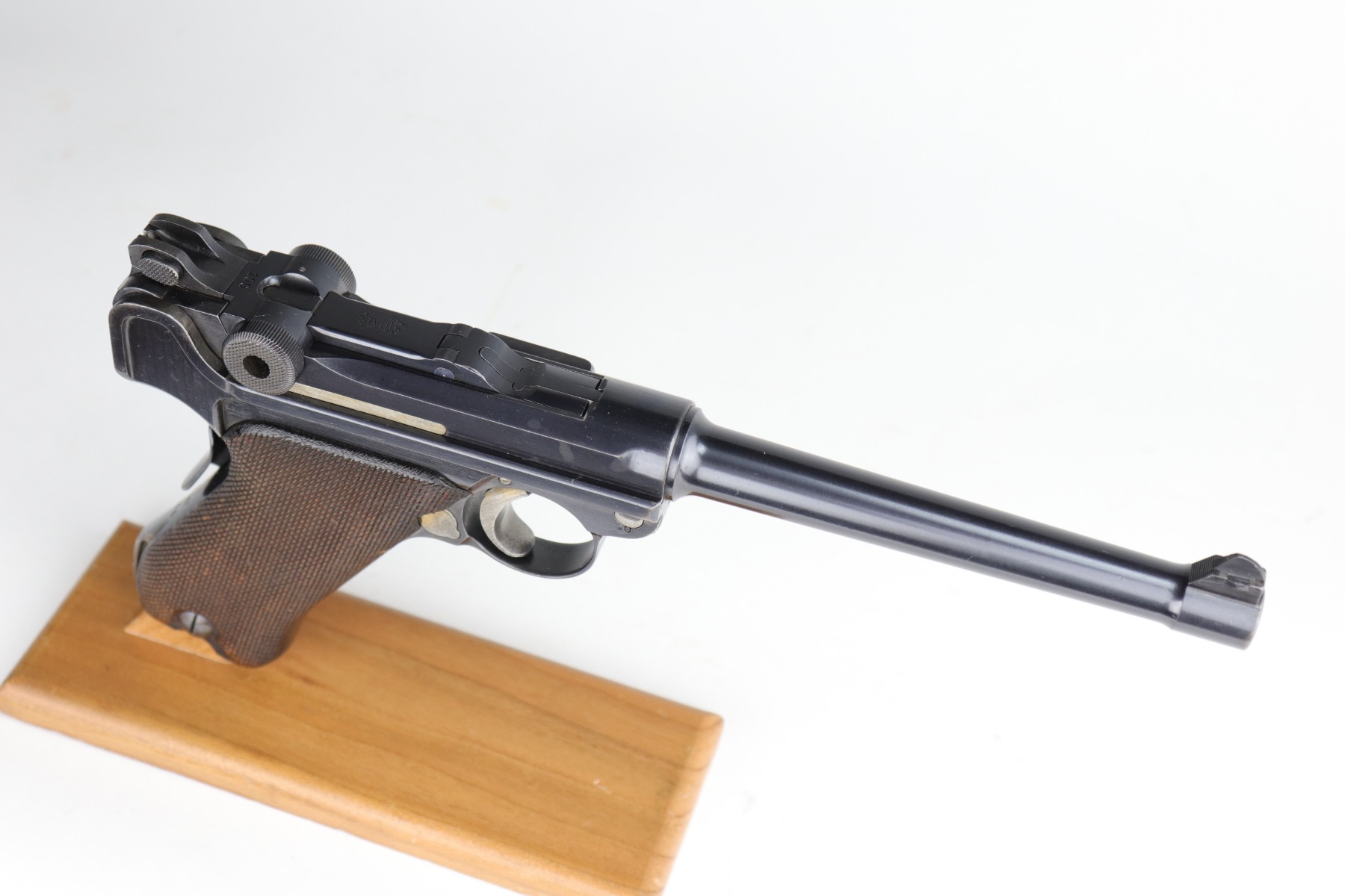 1/26/21 – This is an excellent example of a rare “First-Issue” DWM Model 1906 Navy Luger. The gun is all matching, has the proper Navy “Eagle M” Navy proofs, and no date on the chamber. The lower portion of the safety was ground, and a new “Gesichert” was added. There is a “W. W. 1132” marking on the back strap, likely a property mark from the Wilhelmshaven depot. It comes with a proper WW1 navy luger magazine that does not match the gun. The gun is in excellent condition, having retained about 95-96% of its original finish. There is minor wear and very minor pitting around the muzzle and on the side plate. Minor wear on the front edges of the frame. Minor pin-pricking on both straps and spotty wear on the front strap. The grips are excellent and matching. The bore has good rifling, but there is pin-pricking throughout.