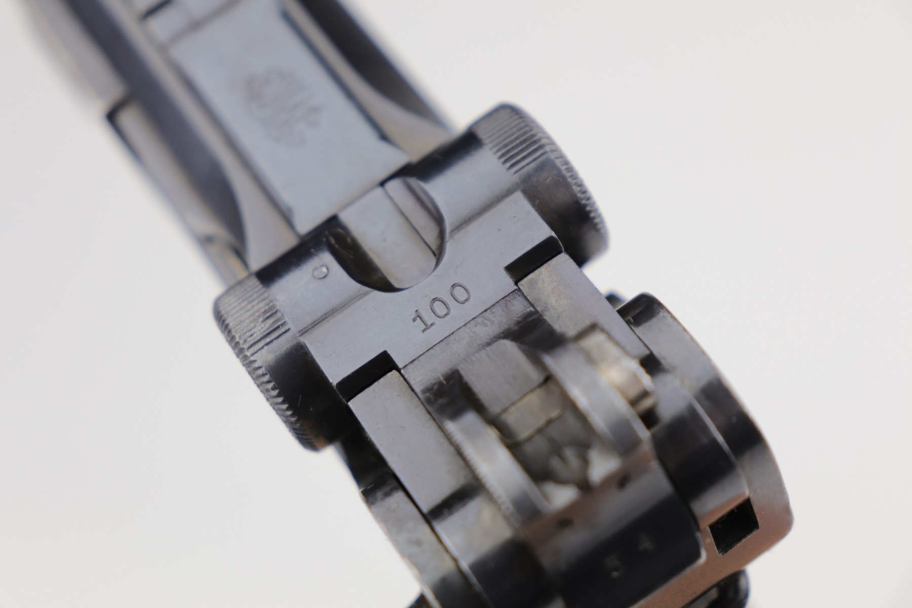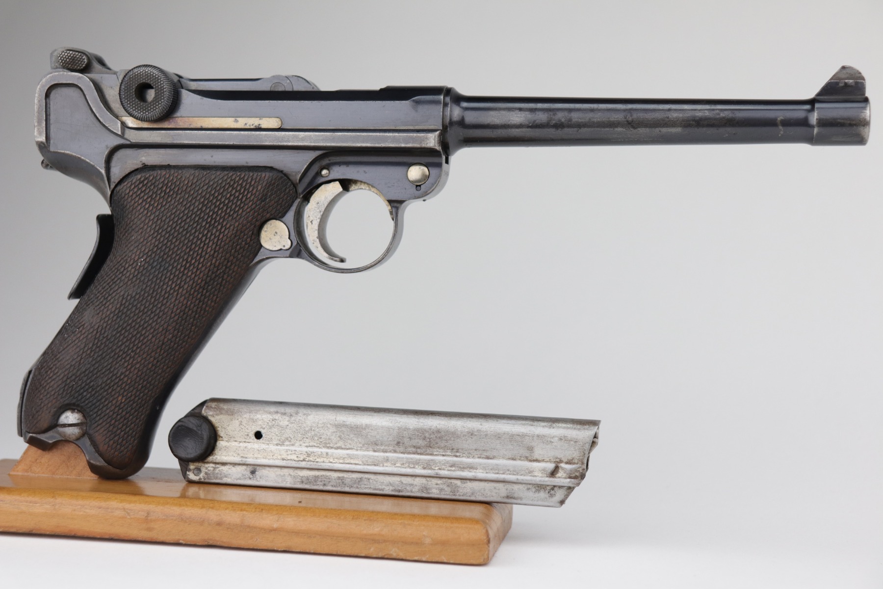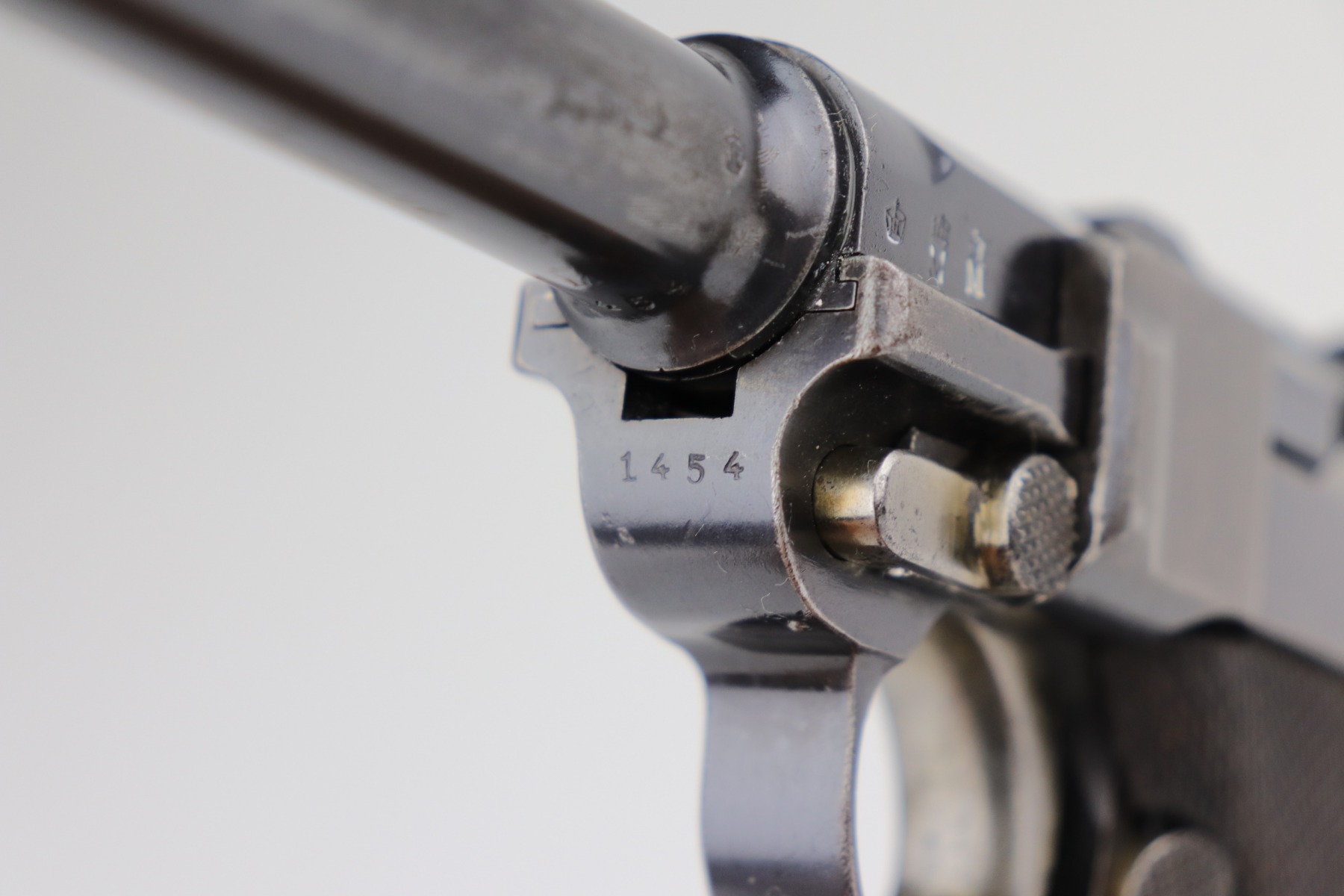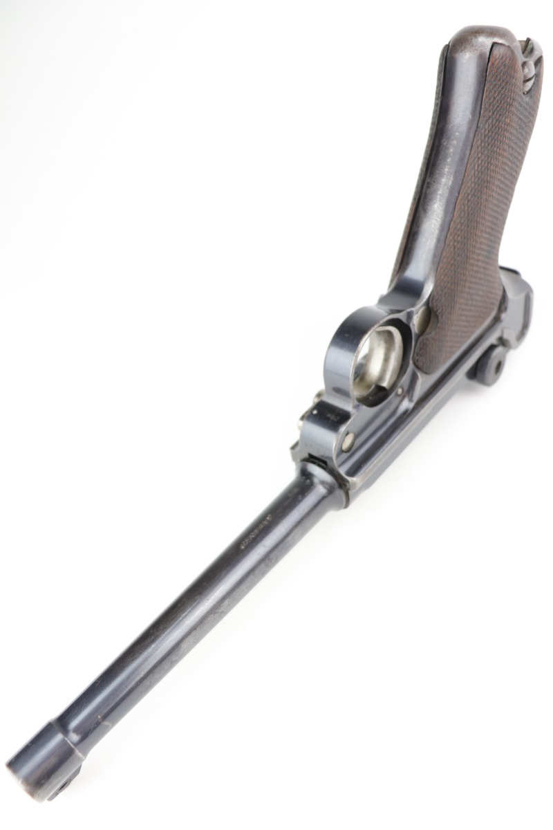 2/10/21 – This is a nice example of a DWM Model 1906 Navy Luger issued to the Imperial German Navy during WW1. It is all matching and has the proper “Crown M” Navy proofs. It also has a “W.W.” marking on the back strap, indicating it was issued out of the navy base in Wilhelmshaven. It has a “Germany” export proof on the underside of the barrel, meaning it was sold in the commercial market after WW1. There is spotty wear on the straps, side plate, barrel, muzzle, and high edges of the frame. It has very nice grips and comes with a non-navy WW1-era magazine. The bore has great rifling, but there is minor pitting in the grooves.