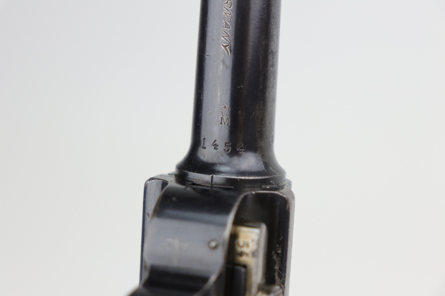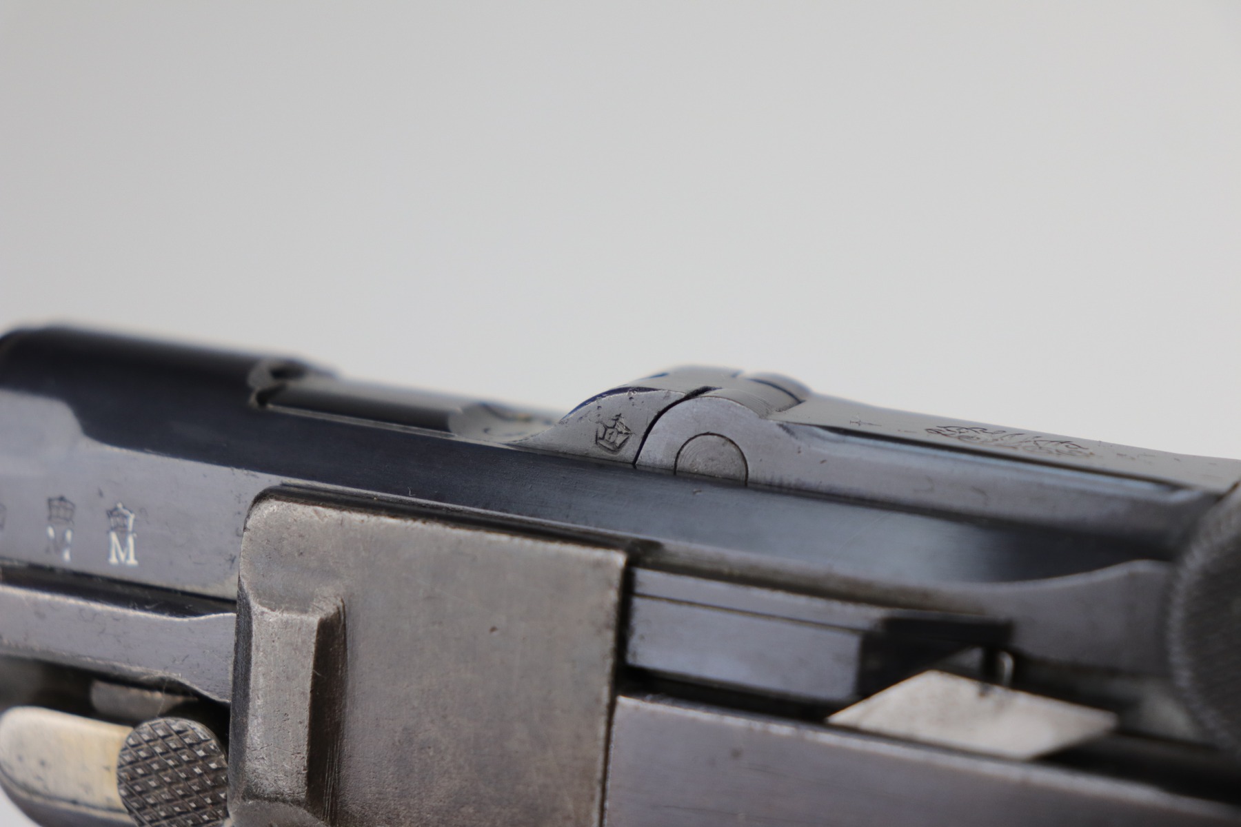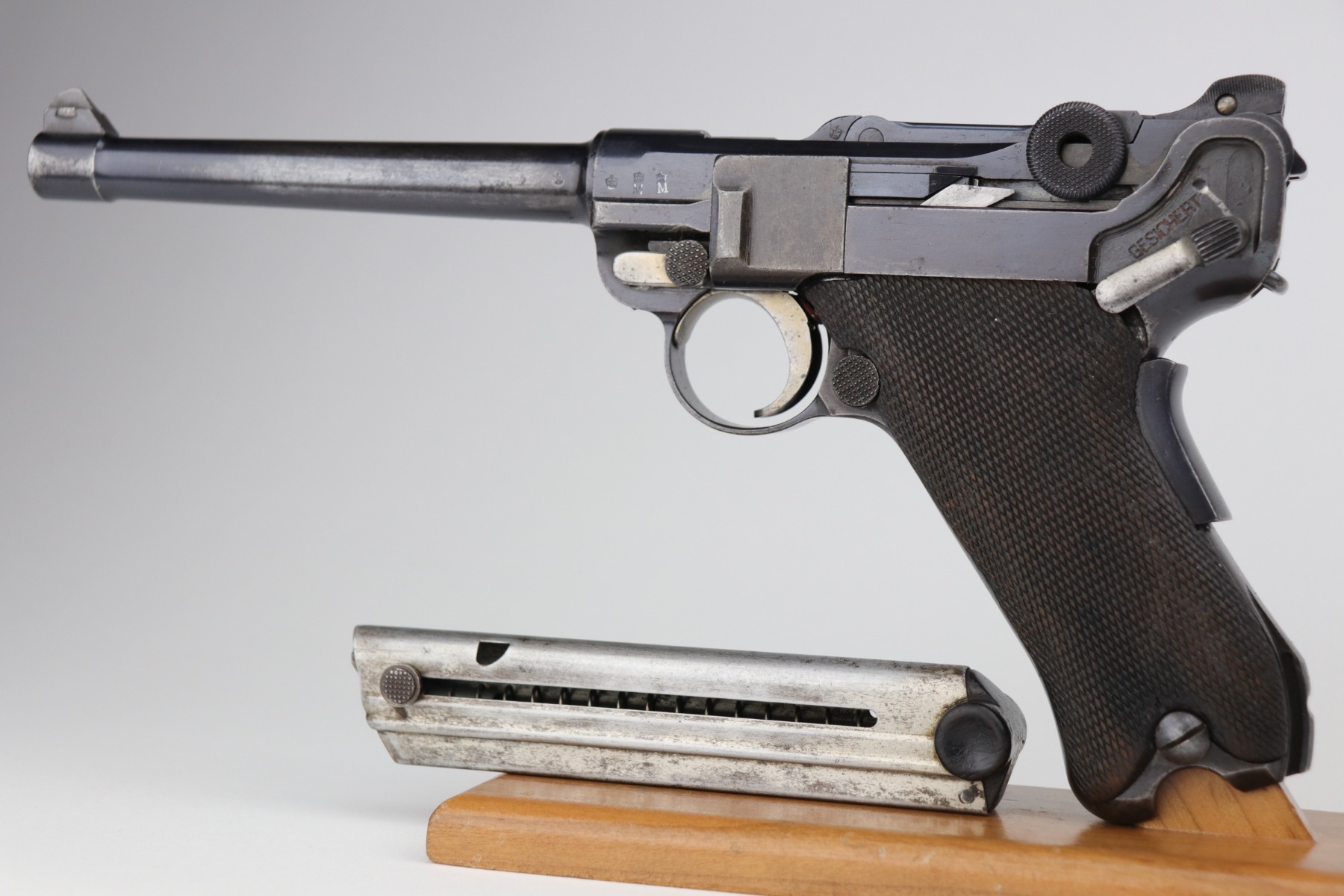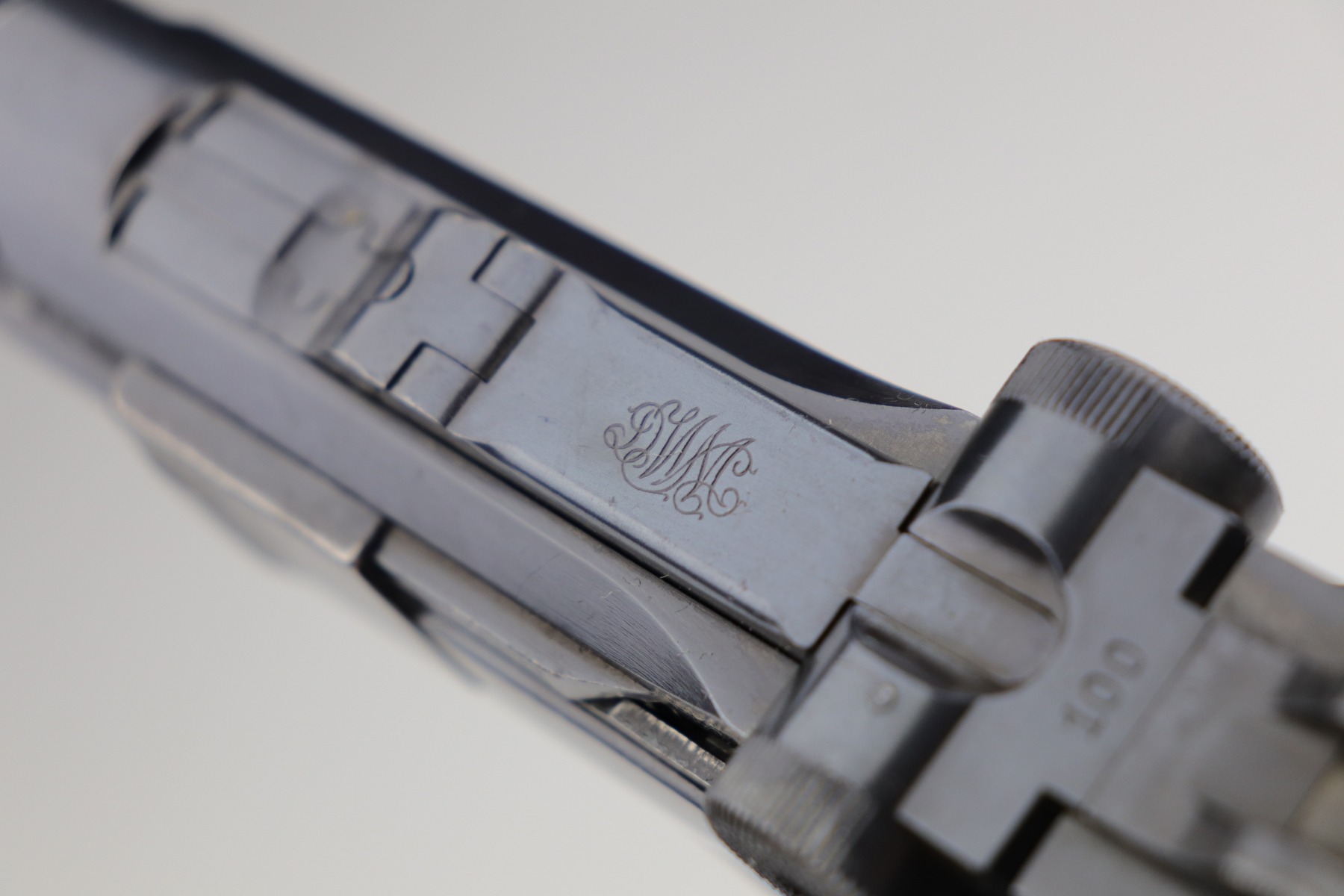 2/10/21 – This is a nice example of a DWM Model 1906 Navy Luger issued to the Imperial German Navy during WW1. It is all matching and has the proper “Crown M” Navy proofs. It also has a “W.W.” marking on the back strap, indicating it was issued out of the navy base in Wilhelmshaven. It has a “Germany” export proof on the underside of the barrel, meaning it was sold in the commercial market after WW1. There is spotty wear on the straps, side plate, barrel, muzzle, and high edges of the frame. It has very nice grips and comes with a non-navy WW1-era magazine. The bore has great rifling, but there is minor pitting in the grooves.