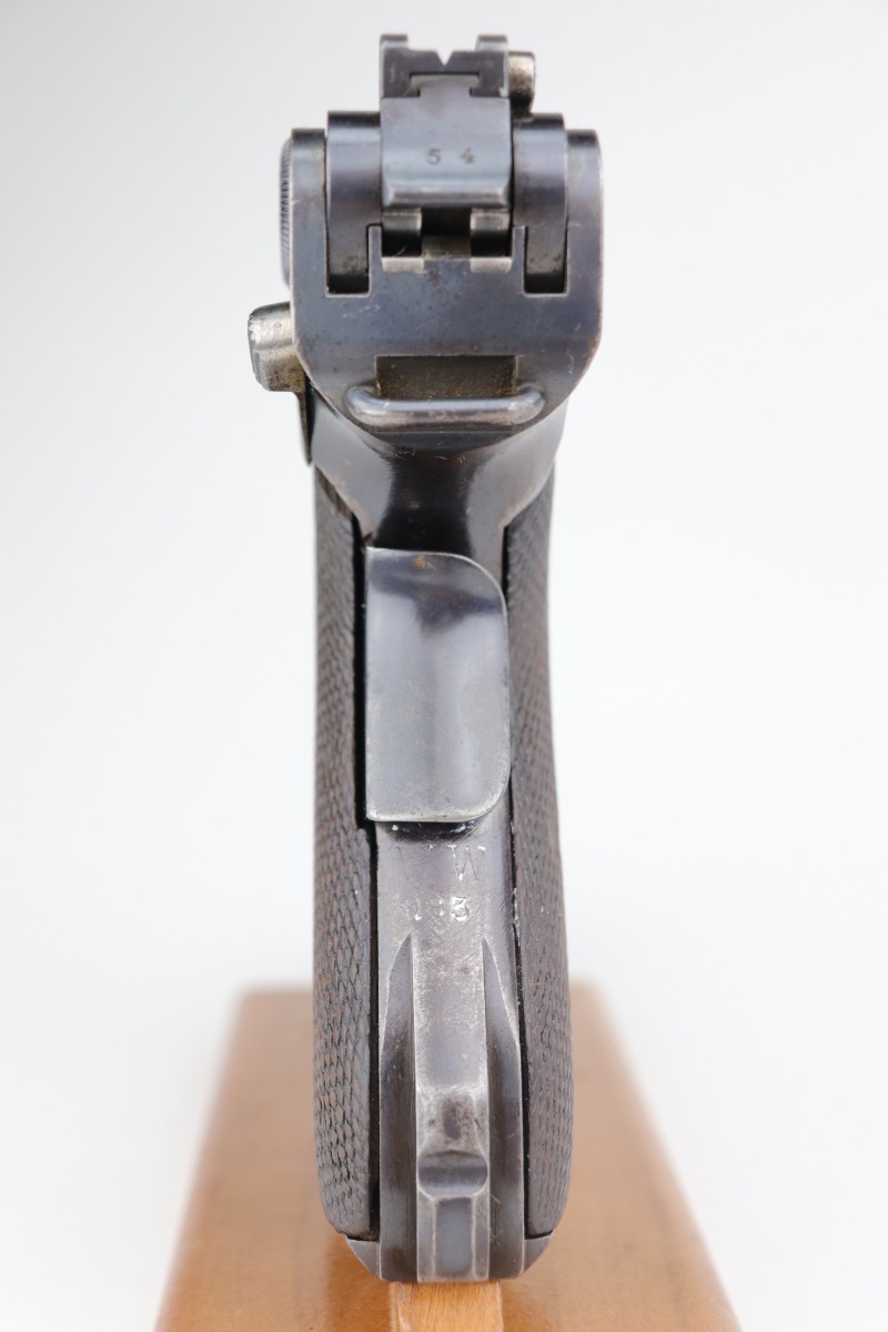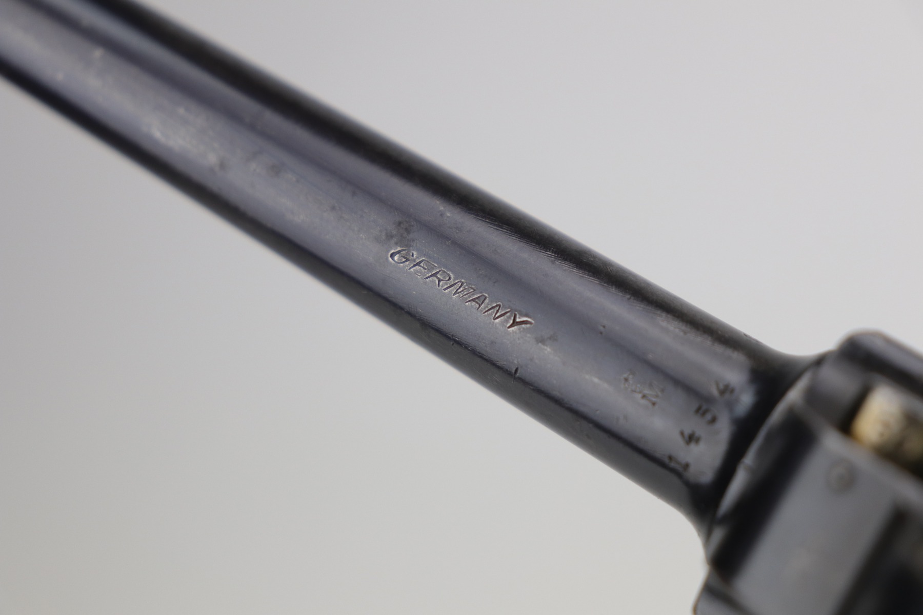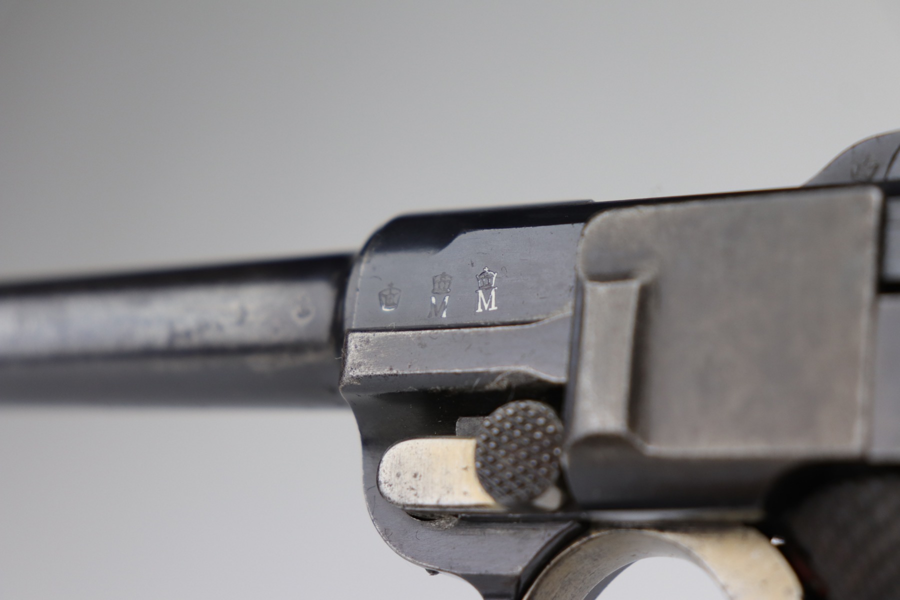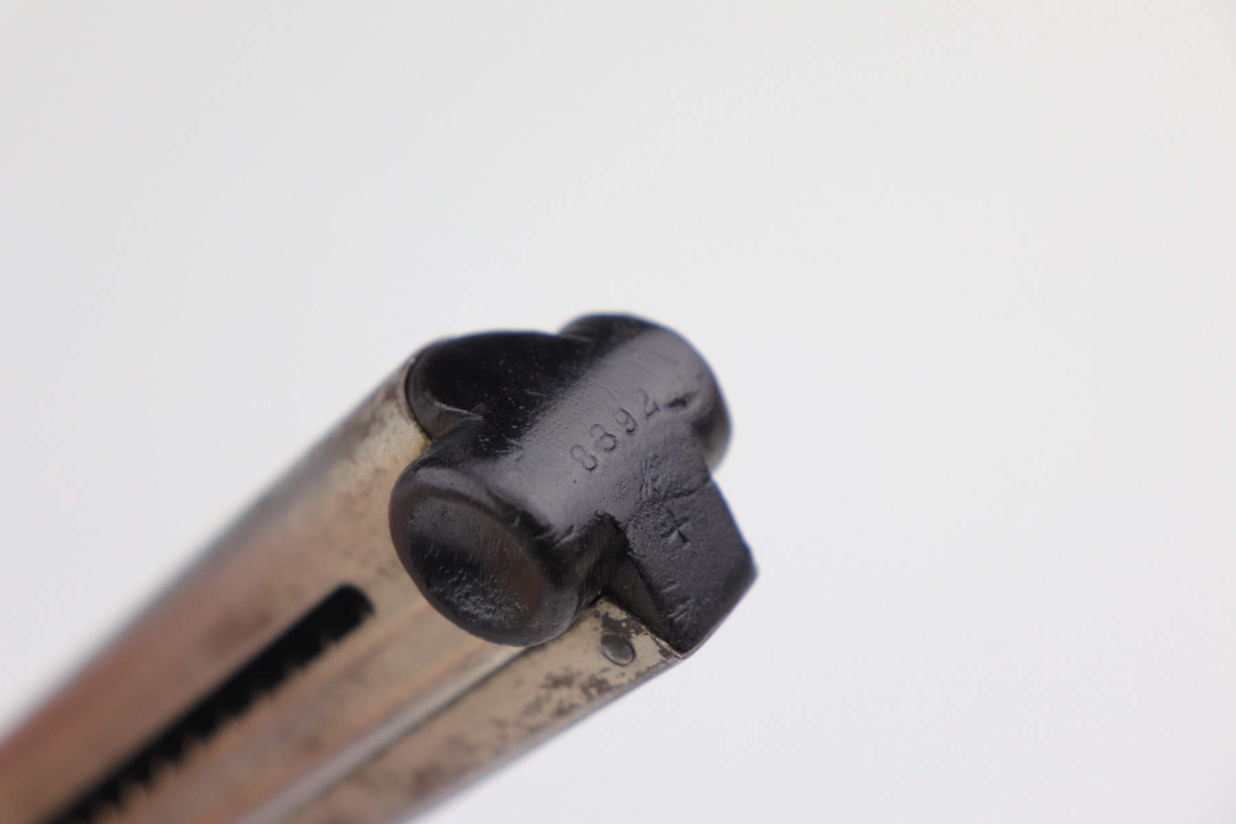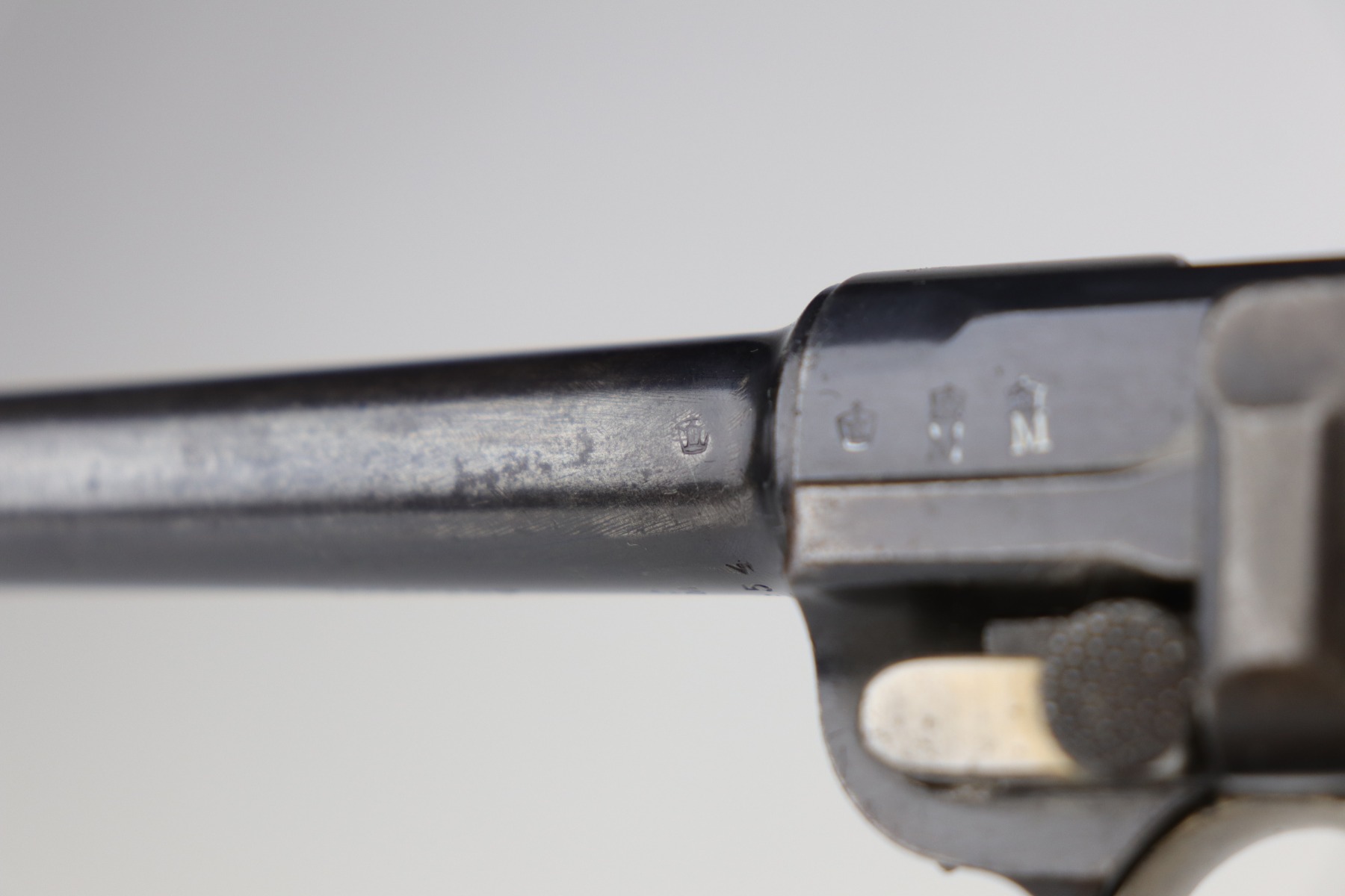 2/10/21 – This is a nice example of a DWM Model 1906 Navy Luger issued to the Imperial German Navy during WW1. It is all matching and has the proper “Crown M” Navy proofs. It also has a “W.W.” marking on the back strap, indicating it was issued out of the navy base in Wilhelmshaven. It has a “Germany” export proof on the underside of the barrel, meaning it was sold in the commercial market after WW1. There is spotty wear on the straps, side plate, barrel, muzzle, and high edges of the frame. It has very nice grips and comes with a non-navy WW1-era magazine. The bore has great rifling, but there is minor pitting in the grooves.