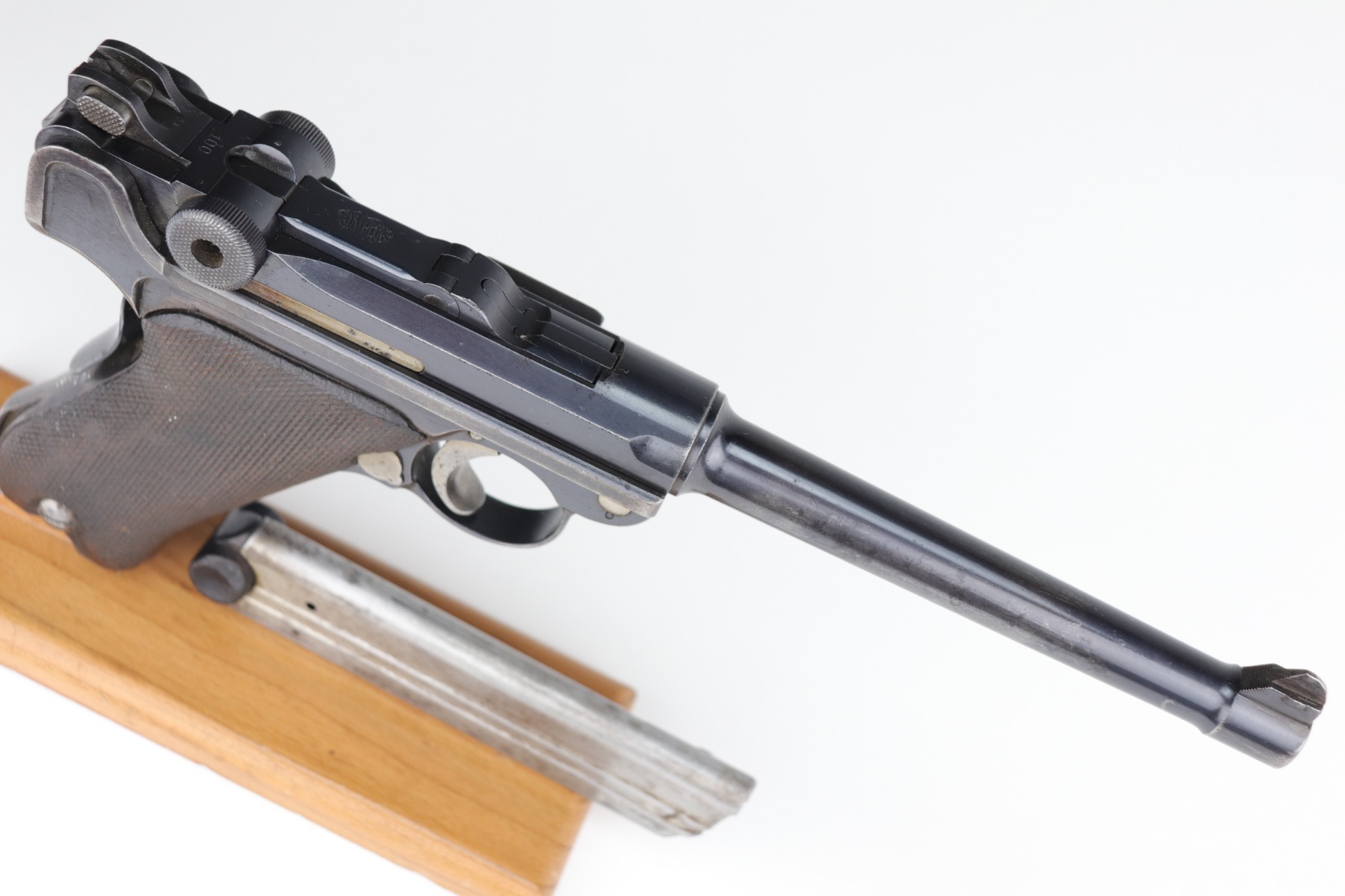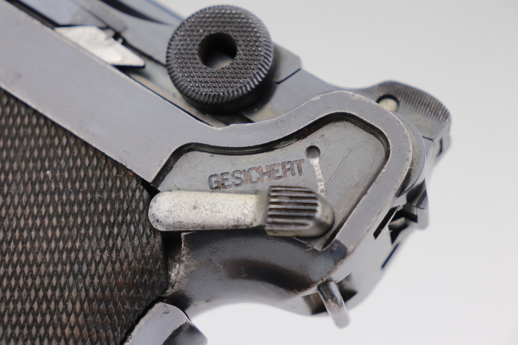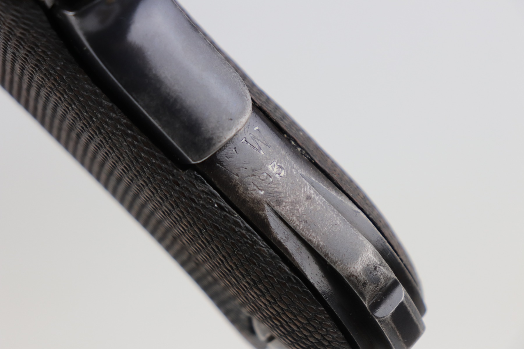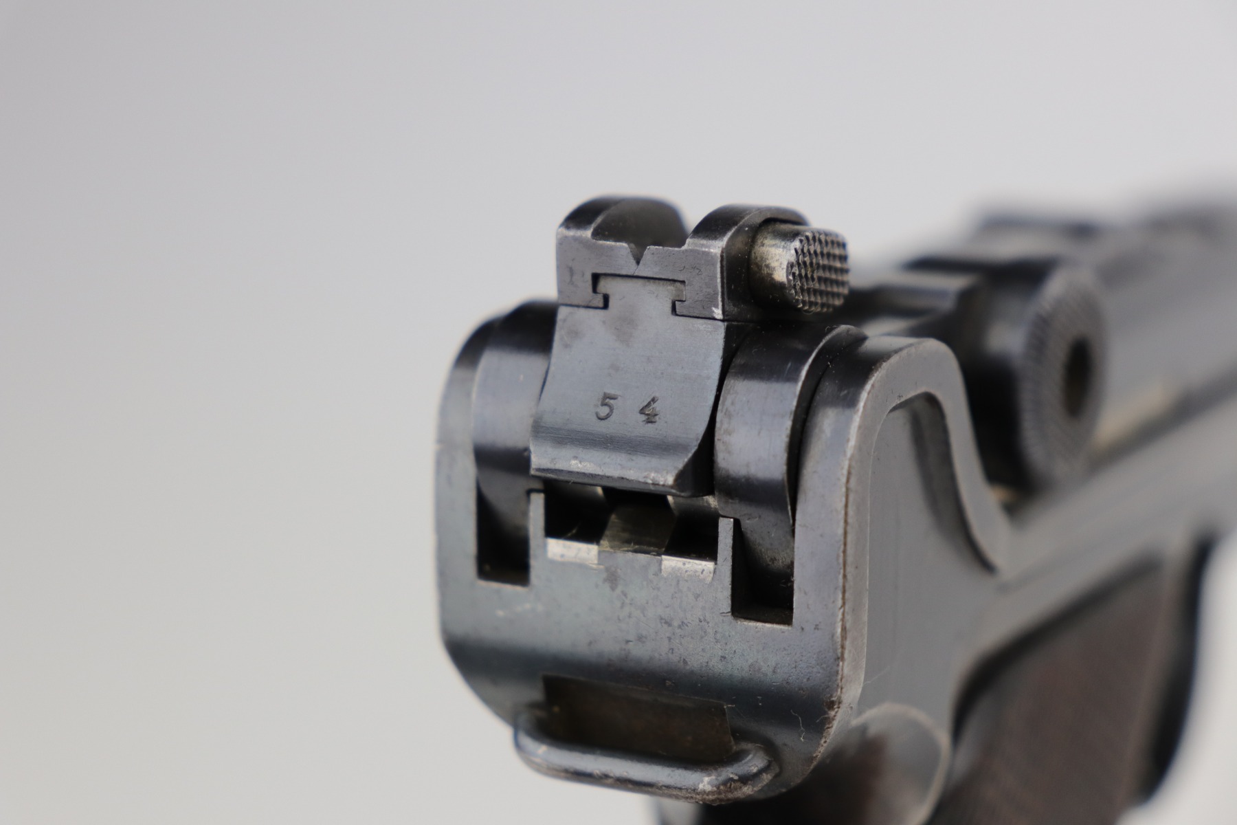 2/10/21 – This is a nice example of a DWM Model 1906 Navy Luger issued to the Imperial German Navy during WW1. It is all matching and has the proper “Crown M” Navy proofs. It also has a “W.W.” marking on the back strap, indicating it was issued out of the navy base in Wilhelmshaven. It has a “Germany” export proof on the underside of the barrel, meaning it was sold in the commercial market after WW1. There is spotty wear on the straps, side plate, barrel, muzzle, and high edges of the frame. It has very nice grips and comes with a non-navy WW1-era magazine. The bore has great rifling, but there is minor pitting in the grooves.