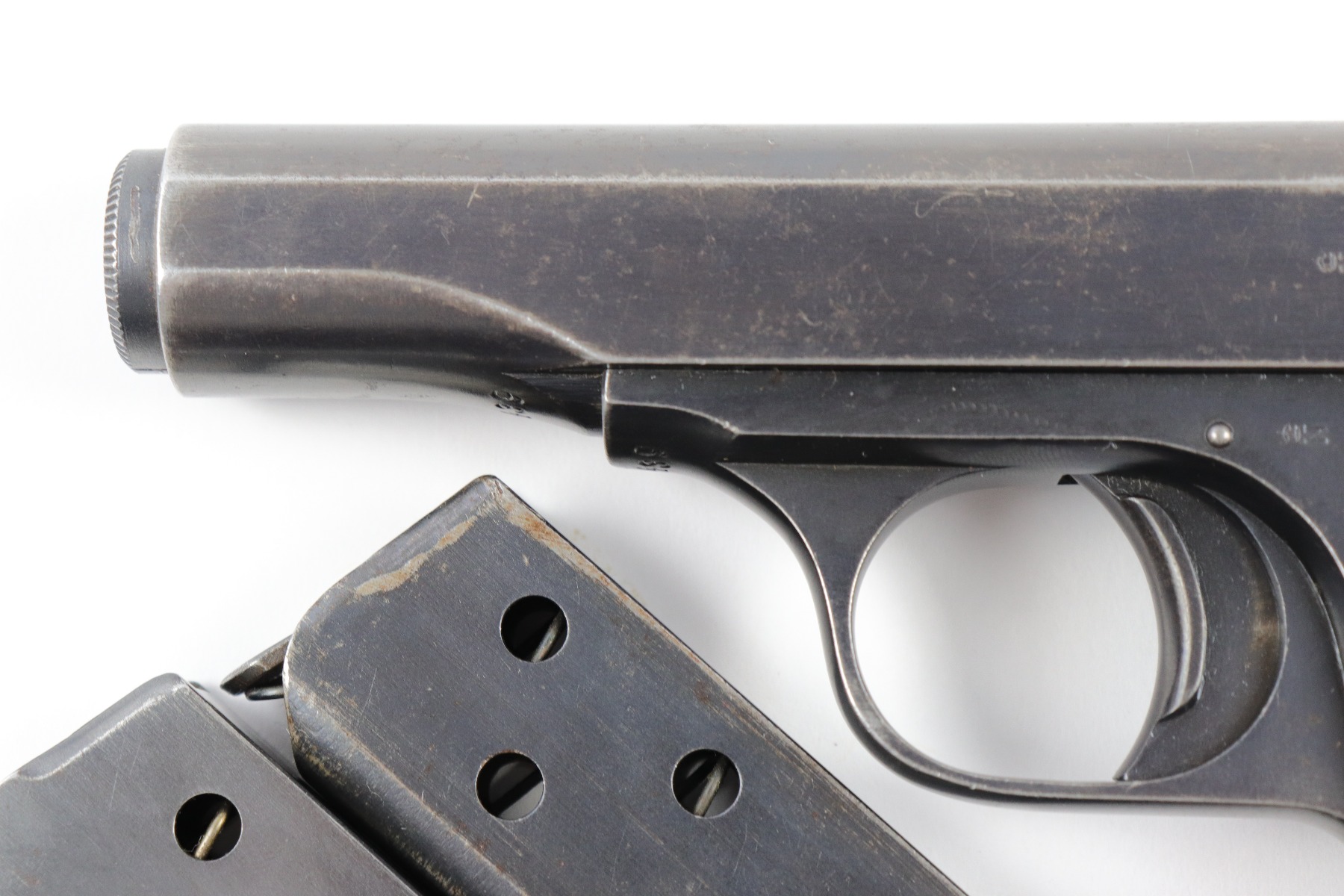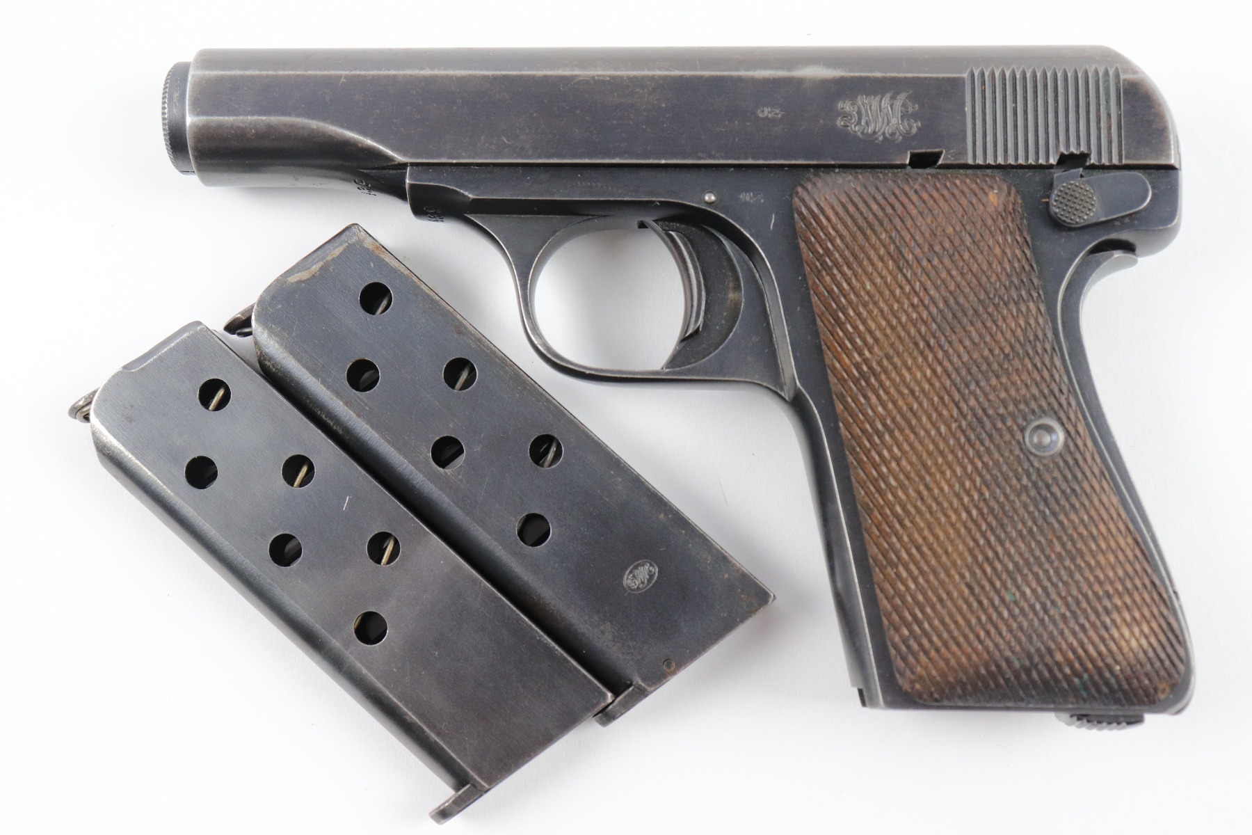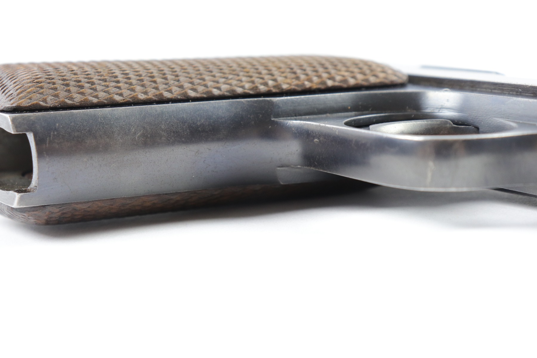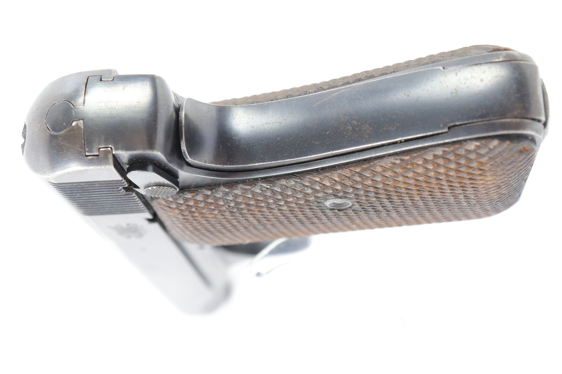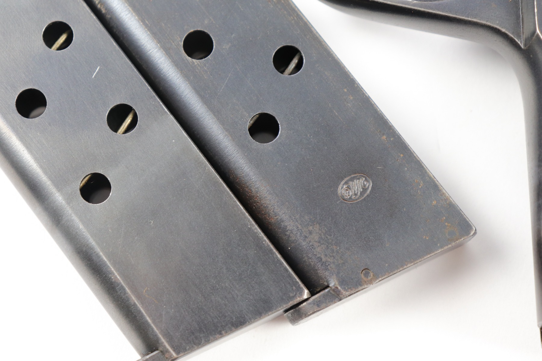 4/17/18 – This is a fairly rare DWM 7.65mm pistol manufactured between 1921 and 1931. With only around 40,000 produced total, DWM made this pistol and allegedly was sued by Browning for stealing their model 1910 patent. The pistol is a pretty unique piece of history made for commercial use. The pistol has honest wear throughout, as shown in photos. Most of the wear is light speckling on the blued finish, and edge wear on the slide. The front strap has some thinning as well as speckling, but overall the pistol is in great condition and fully functional with all original parts. The bore is very nice with nice lands and grooves, but there are a few minor signs of wear. The gun comes with 2 magazines (which are equally hard to find), and one of the magazines is stamped DWM. Very nice, unusual collector’s piece from DWM.