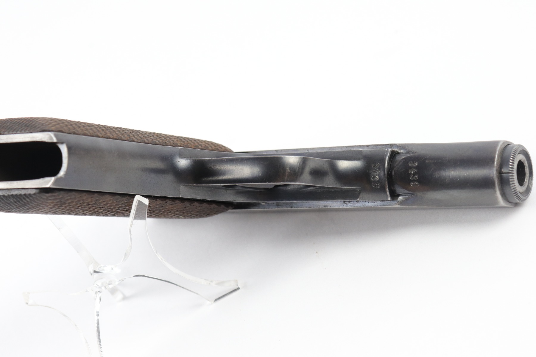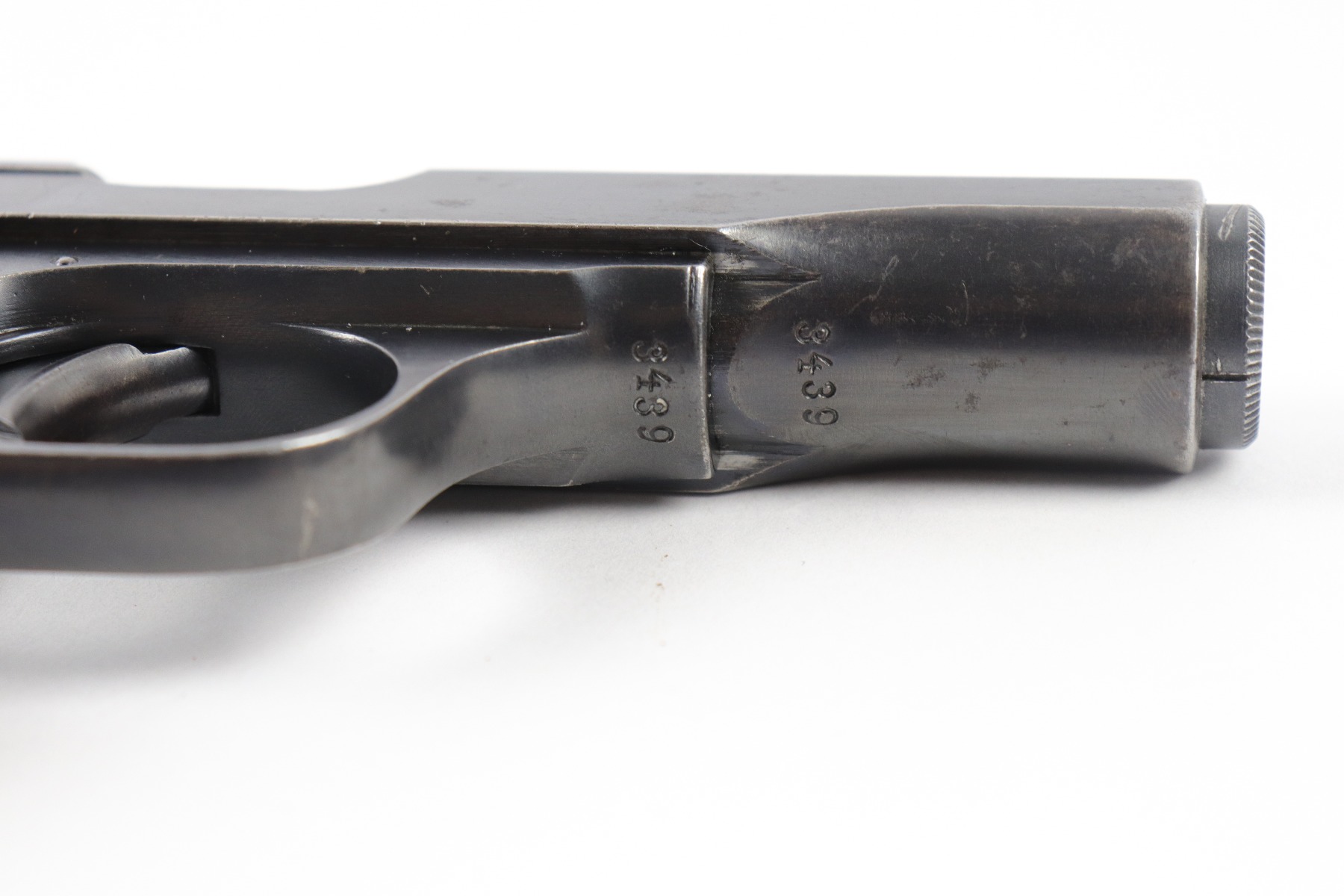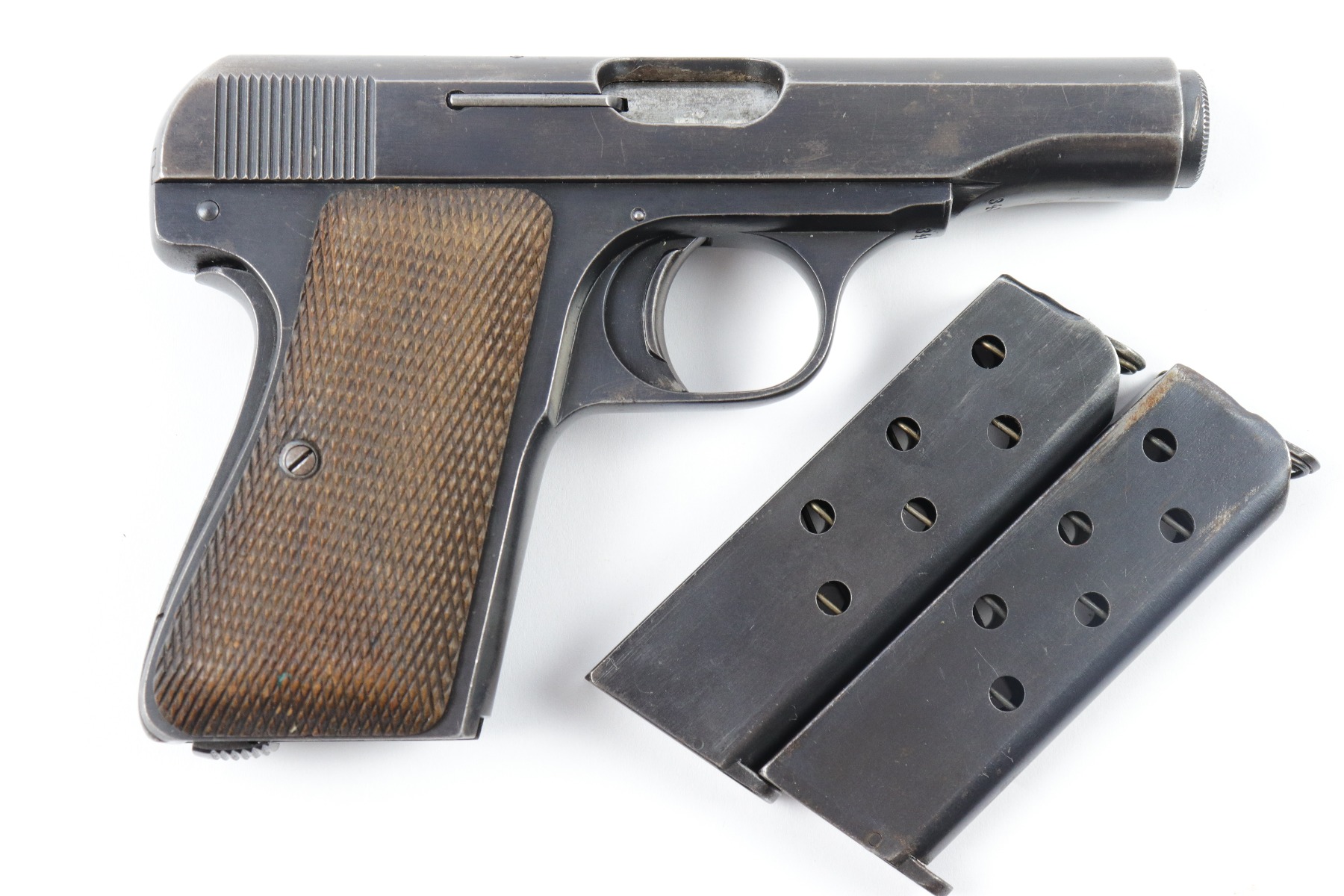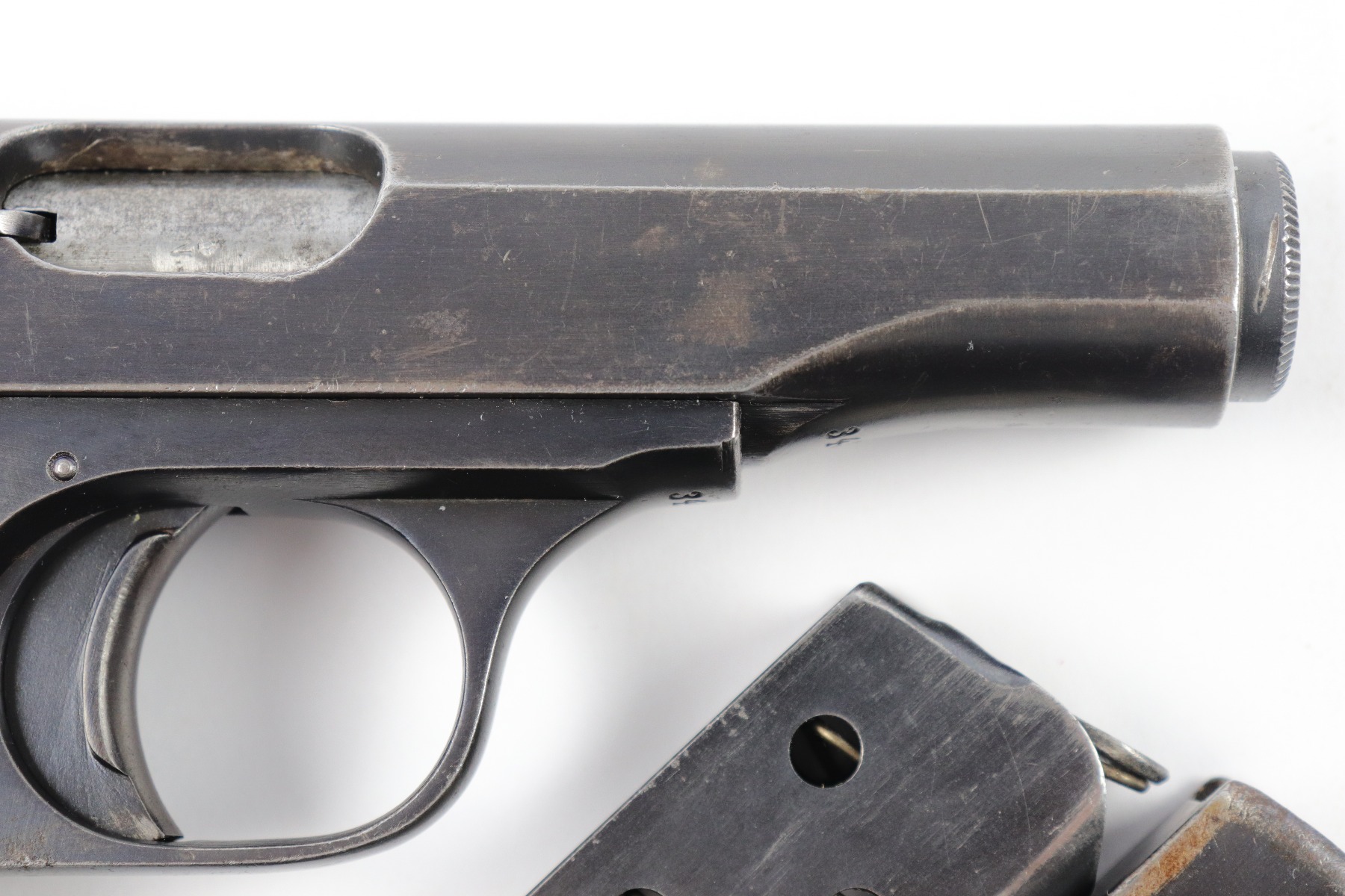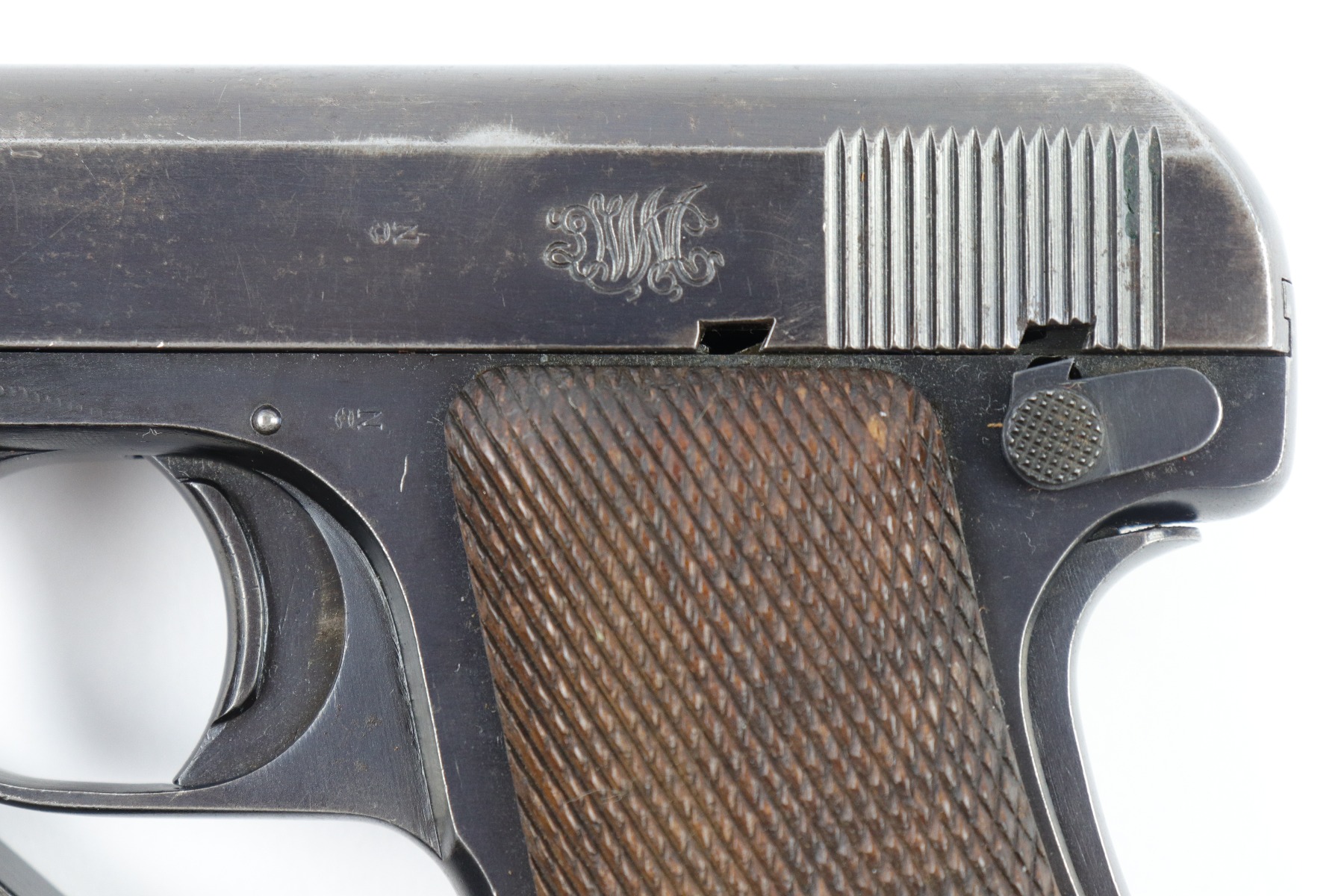 4/17/18 – This is a fairly rare DWM 7.65mm pistol manufactured between 1921 and 1931. With only around 40,000 produced total, DWM made this pistol and allegedly was sued by Browning for stealing their model 1910 patent. The pistol is a pretty unique piece of history made for commercial use. The pistol has honest wear throughout, as shown in photos. Most of the wear is light speckling on the blued finish, and edge wear on the slide. The front strap has some thinning as well as speckling, but overall the pistol is in great condition and fully functional with all original parts. The bore is very nice with nice lands and grooves, but there are a few minor signs of wear. The gun comes with 2 magazines (which are equally hard to find), and one of the magazines is stamped DWM. Very nice, unusual collector’s piece from DWM.
