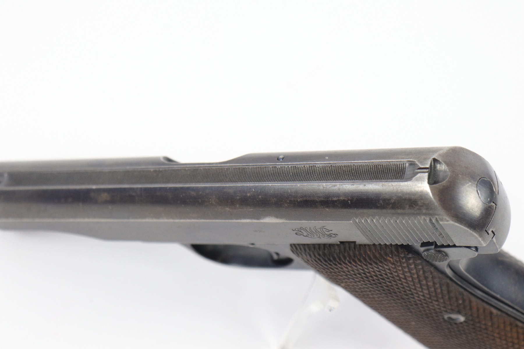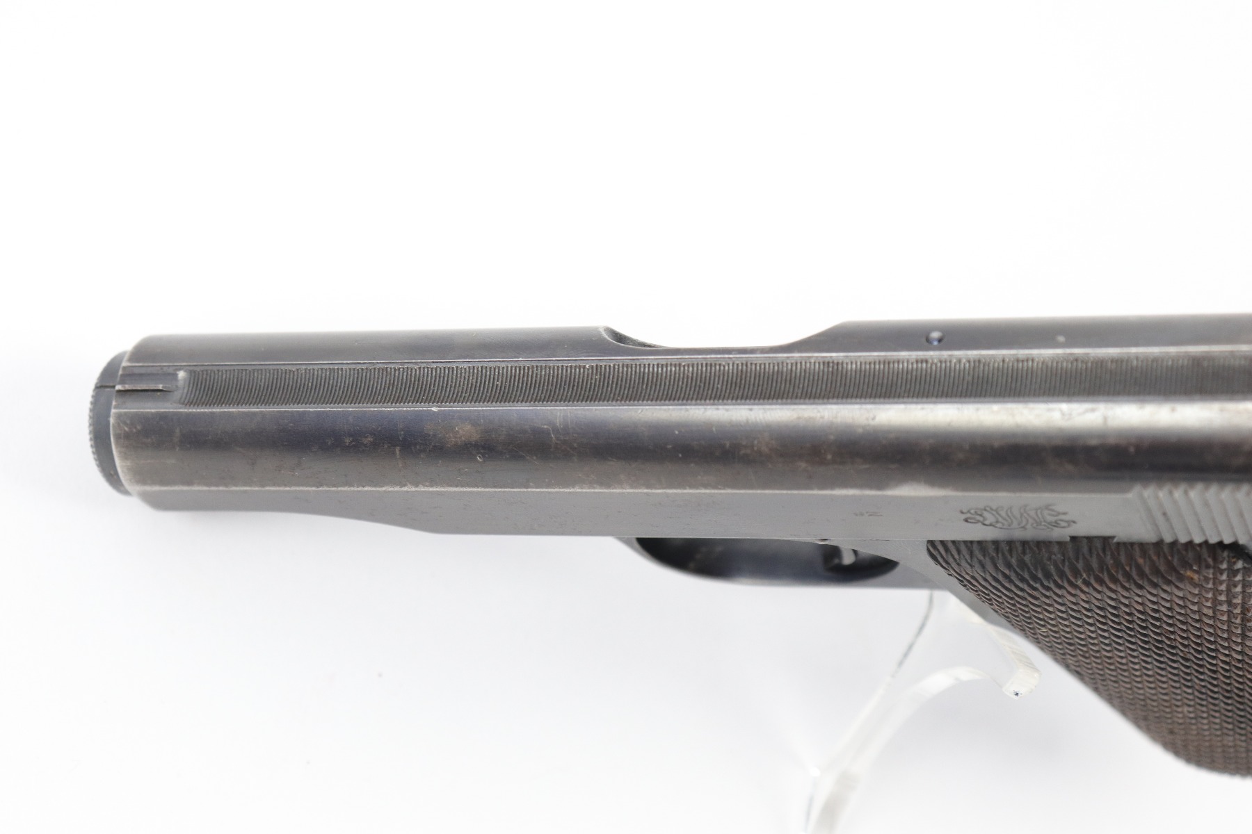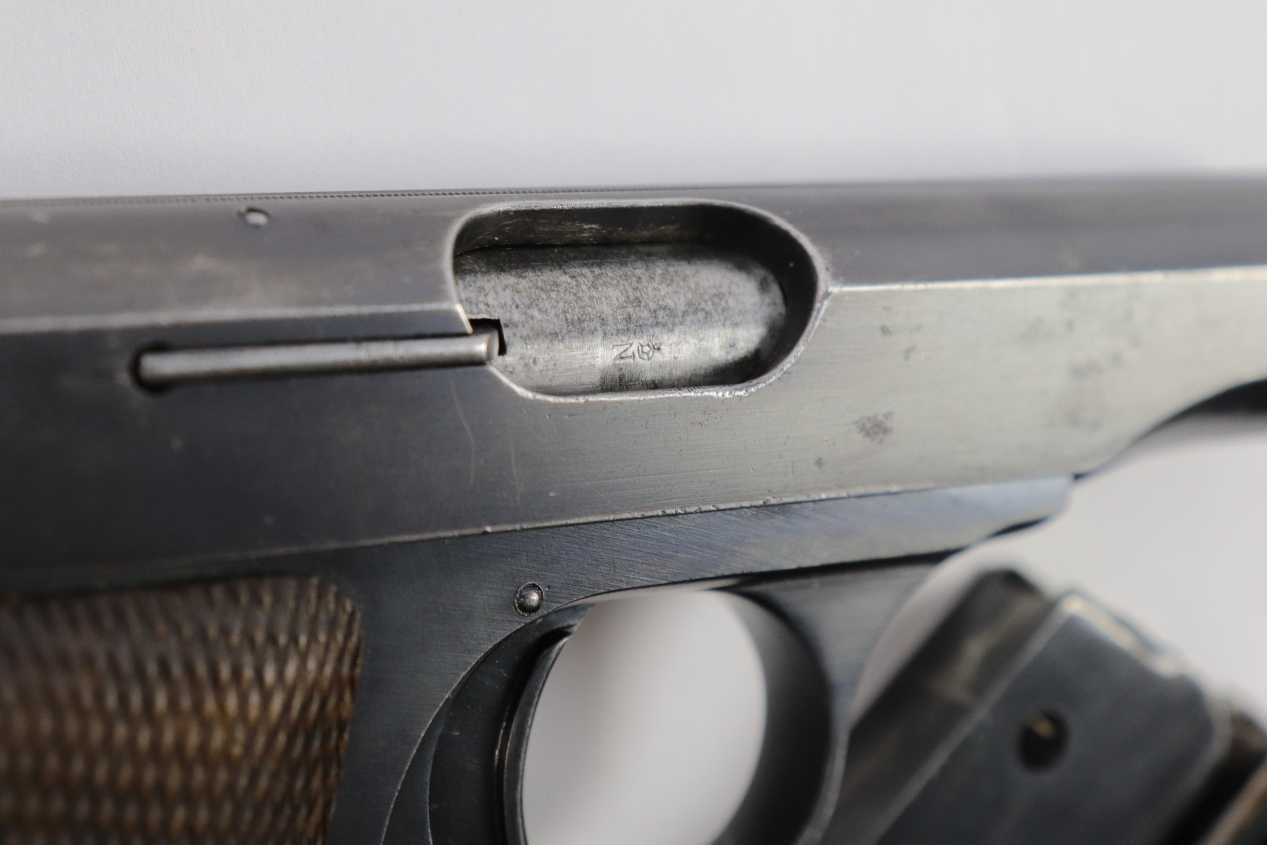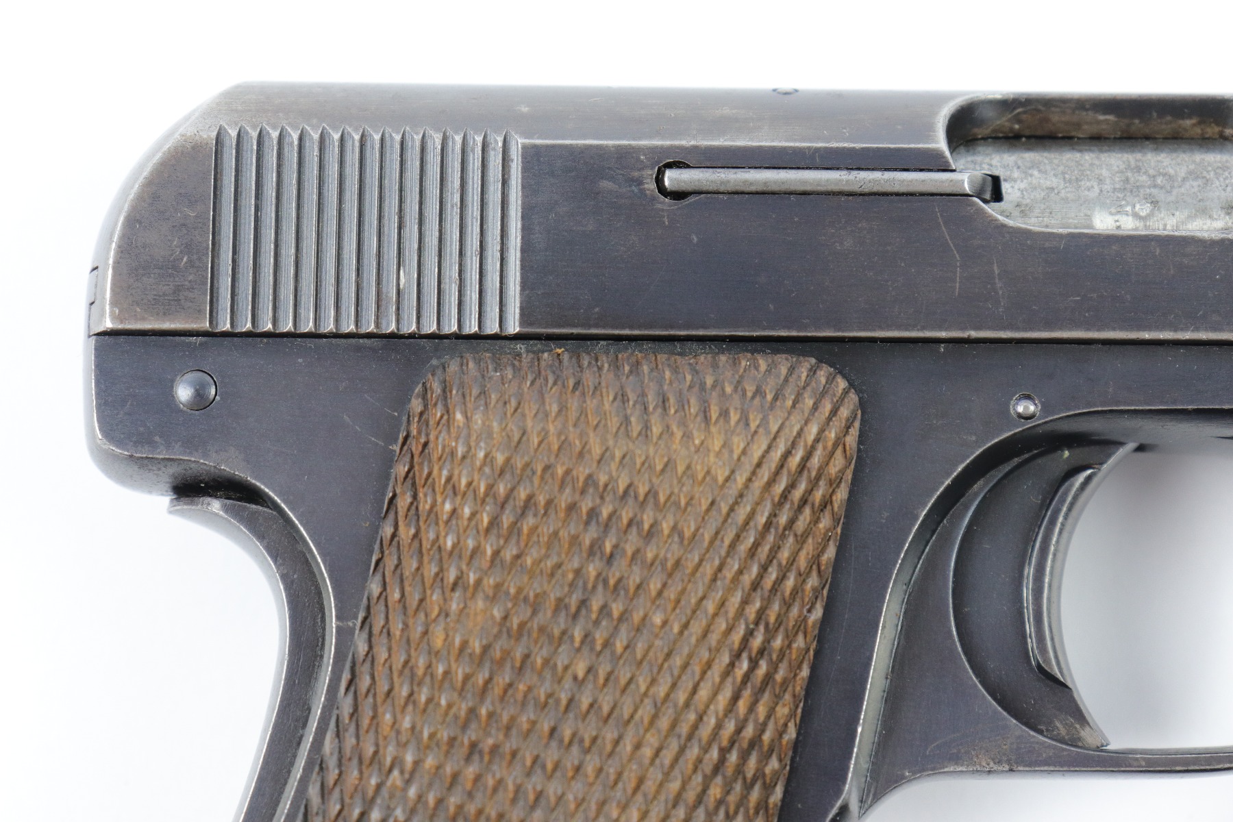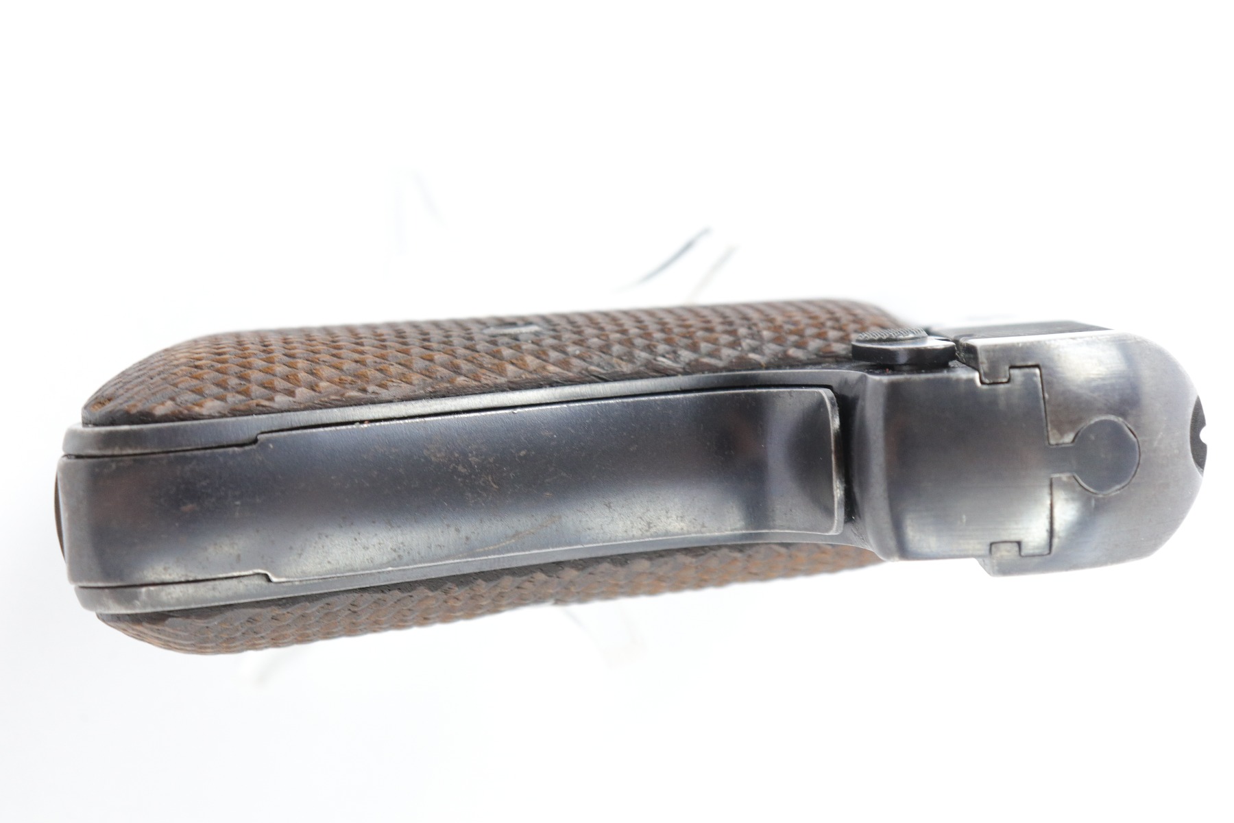 4/17/18 – This is a fairly rare DWM 7.65mm pistol manufactured between 1921 and 1931. With only around 40,000 produced total, DWM made this pistol and allegedly was sued by Browning for stealing their model 1910 patent. The pistol is a pretty unique piece of history made for commercial use. The pistol has honest wear throughout, as shown in photos. Most of the wear is light speckling on the blued finish, and edge wear on the slide. The front strap has some thinning as well as speckling, but overall the pistol is in great condition and fully functional with all original parts. The bore is very nice with nice lands and grooves, but there are a few minor signs of wear. The gun comes with 2 magazines (which are equally hard to find), and one of the magazines is stamped DWM. Very nice, unusual collector’s piece from DWM.