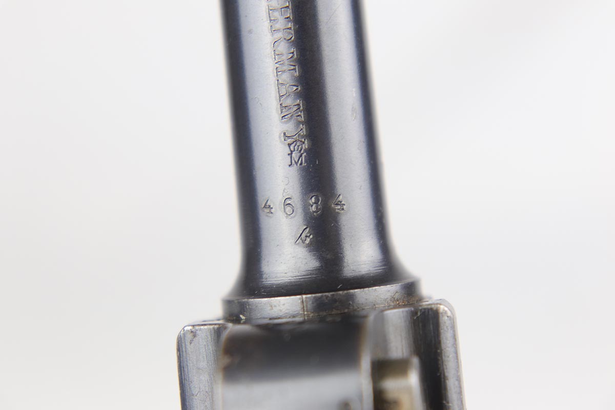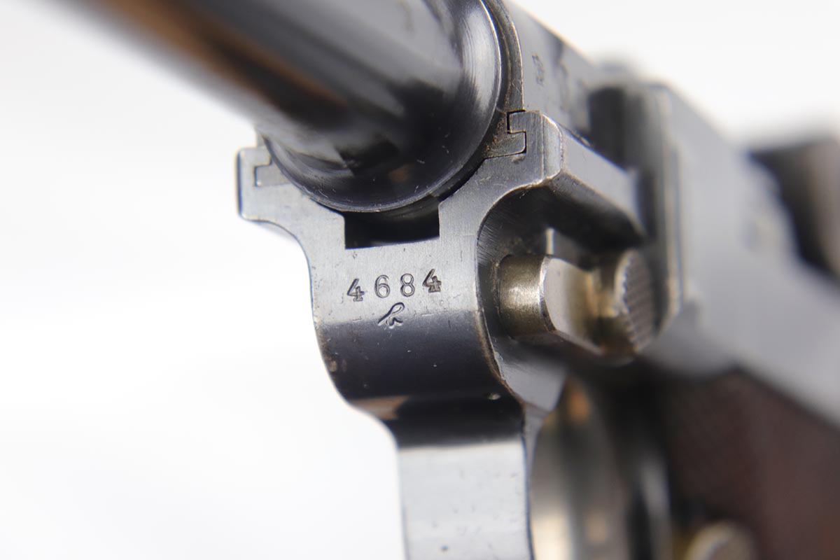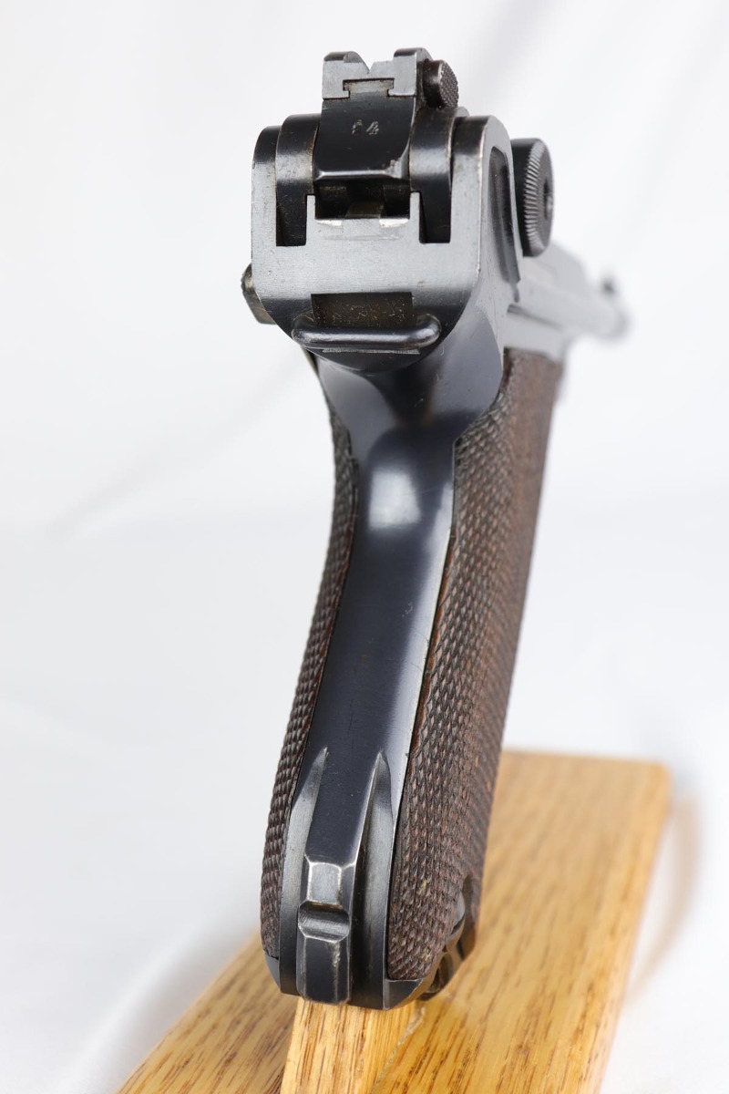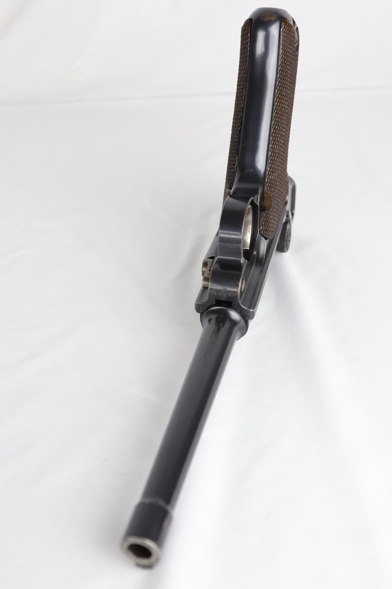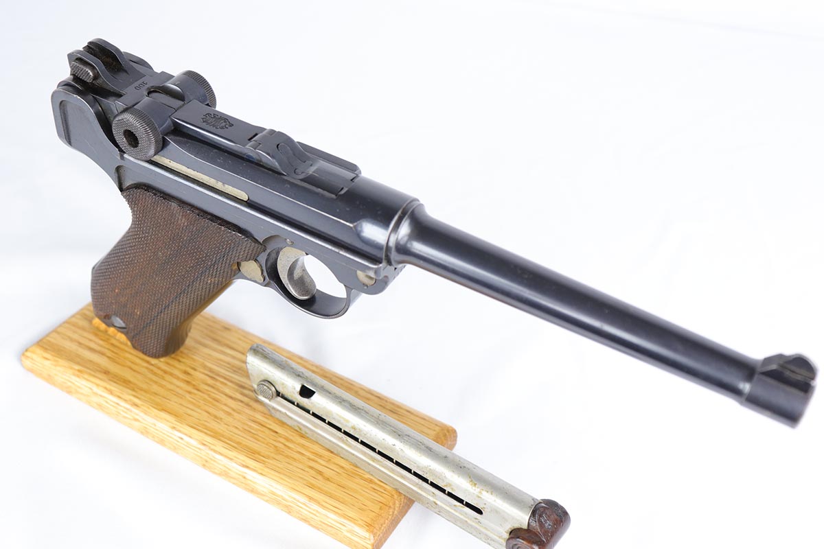 10/29/18 – This is a very nice example of a rare 1908 Variation Navy DWM Luger from the pre-WWI era. There were only an estimated 8,500 of this variation produced, all from serial 1044b-9505b. The 1908 variation has no chamber date and has also seen the grip safety removed. The finish on this pistol rates at 96-97% with most of the finish loss on the sideplate and muzzle, and a little more on the bottom of the front strap. Small parts still show some nice straw. Barrel is GERMANY marked to denote export. Adjustable rear side. Excellent grips that are numbered and matching to the pistol. The pistol has an original and hard to find Navy magazine that is numbered and matching to the gun. The gun is all matching, but the sideplate has been professionally re-numbered to match. Bore is shiny with strong rifling.