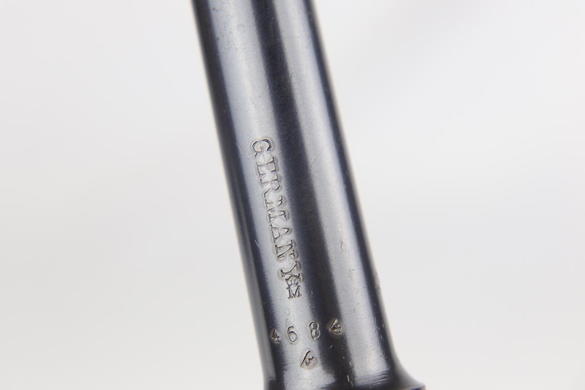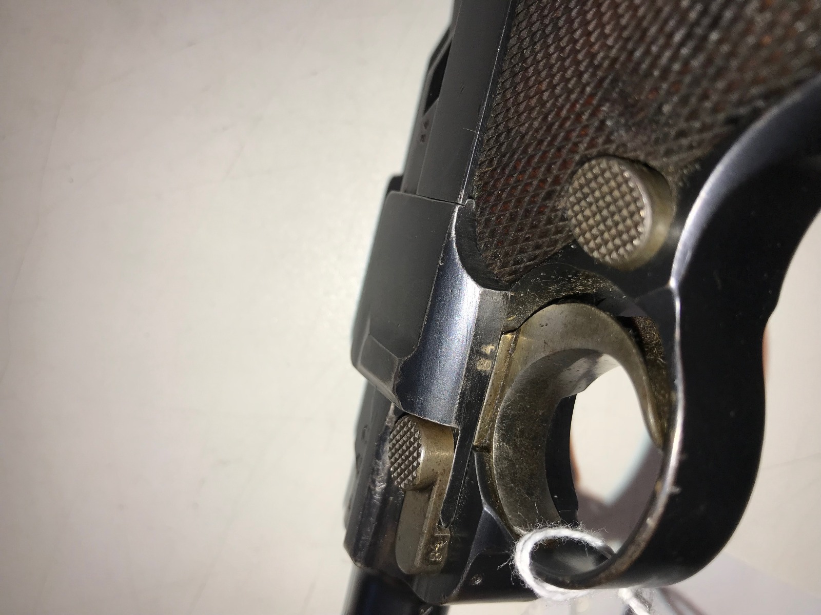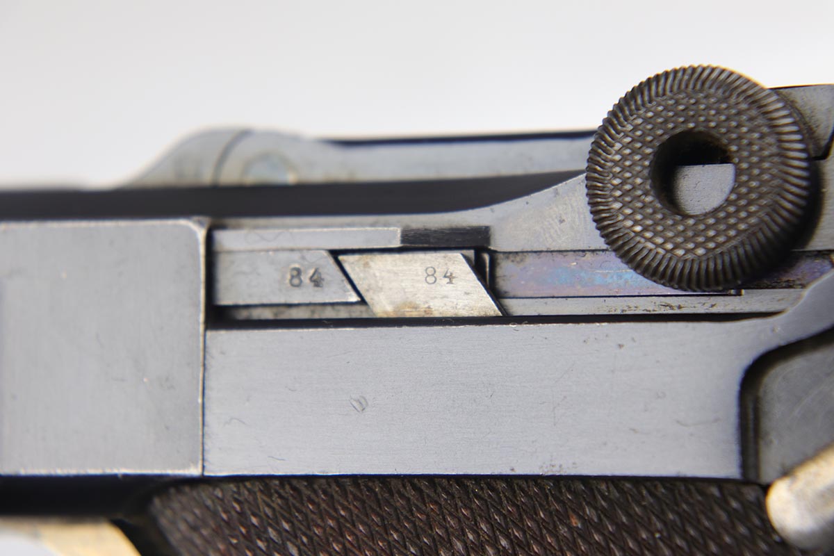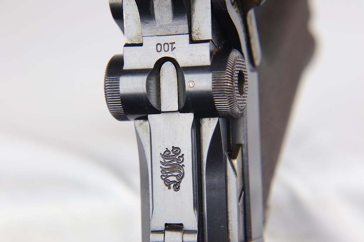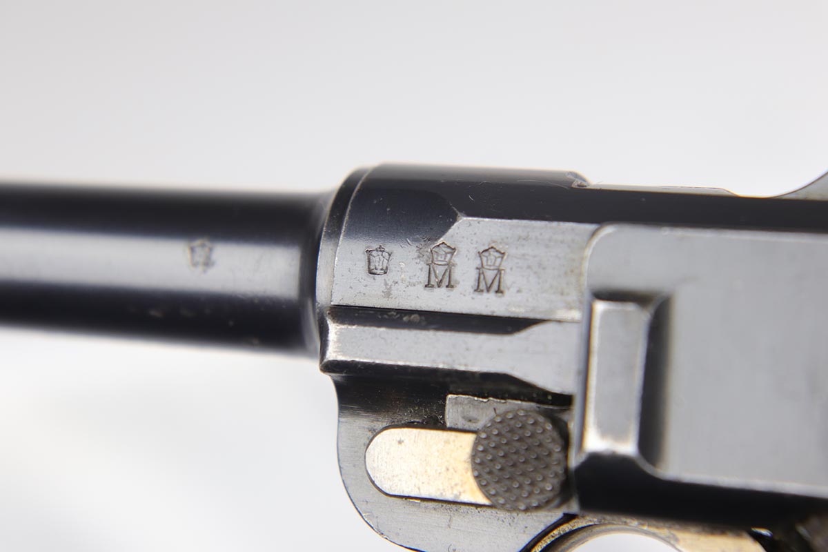 10/29/18 – This is a very nice example of a rare 1908 Variation Navy DWM Luger from the pre-WWI era. There were only an estimated 8,500 of this variation produced, all from serial 1044b-9505b. The 1908 variation has no chamber date and has also seen the grip safety removed. The finish on this pistol rates at 96-97% with most of the finish loss on the sideplate and muzzle, and a little more on the bottom of the front strap. Small parts still show some nice straw. Barrel is GERMANY marked to denote export. Adjustable rear side. Excellent grips that are numbered and matching to the pistol. The pistol has an original and hard to find Navy magazine that is numbered and matching to the gun. The gun is all matching, but the sideplate has been professionally re-numbered to match. Bore is shiny with strong rifling.
