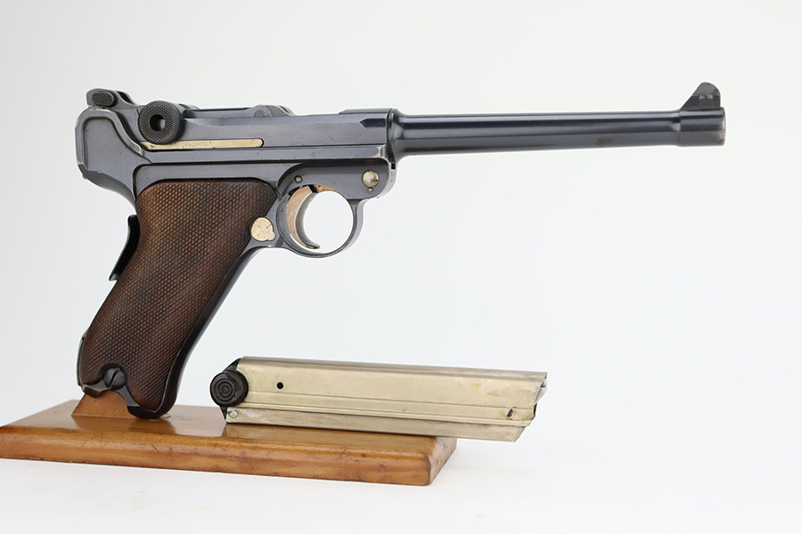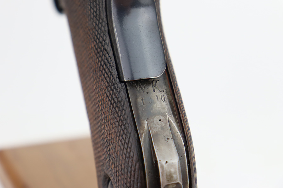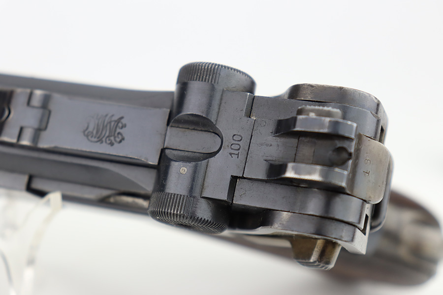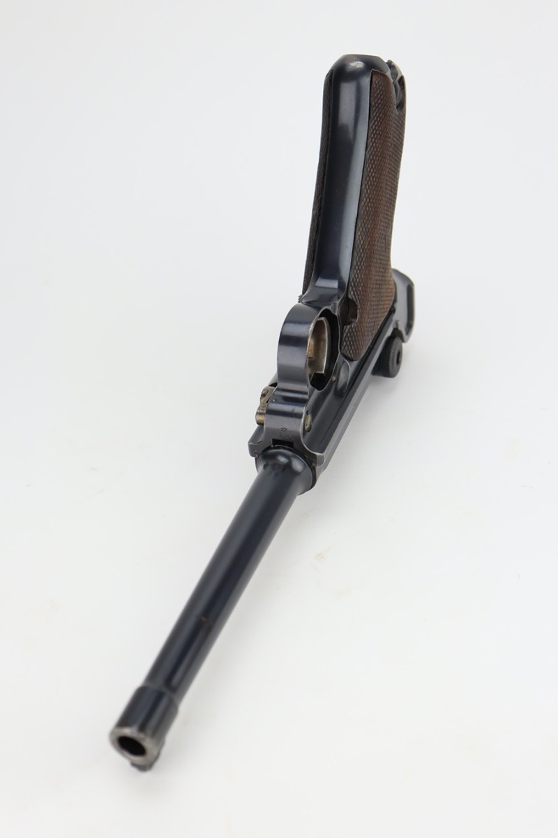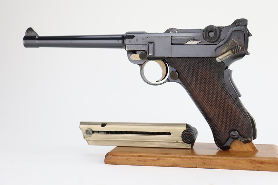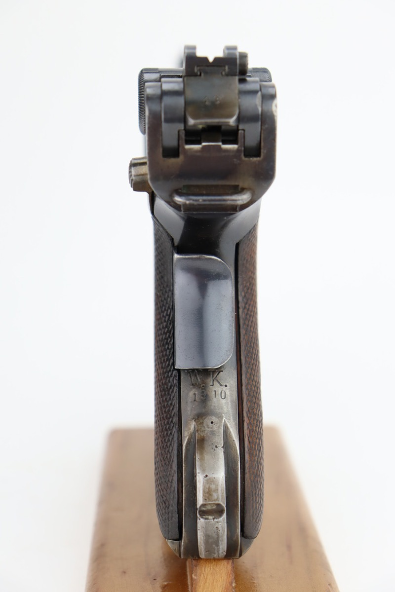 12/5/23 – This is a very nice DWM Navy Luger issued to the German Navy during WW1. All matching with the proper “Crown M” proofs throughout and a “W.K.1910” Navy unit marking on the back strap. Altered safety. The finish rates about 92%. The majority of the wear is at the base of the back strap, the rest of the gun is actually excellent. Fitted with very nice wood grips – the right is matching, but the numbering on the left is illegible. Comes with a mismatched magazine. The bore has good rifling with light pin-pricking throughout.