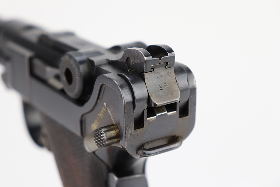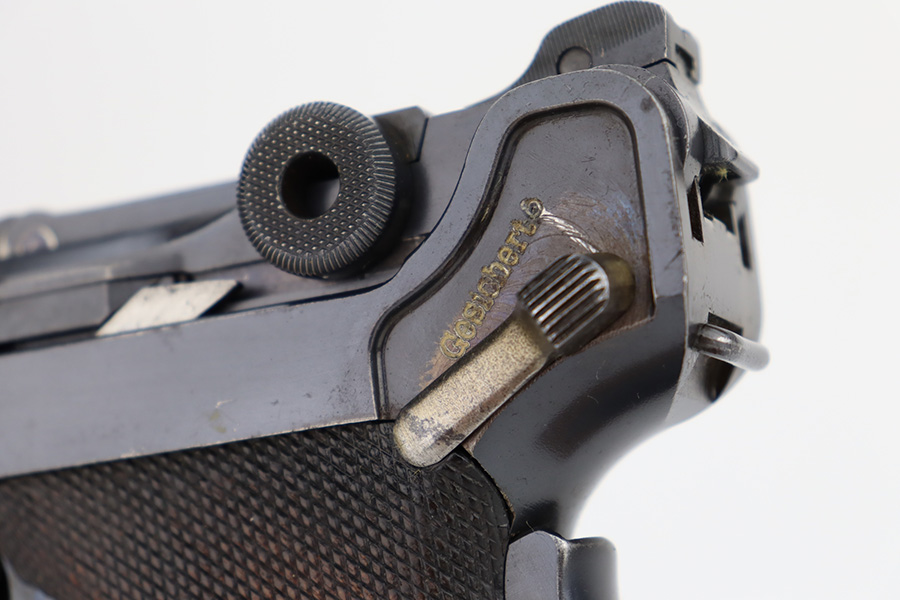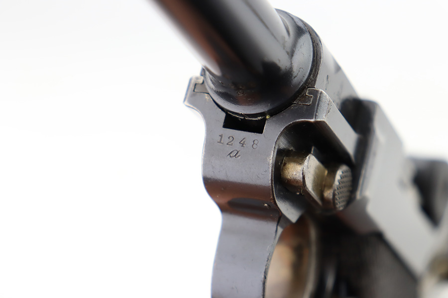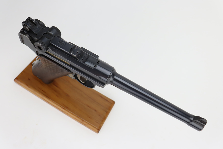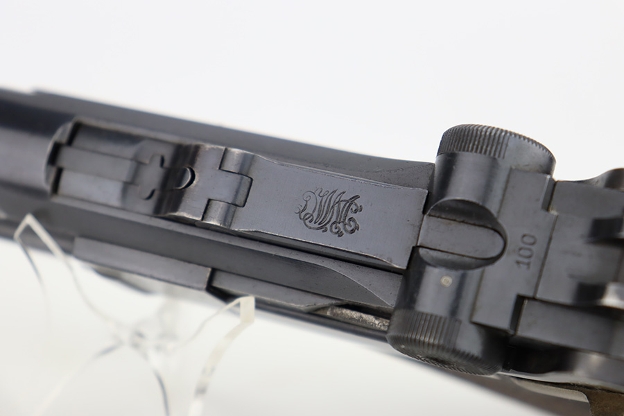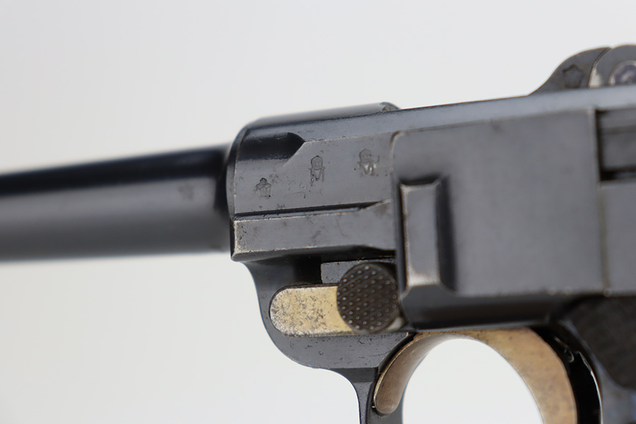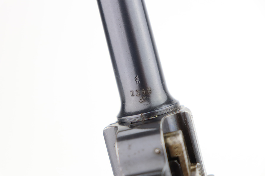 12/5/23 – This is a very nice DWM Navy Luger issued to the German Navy during WW1. All matching with the proper “Crown M” proofs throughout and a “W.K.1910” Navy unit marking on the back strap. Altered safety. The finish rates about 92%. The majority of the wear is at the base of the back strap, the rest of the gun is actually excellent. Fitted with very nice wood grips – the right is matching, but the numbering on the left is illegible. Comes with a mismatched magazine. The bore has good rifling with light pin-pricking throughout.