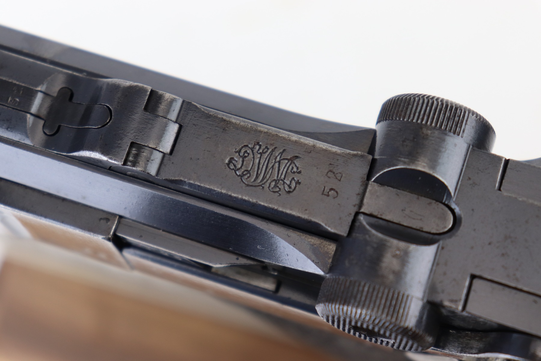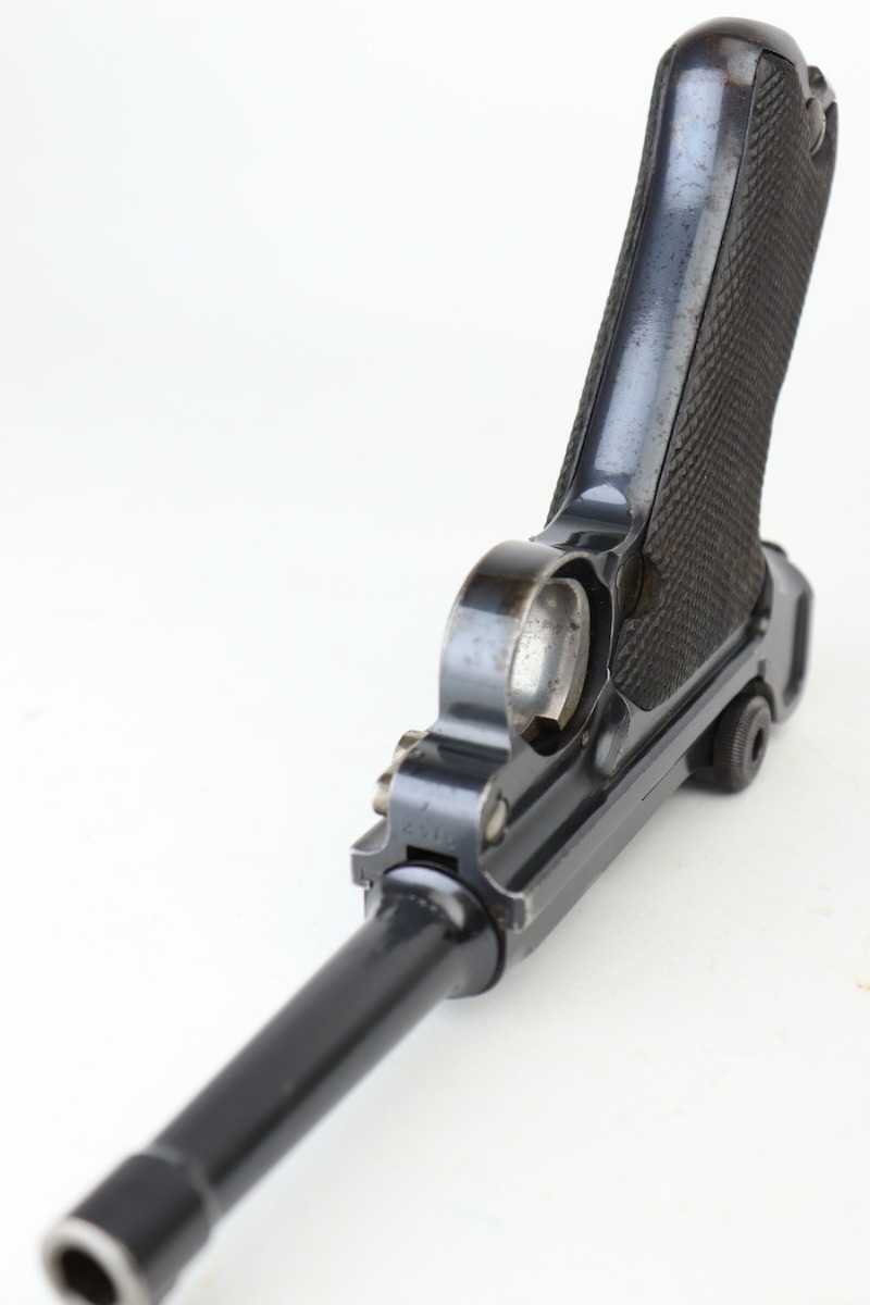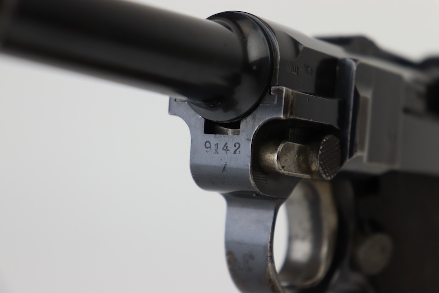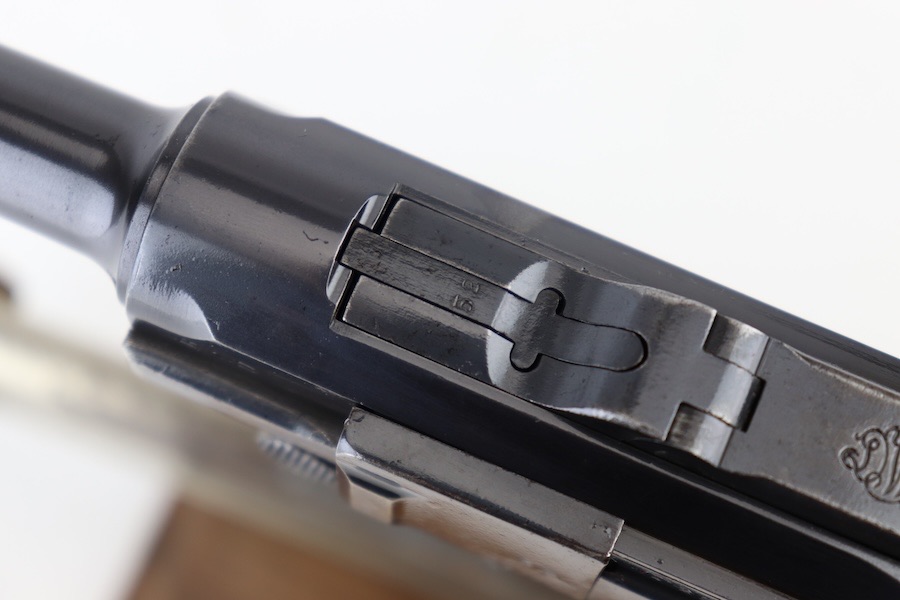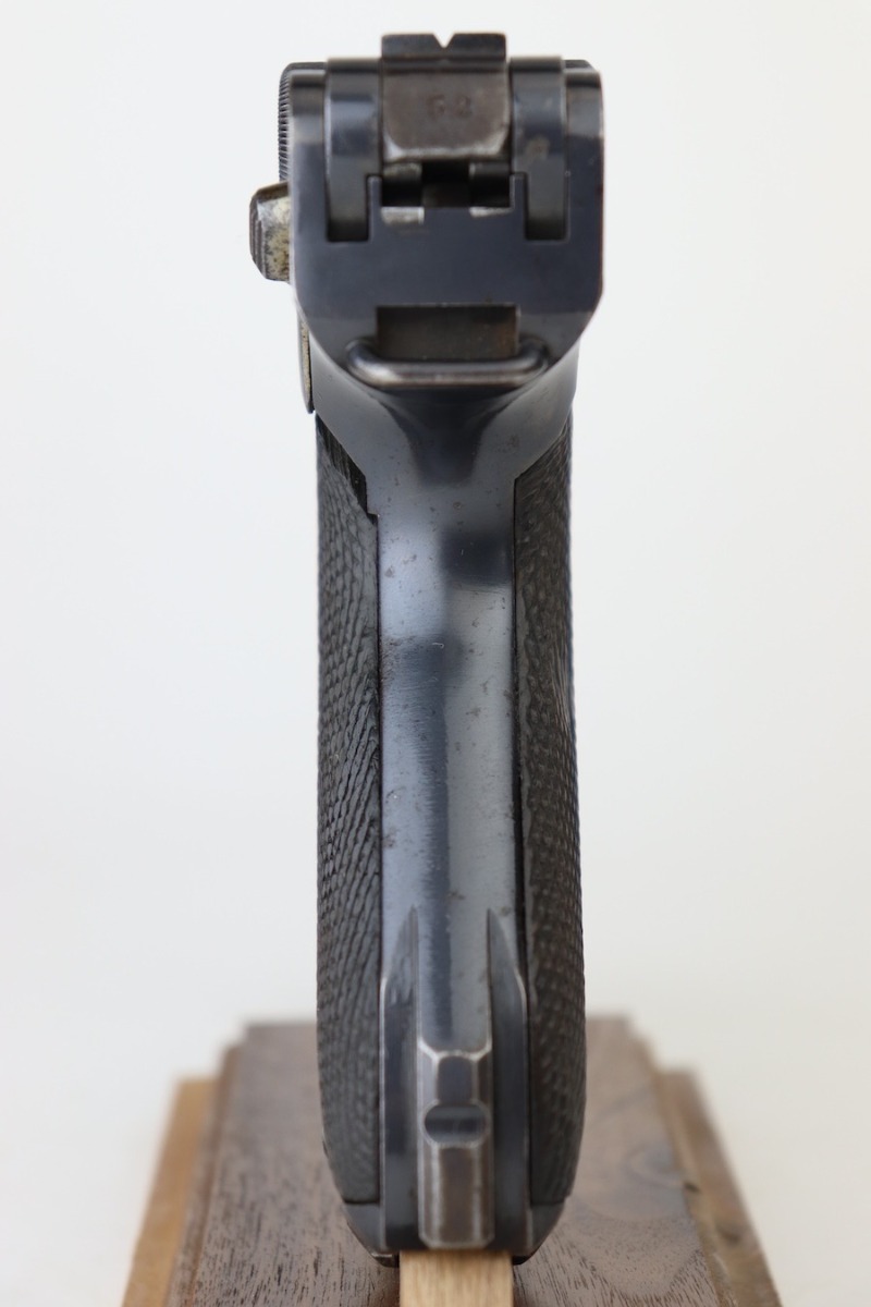 10/4/23 – This is a nice example of a DWM P.08 Luger. It has retained roughly 88-90% of its finish. There is slight finish loss under the trigger guard and minor wear around the muzzle and on the front edges of the frame. Fitted with brown wood grips and period correct but nonmatching magazine. The bore has pitting and somewhat smoothed-out rifling 6.5/10. Safety works correctly. Parts that are matching to the gun are the trigger, side plate, safety bar, and takedown lever. Toggle assembly is all non matching.