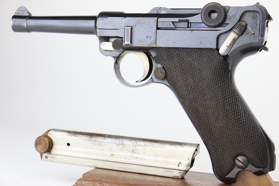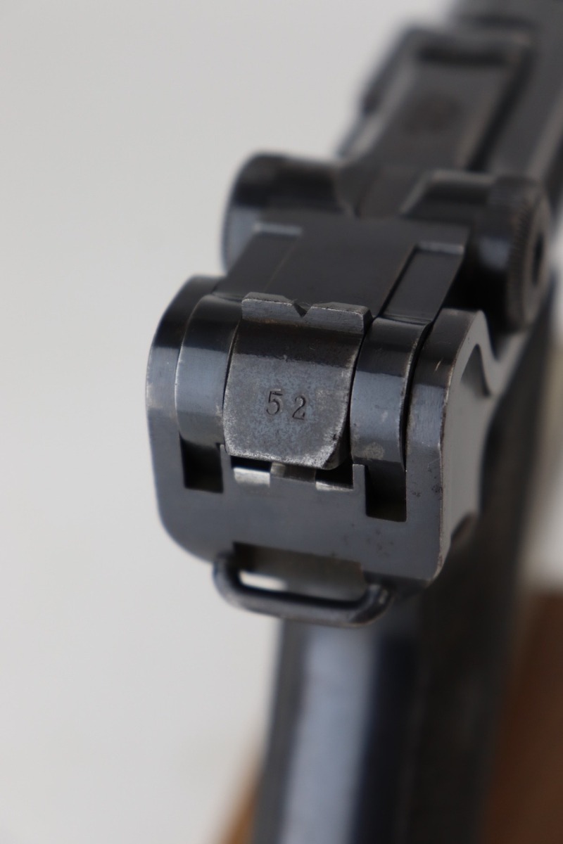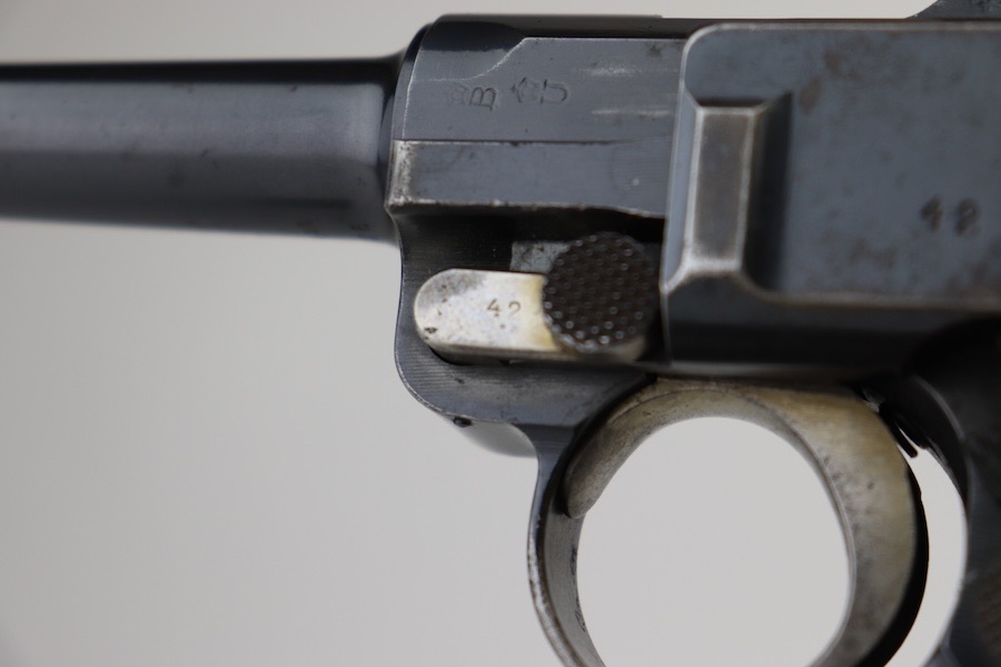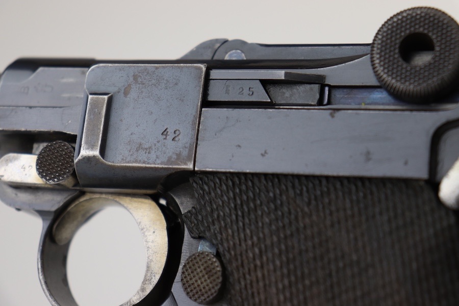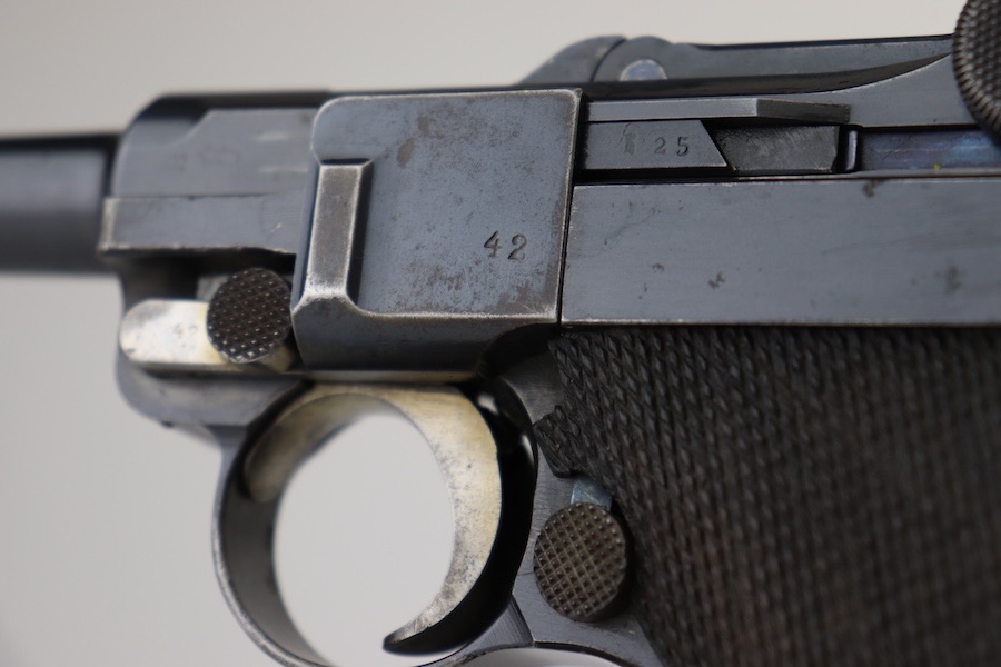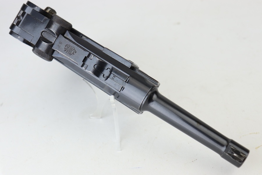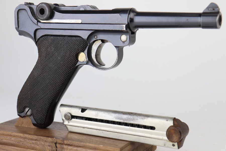 10/4/23 – This is a nice example of a DWM P.08 Luger. It has retained roughly 88-90% of its finish. There is slight finish loss under the trigger guard and minor wear around the muzzle and on the front edges of the frame. Fitted with brown wood grips and period correct but nonmatching magazine. The bore has pitting and somewhat smoothed-out rifling 6.5/10. Safety works correctly. Parts that are matching to the gun are the trigger, side plate, safety bar, and takedown lever. Toggle assembly is all non matching.