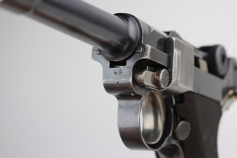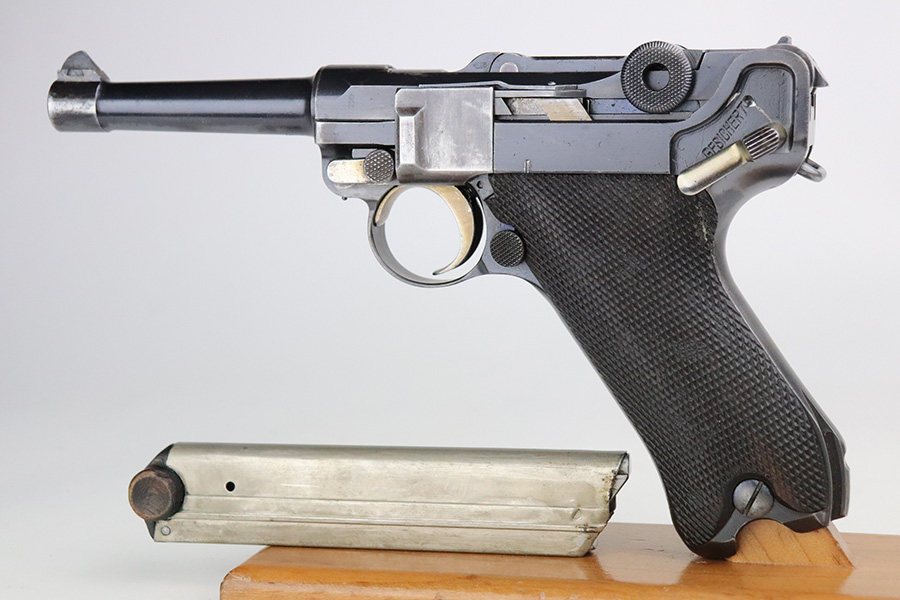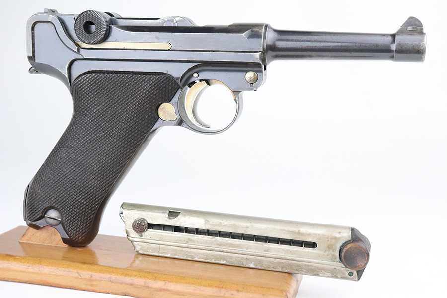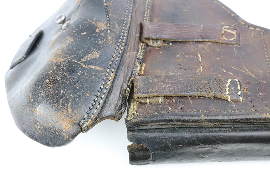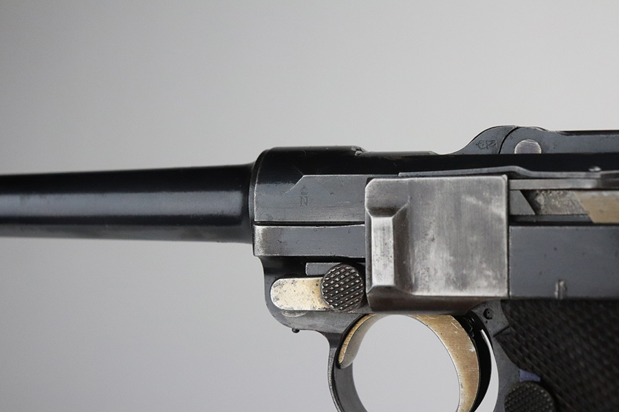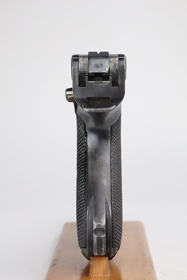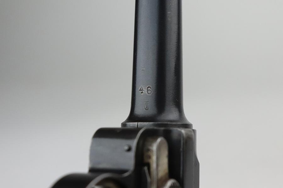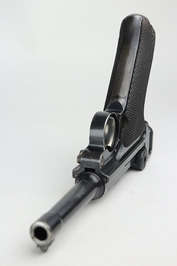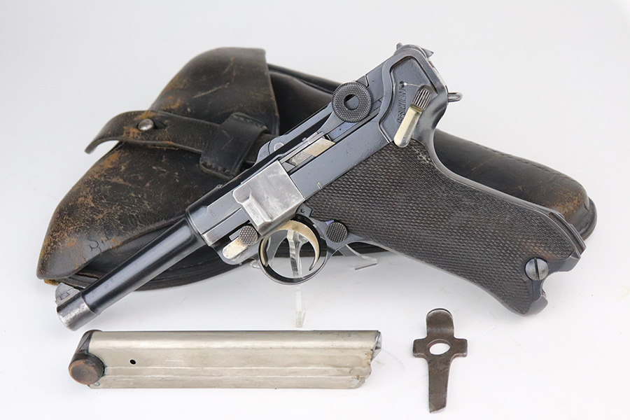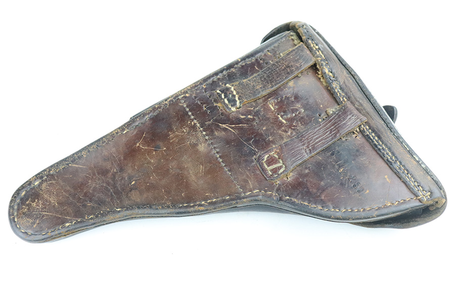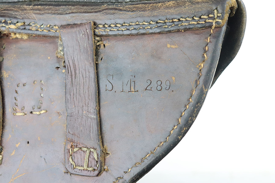 7/27/21 – This is a nice example of a 1920’s commercial DWM Luger rig that was diverted to the German Police force. It is all matching, has no chamber date, has the proper “Crown N” commercial proofs, has an added police sear safety, an added police magazine safety (still intact), and a “S. Mi. 289” police unit marking on the front strap. The rig comes with a period-correct mismatched magazine. a worn 1917-dated holster with a matching police unit marking, and a matching luger tool. The belt loops on the holster have been modified and almost all of the stitching on the closure strap has come out. The top flap is also starting to separate from the main body of the holster. The gun has retained roughly 75% of its finish. Most of the finish loss is on the front strap and side plate. There are also areas of wear on the side rails, chamber, around the muzzle, and back strap. Spotty oxidation here and there. Comes with a nice set of wood grips – small repaired chip in the left panel. The bore is very nice – shiny with good rifling.