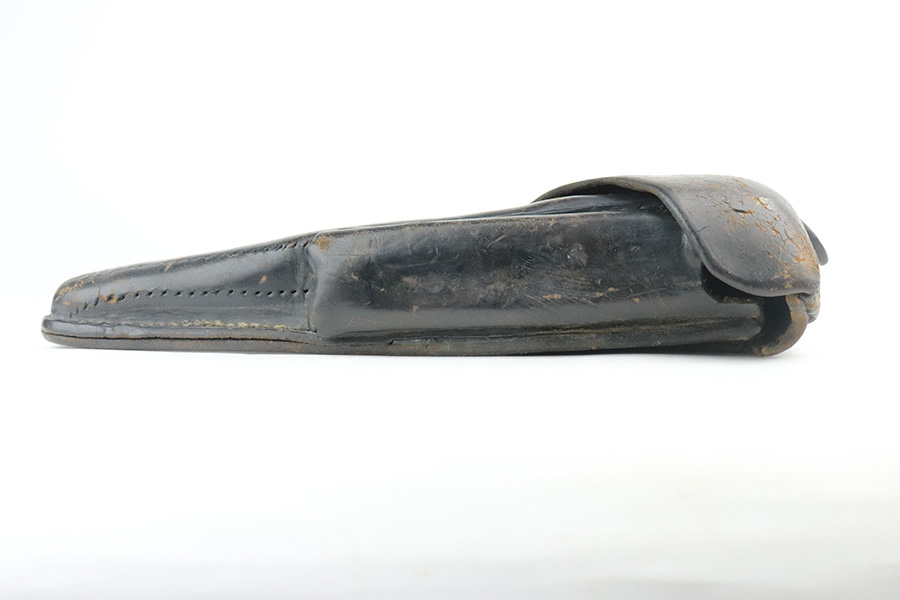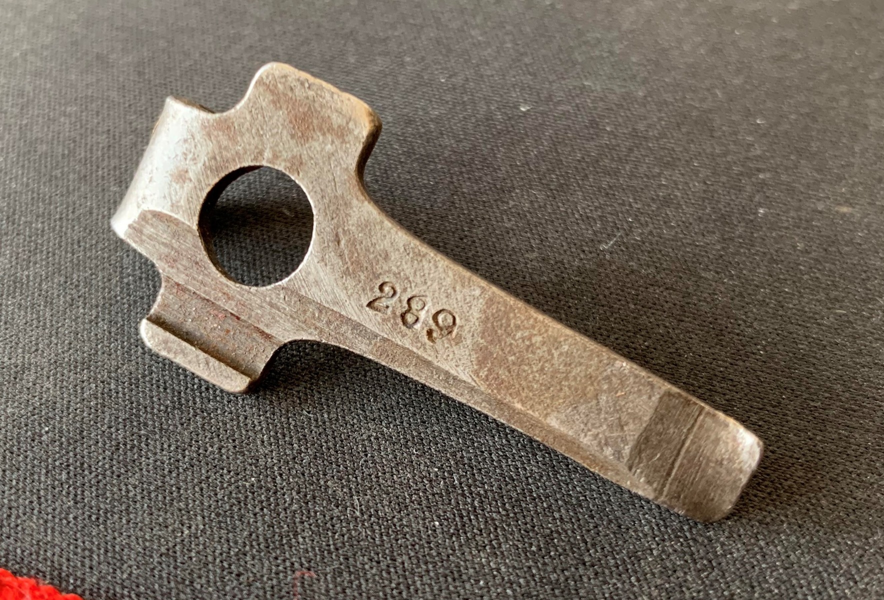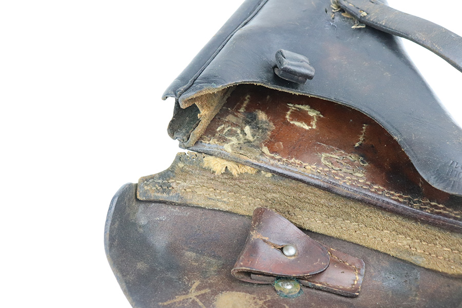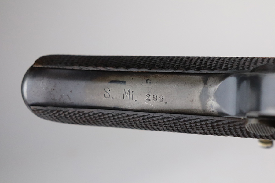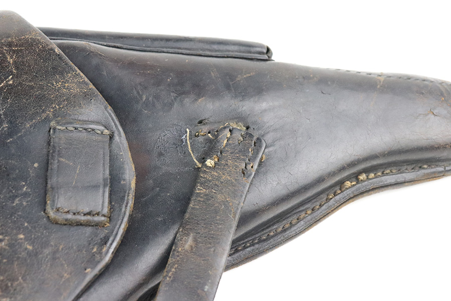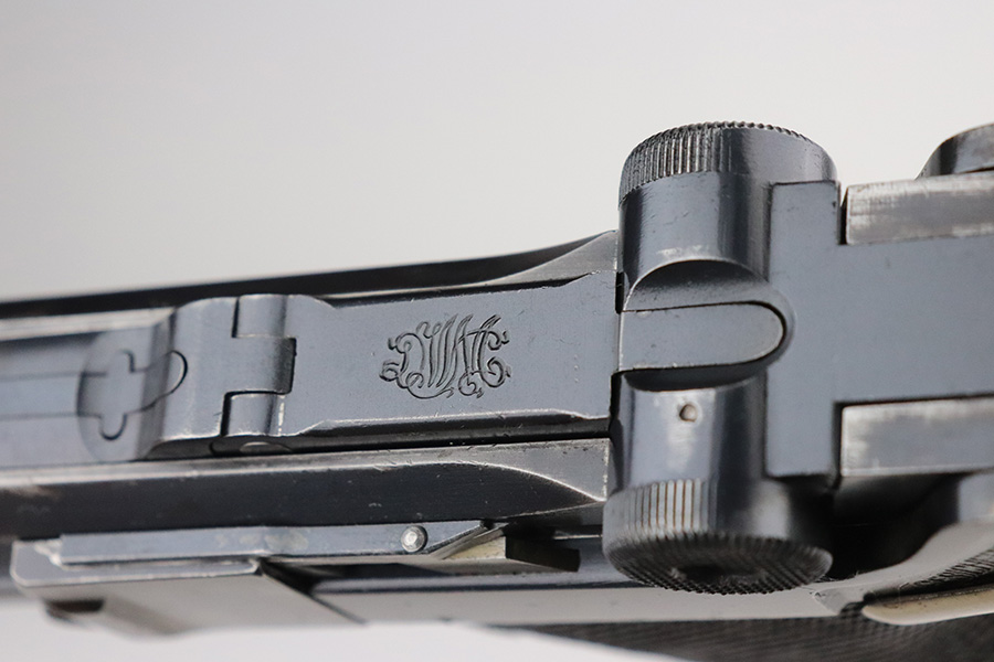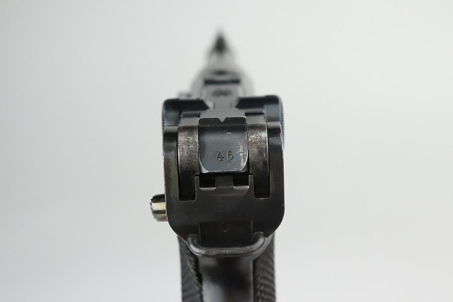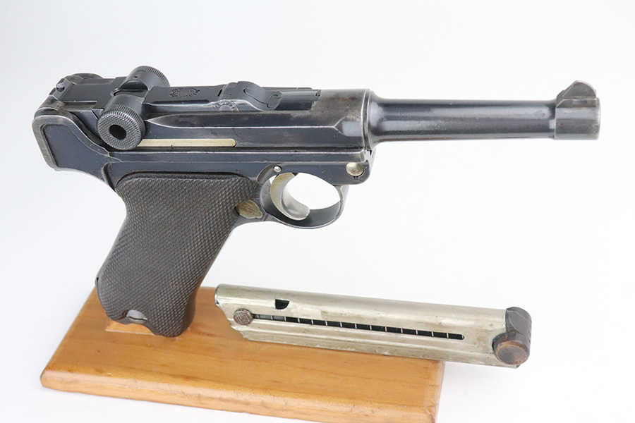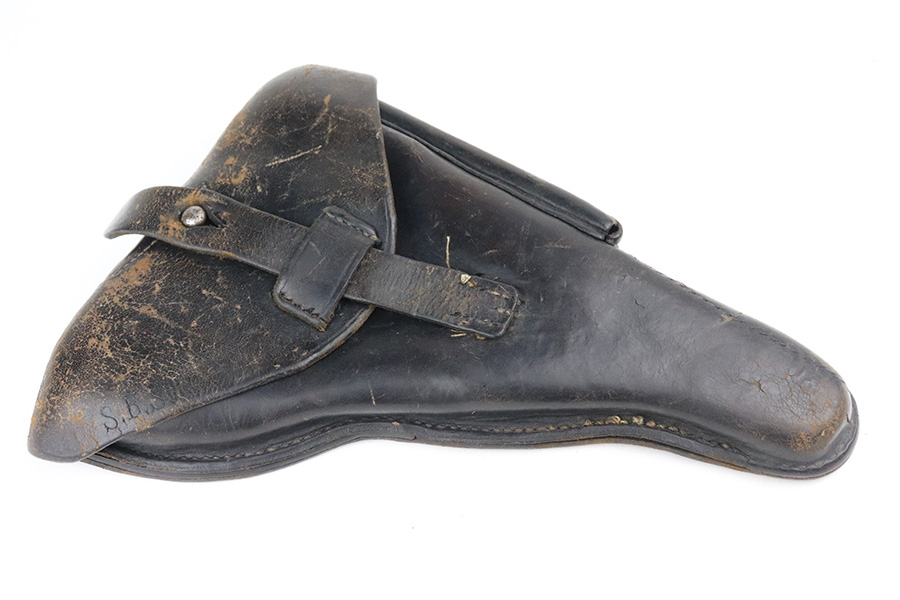 7/27/21 – This is a nice example of a 1920’s commercial DWM Luger rig that was diverted to the German Police force. It is all matching, has no chamber date, has the proper “Crown N” commercial proofs, has an added police sear safety, an added police magazine safety (still intact), and a “S. Mi. 289” police unit marking on the front strap. The rig comes with a period-correct mismatched magazine. a worn 1917-dated holster with a matching police unit marking, and a matching luger tool. The belt loops on the holster have been modified and almost all of the stitching on the closure strap has come out. The top flap is also starting to separate from the main body of the holster. The gun has retained roughly 75% of its finish. Most of the finish loss is on the front strap and side plate. There are also areas of wear on the side rails, chamber, around the muzzle, and back strap. Spotty oxidation here and there. Comes with a nice set of wood grips – small repaired chip in the left panel. The bore is very nice – shiny with good rifling.