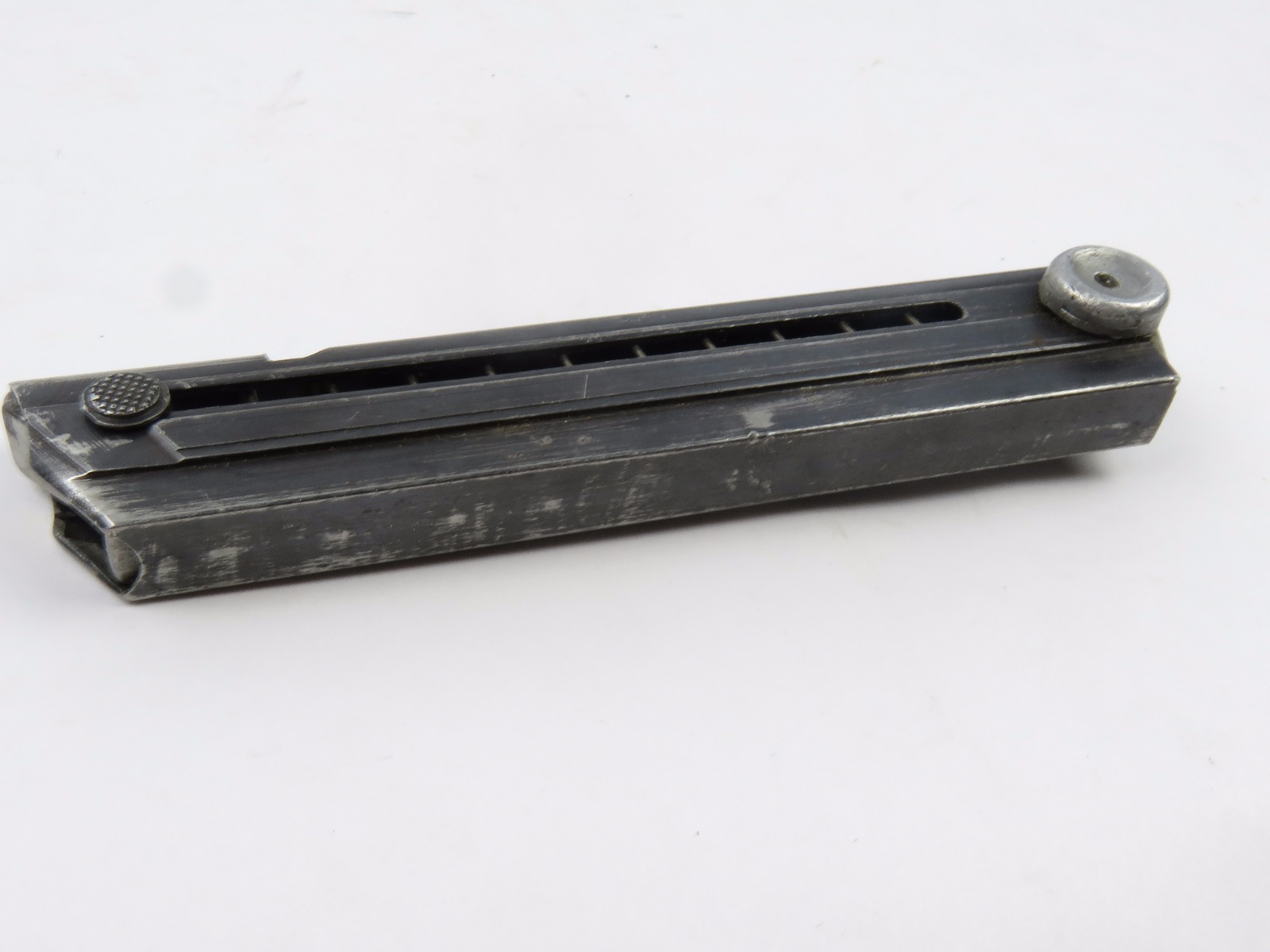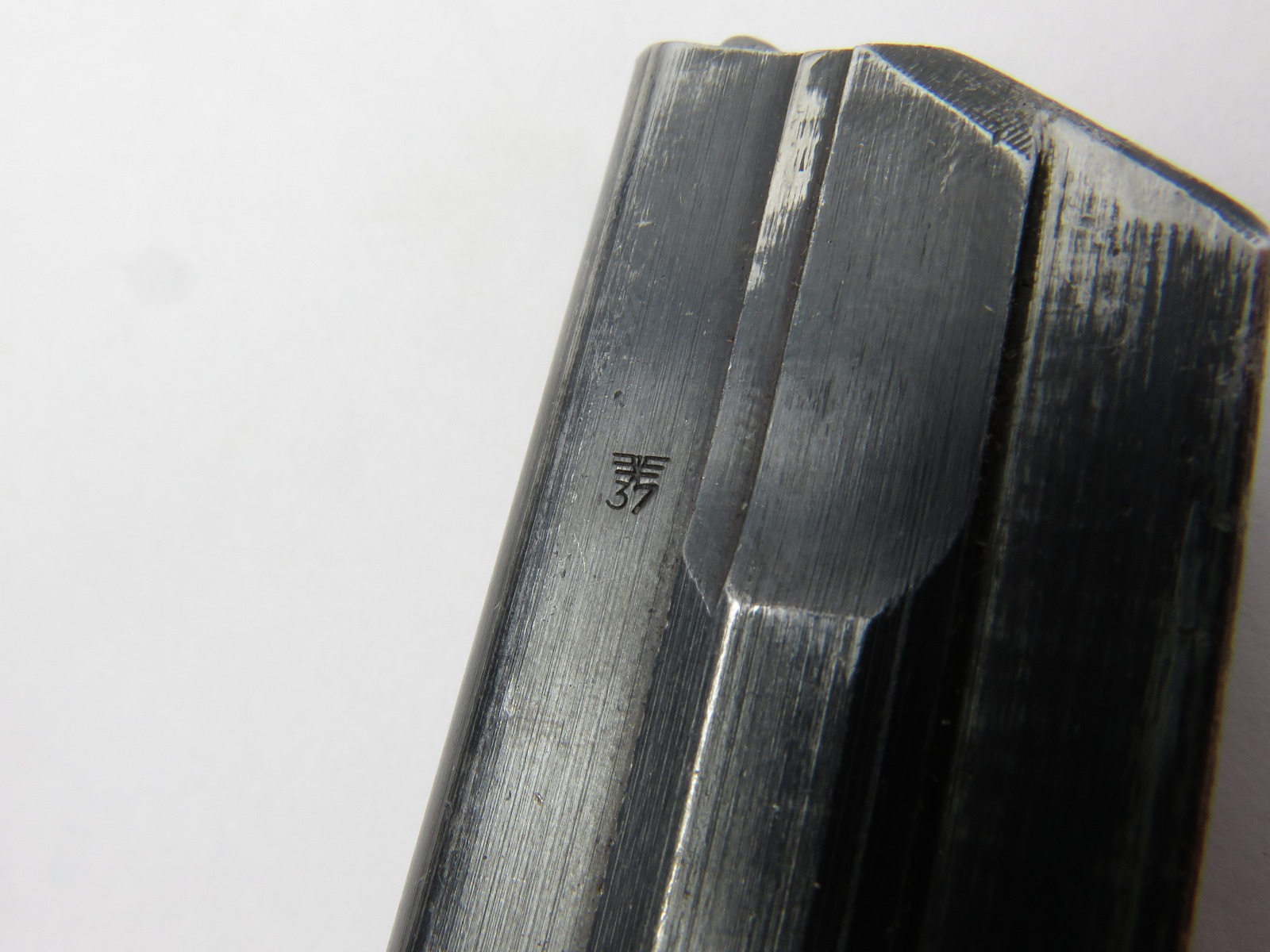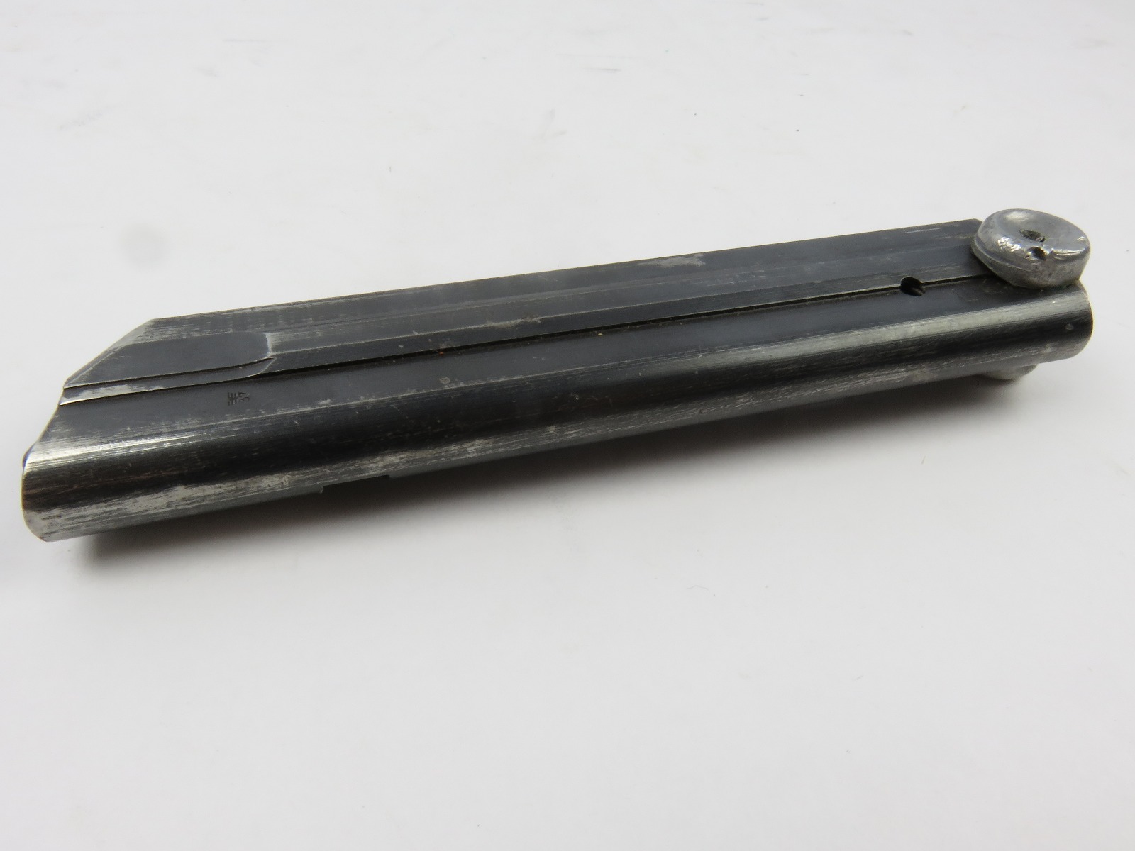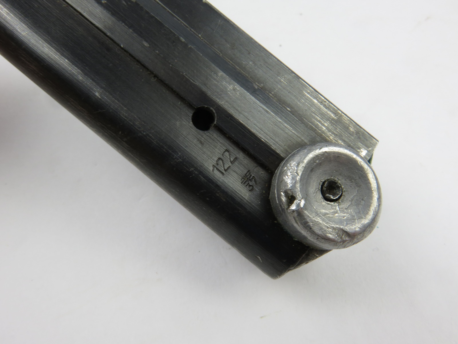 7/26/17 – This is an original WW2 era production Mauser Luger magazine. This magazine is an unusual variation, with eagle/37 military proof stamps on both the frame and base of the magazine. There are two eagl/37 proofs, along with a “122” code on the left side of the frame. The base is stamped with one eagle/37 proof and a serial number. The base and serial number look like they were ground down slightly or someone might have tried to alter the base, but then gave up. This is because the numbering looks all original and authentic, but there is some uneveness to the base. The three digit serial is correct for this variation, along with the plus sign. The magazine frame has minimal wear, with no rust or pitting and the spring is fully functional. Guaranteed original.